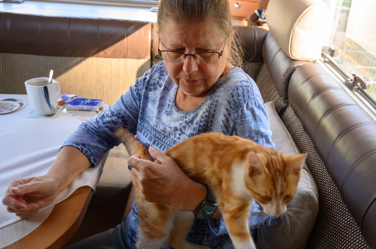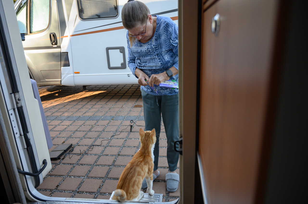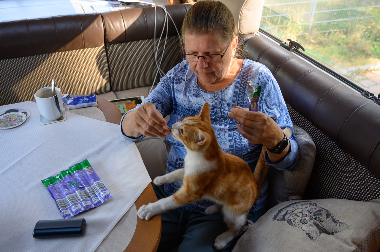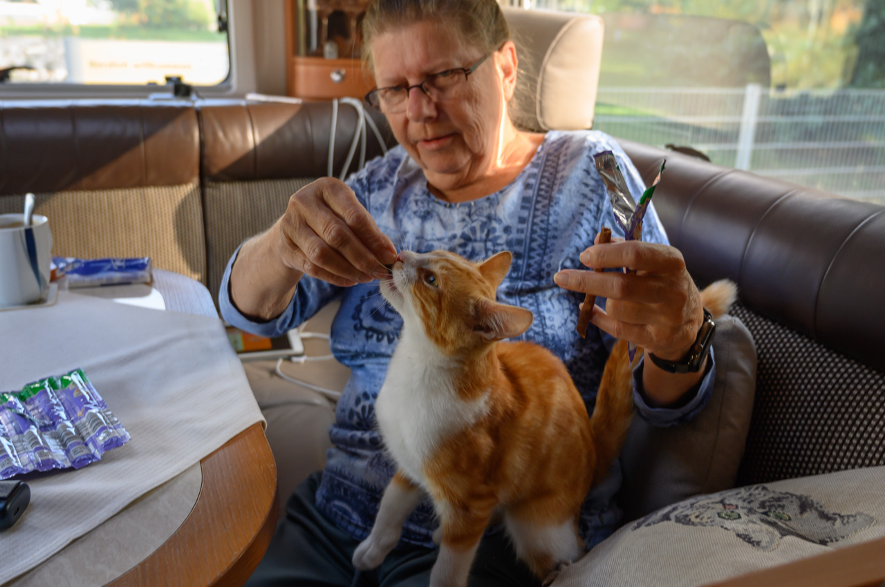 Gegen 11:30 Uhr haben wir uns wieder auf unseren NIU gesetzt, dieses Mal mit dem Ziel der roten Steine bzw. des roten Ufers. Diese Felswand ist eigentlich eine übrig gebliebene Halde aus dem Abbau von Alaun zwischen 1557 und 1886. Kurioserweise deklariert Wikipedia das rote Ufer als POI und auch die Gemeinde. Google kennt aber kein rotes Ufer und auch keine roten Steine. Also habe ich für das Navi den nächstliegenden Ort eingegeben. Sehr zur Freude von Susanne, schickte uns das Navi das erste Stück des Weges auf einer Schotterstraße entlang. Wir haben den NIU in Schwerz abgestellt und sind einem Wanderschild gefolgt. Da an dem Schild aber zwei Wege abgingen, haben wir treffsicher den falschen Weg gewählt. Allerdings führte der uns in schönste Landschaft und zu mindestens landeten wir an der Mulde. Wir mussten nun noch ein ganzes Stück an der Mulde entlanglaufen. Aber wir haben dann endlich die Felsenwand vor uns gehabt. Die Drohne hier steigen zu lassen war nicht ganz einfach, weil es hier nur Wiese gab mit ziemlich hohen Grasbewuchs. Die Tasche der Drohne war die einzige Möglichkeit, aber etwas zu klein. Das Aufsteigen habe ich noch gerade so hinbekommen, komplizierter war das Landen. Das war das erste Mal, dass die Drohne auf meiner Hand gelandet ist bzw. ich sie in der Luft stehend von unten gegriffen habe. Die Aufnahmen von der roten Felswand sind trotzdem sehr schön geworden. Für den Rückweg zum NIU hat Susanne auf ihrem Handy einen kürzeren Weg gefunden. Das Navi vom NIU wollte uns dann auf dem Weg zum Womo wieder über den Schotterweg schicken. Ich bin einfach an dem Weg vorbeigefahren. Das Navi wollten uns nun aber immer wenden lassen. Offensichtlich gab es keine vernünftige Alternative. Also haben wir uns entschieden, doch das Stück Schotterweg in Kauf zu nehmen. Kurz bevor wir das Womo erreicht haben, trafen wir Leute mit der Katze auf dem Arm. Wir haben erfahren, dass die Katze bis vor kurzem im Schwimmbad lebte. Die Besitzer aber jetzt ein Stück weiter wohnen. Tschüss Katze, war nett dich kennengelernt zu haben. Das war nun unser letzter Tag auf dieser Tour.