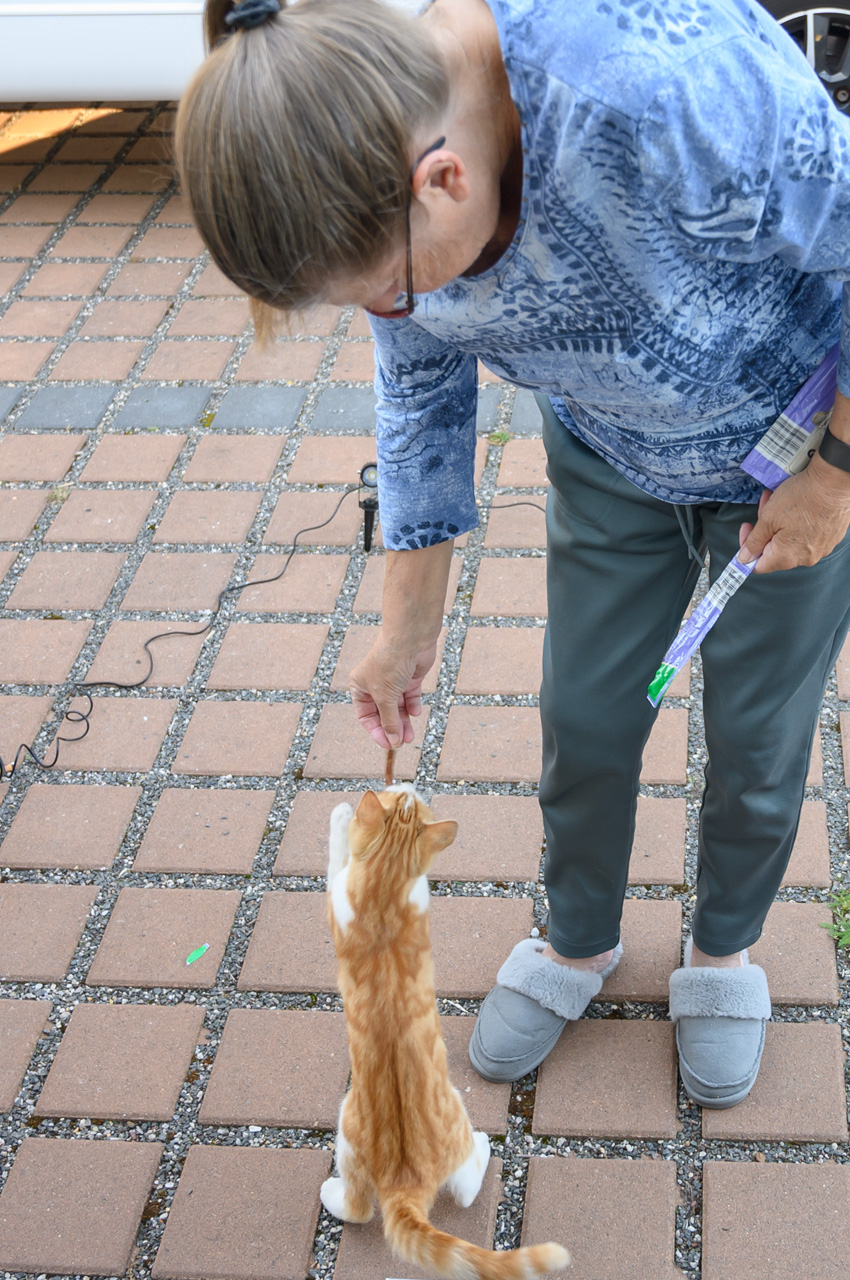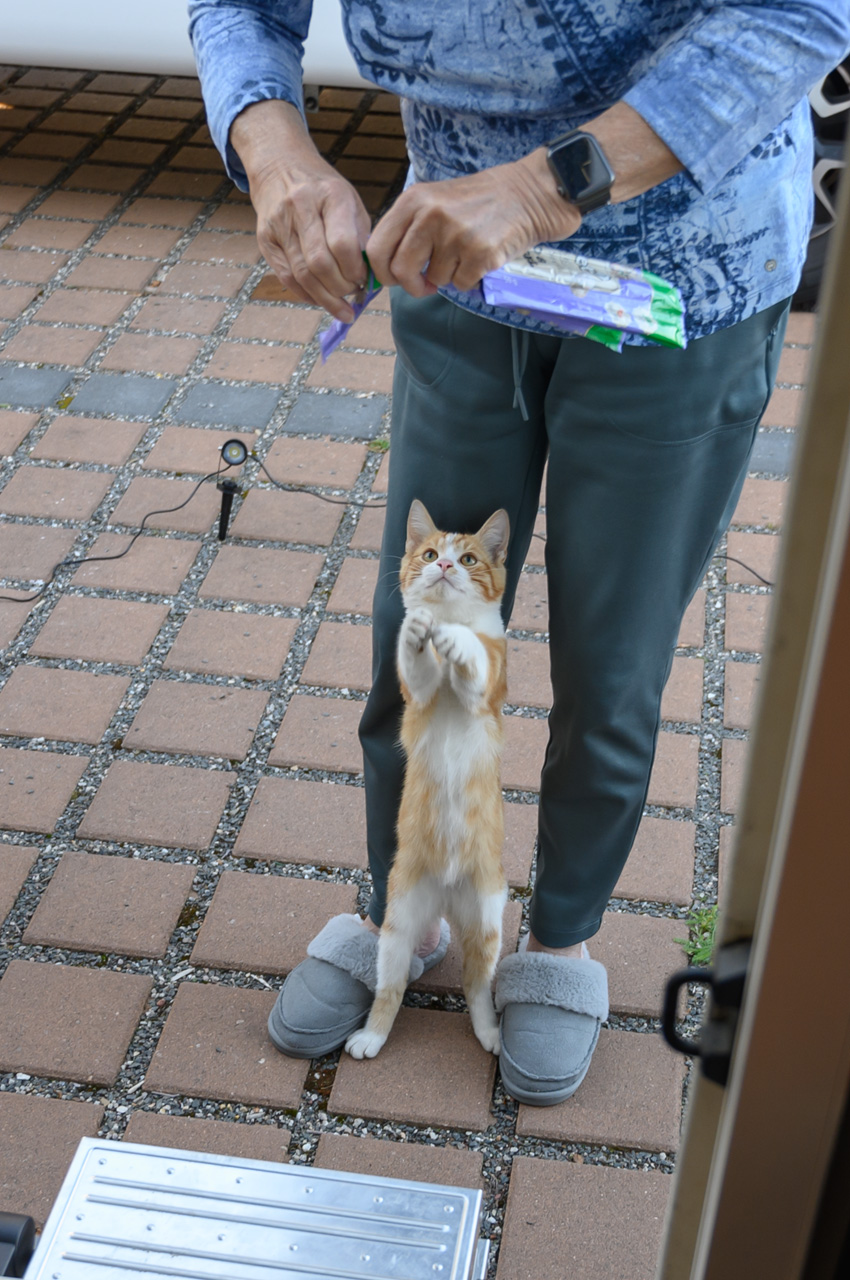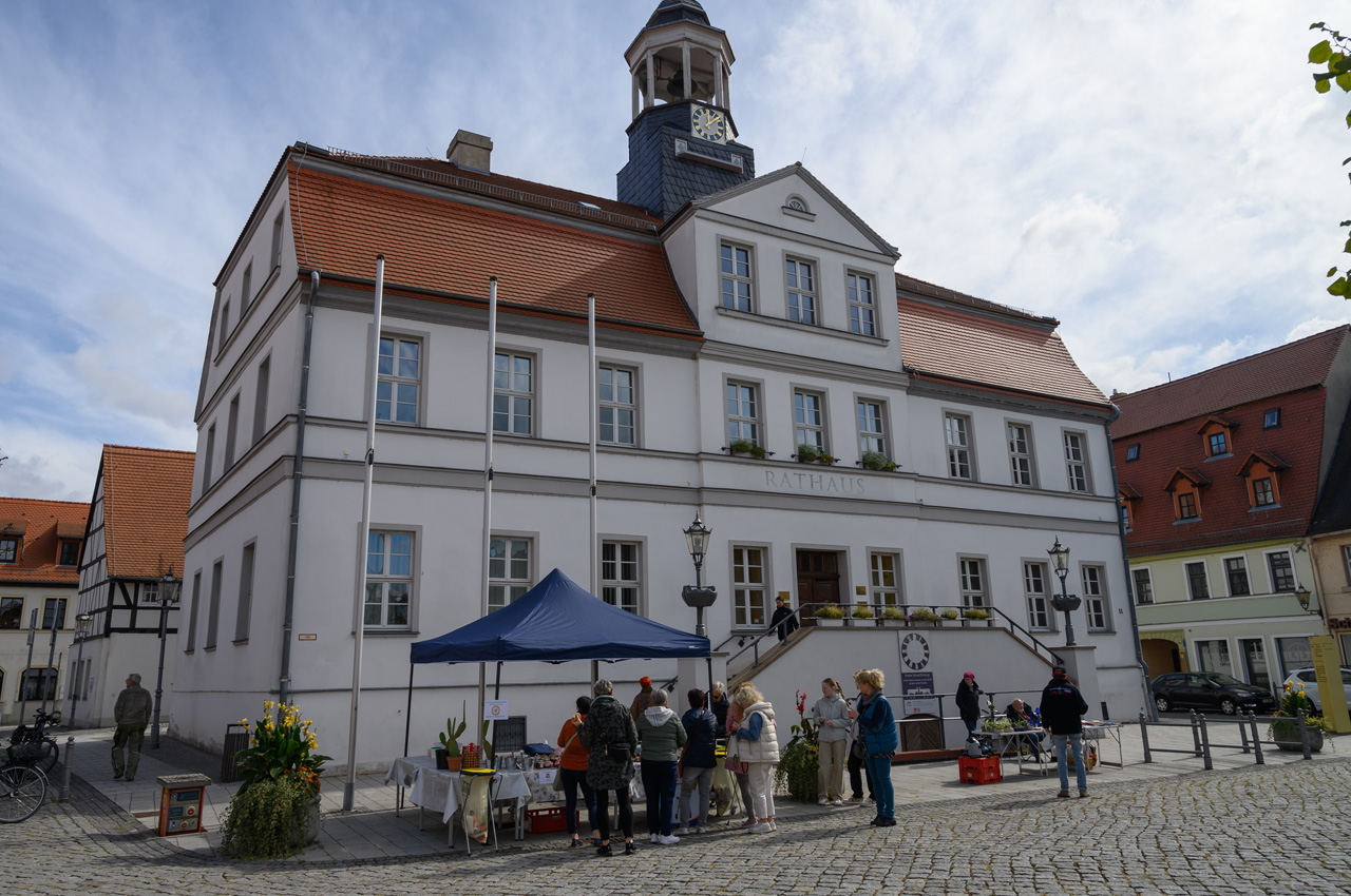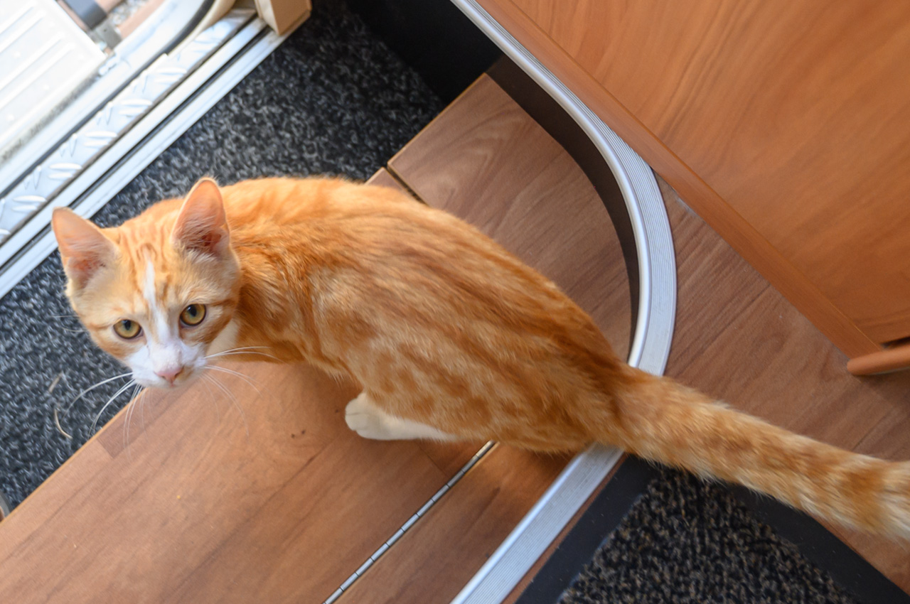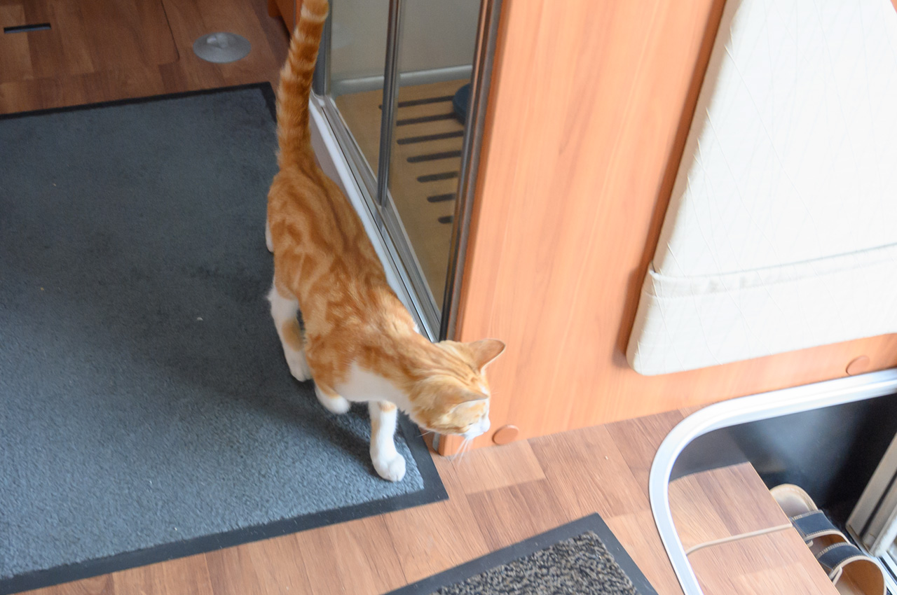 Gegen 11:30 Uhr haben wir uns wieder auf unseren NIU gesetzt, dieses Mal mit dem Ziel der roten Steine bzw. des roten Ufers. Diese Felswand ist eigentlich eine übrig gebliebene Halde aus dem Abbau von Alaun zwischen 1557 und 1886. Kurioserweise deklariert Wikipedia das rote Ufer als POI und auch die Gemeinde. Google kennt aber kein rotes Ufer und auch keine roten Steine. Also habe ich für das Navi den nächstliegenden Ort eingegeben. Sehr zur Freude von Susanne, schickte uns das Navi das erste Stück des Weges auf einer Schotterstraße entlang. Wir haben den NIU in Schwerz abgestellt und sind einem Wanderschild gefolgt. Da an dem Schild aber zwei Wege abgingen, haben wir treffsicher den falschen Weg gewählt. Allerdings führte der uns in schönste Landschaft und zu mindestens landeten wir an der Mulde. Wir mussten nun noch ein ganzes Stück an der Mulde entlanglaufen. Aber wir haben dann endlich die Felsenwand vor uns gehabt. Die Drohne hier steigen zu lassen war nicht ganz einfach, weil es hier nur Wiese gab mit ziemlich hohen Grasbewuchs. Die Tasche der Drohne war die einzige Möglichkeit, aber etwas zu klein. Das Aufsteigen habe ich noch gerade so hinbekommen, komplizierter war das Landen. Das war das erste Mal, dass die Drohne auf meiner Hand gelandet ist bzw. ich sie in der Luft stehend von unten gegriffen habe. Die Aufnahmen von der roten Felswand sind trotzdem sehr schön geworden. Für den Rückweg zum NIU hat Susanne auf ihrem Handy einen kürzeren Weg gefunden. Das Navi vom NIU wollte uns dann auf dem Weg zum Womo wieder über den Schotterweg schicken. Ich bin einfach an dem Weg vorbeigefahren. Das Navi wollten uns nun aber immer wenden lassen. Offensichtlich gab es keine vernünftige Alternative. Also haben wir uns entschieden, doch das Stück Schotterweg in Kauf zu nehmen. Kurz bevor wir das Womo erreicht haben, trafen wir Leute mit der Katze auf dem Arm. Wir haben erfahren, dass die Katze bis vor kurzem im Schwimmbad lebte. Die Besitzer aber jetzt ein Stück weiter wohnen. Tschüss Katze, war nett dich kennengelernt zu haben. Das war nun unser letzter Tag auf dieser Tour.
