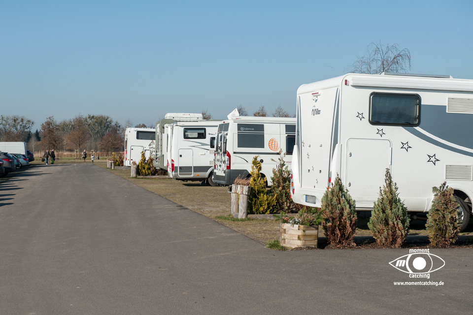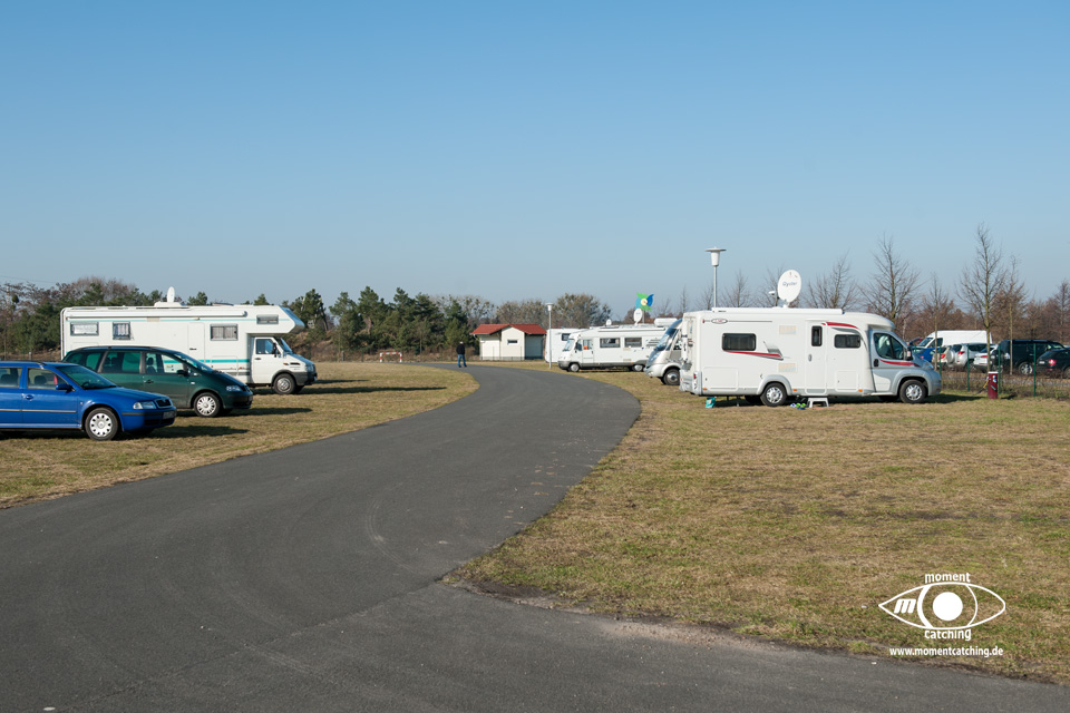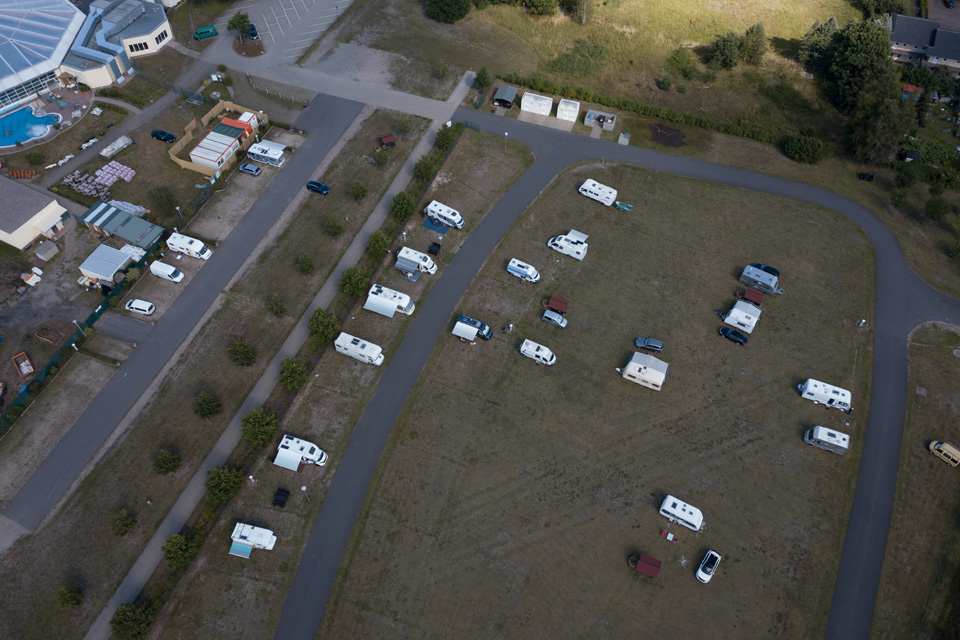 - Die Stellplätze erstrecken sich über zwei Bereiche. Eine langgestreckte Reihe auf dem Parkplatz, der auch von Pkw´s genutzt wird, direkt am Badgelände. Am Parkplatz angrenzend eine separate Wiese mit den meisten Stellplätzen, die auch für größere Wohnmobile reichen.