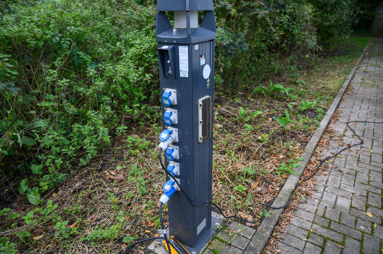 - Strom an entsprechenden Säulen mit Zahlautomat, der nur 1,-€ Münzen annimmt. Anschlüsse mit 16 A abgesichert und in CEE-Ausführung.