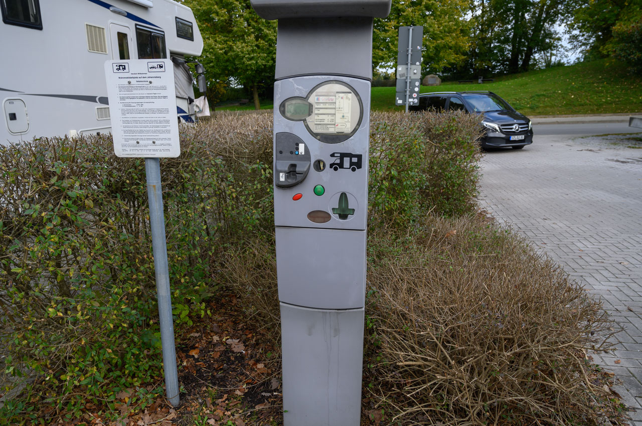 - Es gibt einen Bodeneinlass für Grauwasser, der gleichzeitig für Fäkalien ist. Trinkwasser gibt es an einer Säule mit Bezahlautomaten. Für 10 Cent gibt es 8 Liter oder für 50 Cent 40 Liter.