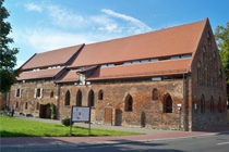 Nach dem Zwischenkaffee sind wir in den Ort gelaufen. Gleich, wenn man den Stellplatz verlässt, steht man auf der anderen Straßenseite vor einem Bäcker. Da sollte es dann doch morgen zum Frühstück frische Brötchen geben. Wir sind ein kleines Stück weiter zum Fleischer gelaufen und haben uns dort mit frischer Wurst versorgt und unsere Übernachtungsgebühr bezahlt. Auf dem Rückweg haben wir einen kleinen Umweg durch den ehemaligen Klostergarten gemacht und haben die alte Darre bestaunt, mit den kleinen gotischen Fenstern. Schräg rüber die ehemalige Klosterkirche ist im Winter nicht zu besichtigen.