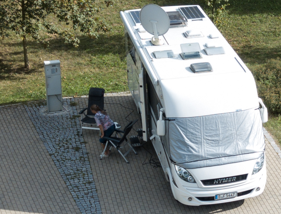 - Die Säulen für die Stromanschlüsse sind für jeweils vier Stellflächen mittig angeordnet. Die Angabe 1,50€/kWh stimmt nicht. Bei Einwurf einer Euromünze wird schon 1kWh angezeigt.