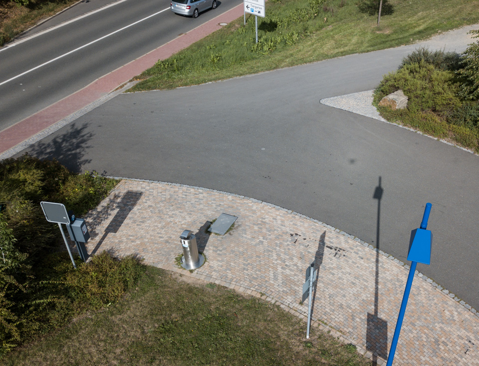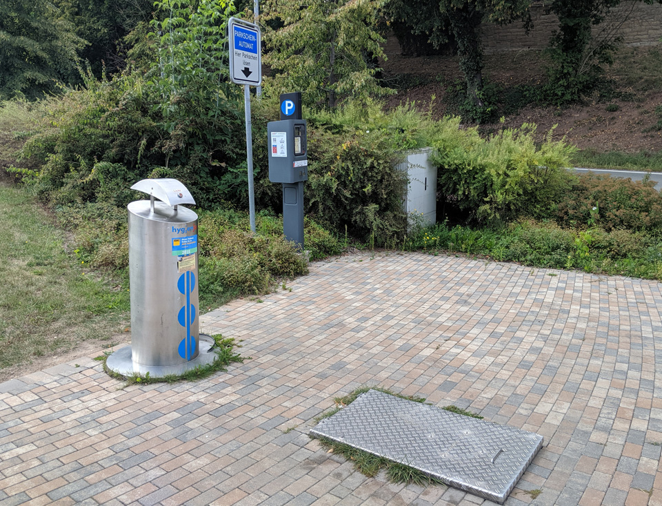- Die V+E befindet sich an der Zufahrt zu den Stellflächen. Der Bodeneinlass für Grauwasser ist mit einer Blechklappe abgedeckt.