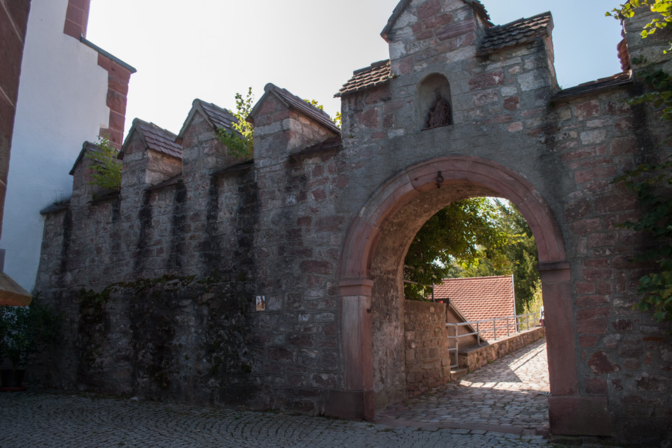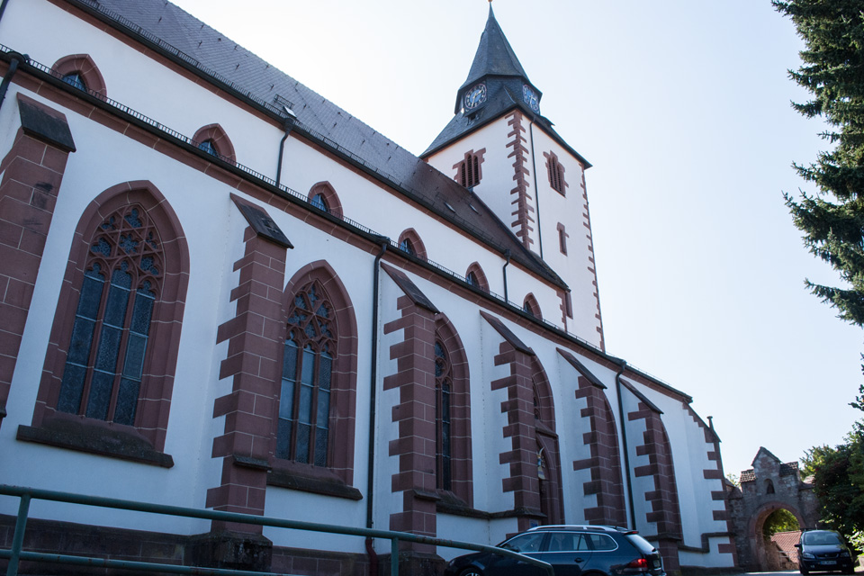 Links im Chorraum ist das Sakramentshäuschen angebracht, das vom Bildersturm der Reformation verschont blieb. Es zeigt auf der Turmspitze einen Pelikan, der seine Jungen mit seinem Blut nährt. Dieses Symbol verweist auf die Selbstaufopferung Christi, an dem die Gläubigen durch das Abendmahl teilhaben können. An der linken Wand ist die Grabplatte von Wilhelm IV. von Eberstein und der Gräfin Johanna von Hanau angebracht. Der achtseitige Taufstein stammt aus dem Jahr 1716 und hat 1960 einen Kupferdeckel erhalten.