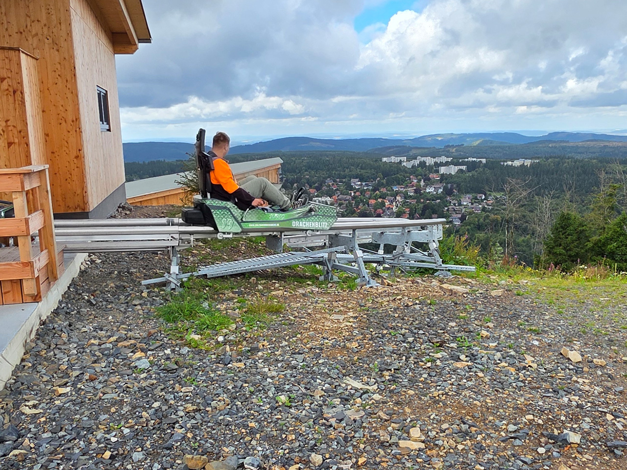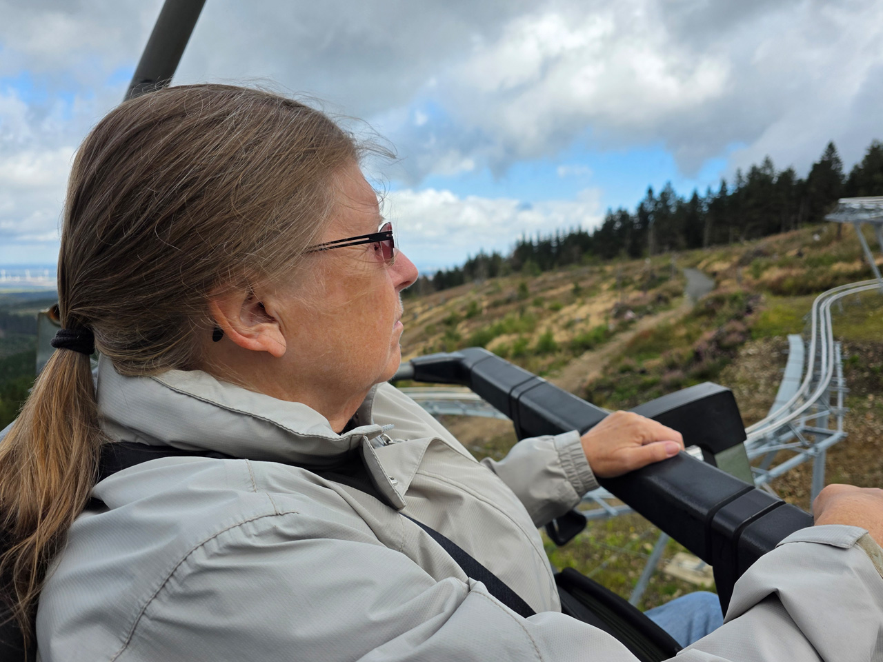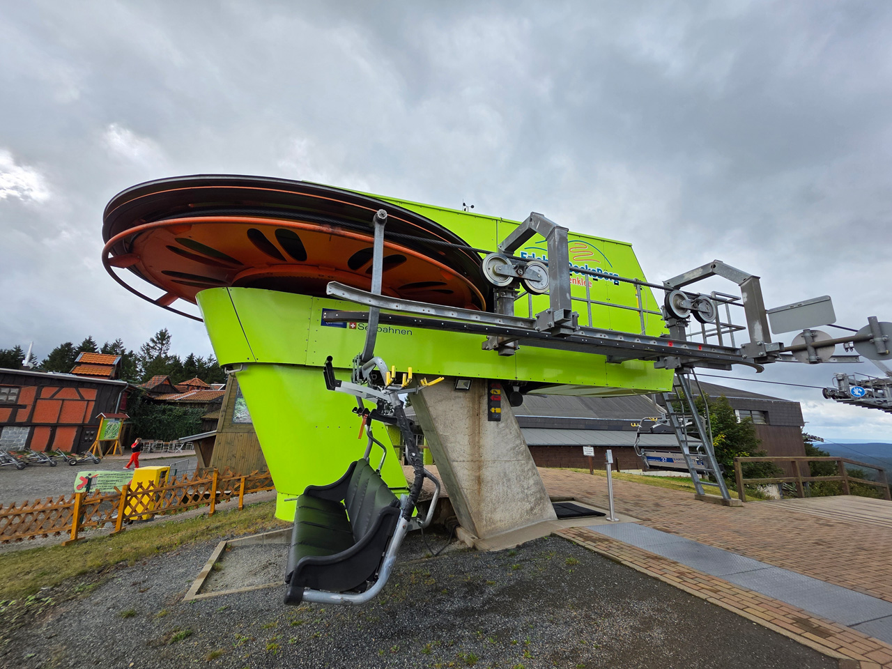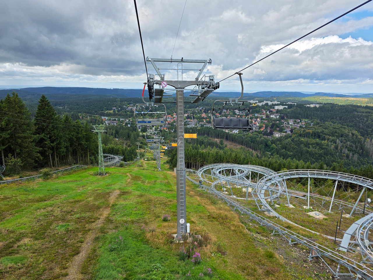 Ich merkte zunehmend, dass es mir sehr kalt um meinen Kopf wurde. Ich war auf der Suche nach einem Laden, in dem ich mir eine Wollmütze kaufen kann. Dabei sind wir durch den Ort gestreift und haben kein Geschäft mit entsprechenden Angeboten gefunden. Wir sind zurück zum Abfahrtspunkt der Gondelbahn auf den Gipfel des Bocksberg. Da haben wir erfahren, dass nur der Sessellift fährt. Die Kabinenbahn darf wegen zu starkem Wind nicht betrieben werden. Bevor wir zum Sessellift gelaufen sind, haben wir in der Abfahrtshalle ein Geschäft entdeckt, was auch Wollmützen im Angebot hat. Ich habe jetzt eine Mütze mit Harzemblem. Der Sessellift war für uns ein Erlebnis der besonderen Art. Wir haben es aber schadlos überstanden, außer, dass wir oben ziemlich durchgefroren angekommen sind. Auf dem Gipfel des Boxberges das gleiche Bild, alles macht einen verwahrlosten Eindruck. Was hier noch halbwegs zu funktionieren scheint, sind die zwei Sommerrodelbahnen. Ganz bequem rast man durch eine Art Achterbahn und wird dann wieder hochgezogen. Für junge Menschen sicherlich ein großartiges Erlebnis. Wir haben den Ausblick auf die Berglandschaft des Harzes genossen. Mit der Sesselbahn ging es wieder zurück in den Ort und zurück zu unserem NIU. Wir treten die Rückfahrt an. Jetzt hatte unser NIU es viel leichter. Nun ging es fast die gesamte Strecke abwärts. Das Ecosystem des NIU´s hat nun sogar die Batterien wieder aufgeladen. Immerhin hatten wir einen Ladungszuwachs an 3%. Jetzt war Kaffeezeit in unserem mollig warmen Womo.