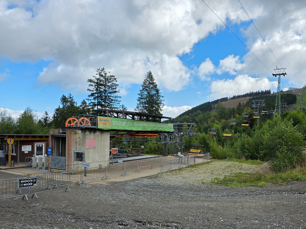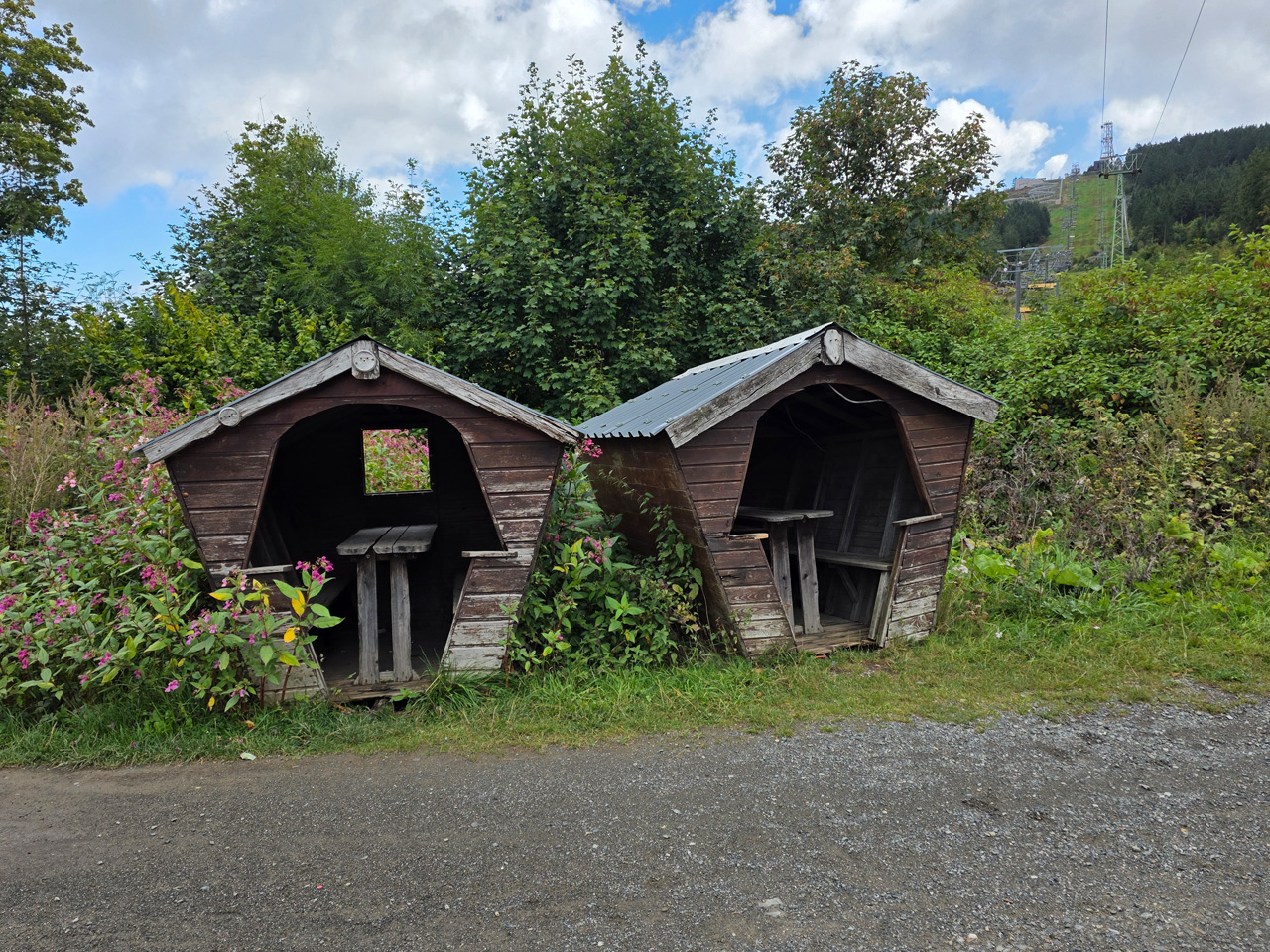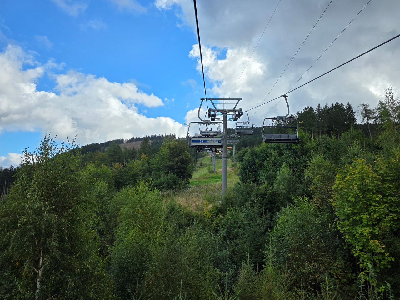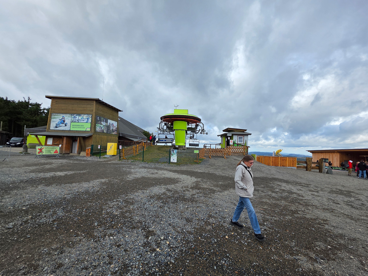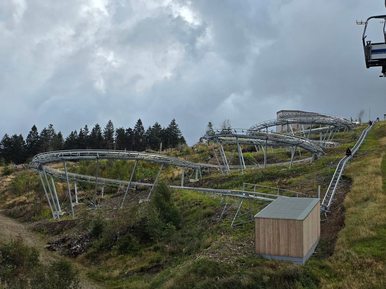 Ich merkte zunehmend, dass es mir sehr kalt um meinen Kopf wurde. Ich war auf der Suche nach einem Laden, in dem ich mir eine Wollmütze kaufen kann. Dabei sind wir durch den Ort gestreift und haben kein Geschäft mit entsprechenden Angeboten gefunden. Wir sind zurück zum Abfahrtspunkt der Gondelbahn auf den Gipfel des Bocksberg. Da haben wir erfahren, dass nur der Sessellift fährt. Die Kabinenbahn darf wegen zu starkem Wind nicht betrieben werden. Bevor wir zum Sessellift gelaufen sind, haben wir in der Abfahrtshalle ein Geschäft entdeckt, was auch Wollmützen im Angebot hat. Ich habe jetzt eine Mütze mit Harzemblem. Der Sessellift war für uns ein Erlebnis der besonderen Art. Wir haben es aber schadlos überstanden, außer, dass wir oben ziemlich durchgefroren angekommen sind. Auf dem Gipfel des Boxberges das gleiche Bild, alles macht einen verwahrlosten Eindruck. Was hier noch halbwegs zu funktionieren scheint, sind die zwei Sommerrodelbahnen. Ganz bequem rast man durch eine Art Achterbahn und wird dann wieder hochgezogen. Für junge Menschen sicherlich ein großartiges Erlebnis. Wir haben den Ausblick auf die Berglandschaft des Harzes genossen. Mit der Sesselbahn ging es wieder zurück in den Ort und zurück zu unserem NIU. Wir treten die Rückfahrt an. Jetzt hatte unser NIU es viel leichter. Nun ging es fast die gesamte Strecke abwärts. Das Ecosystem des NIU´s hat nun sogar die Batterien wieder aufgeladen. Immerhin hatten wir einen Ladungszuwachs an 3%. Jetzt war Kaffeezeit in unserem mollig warmen Womo.