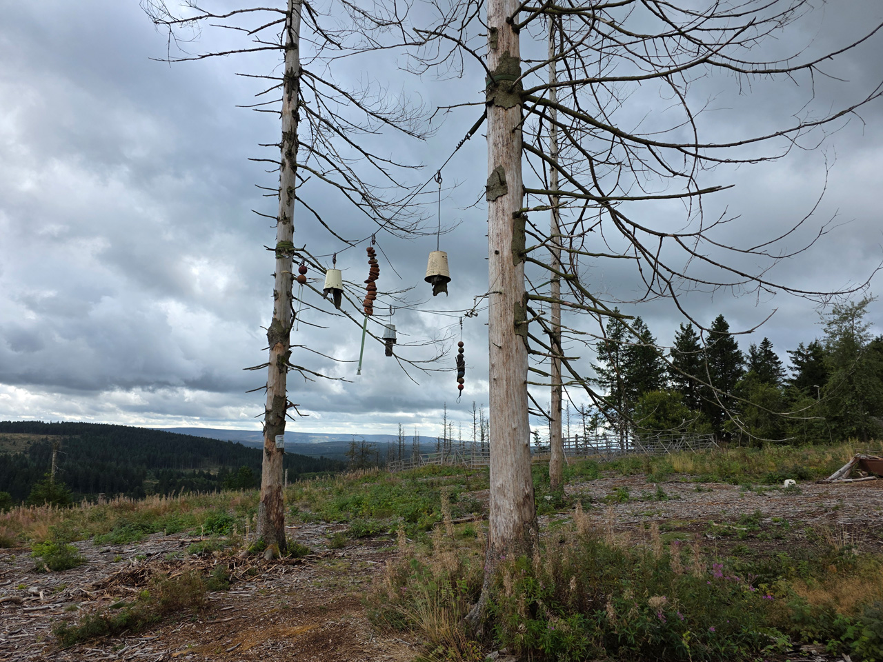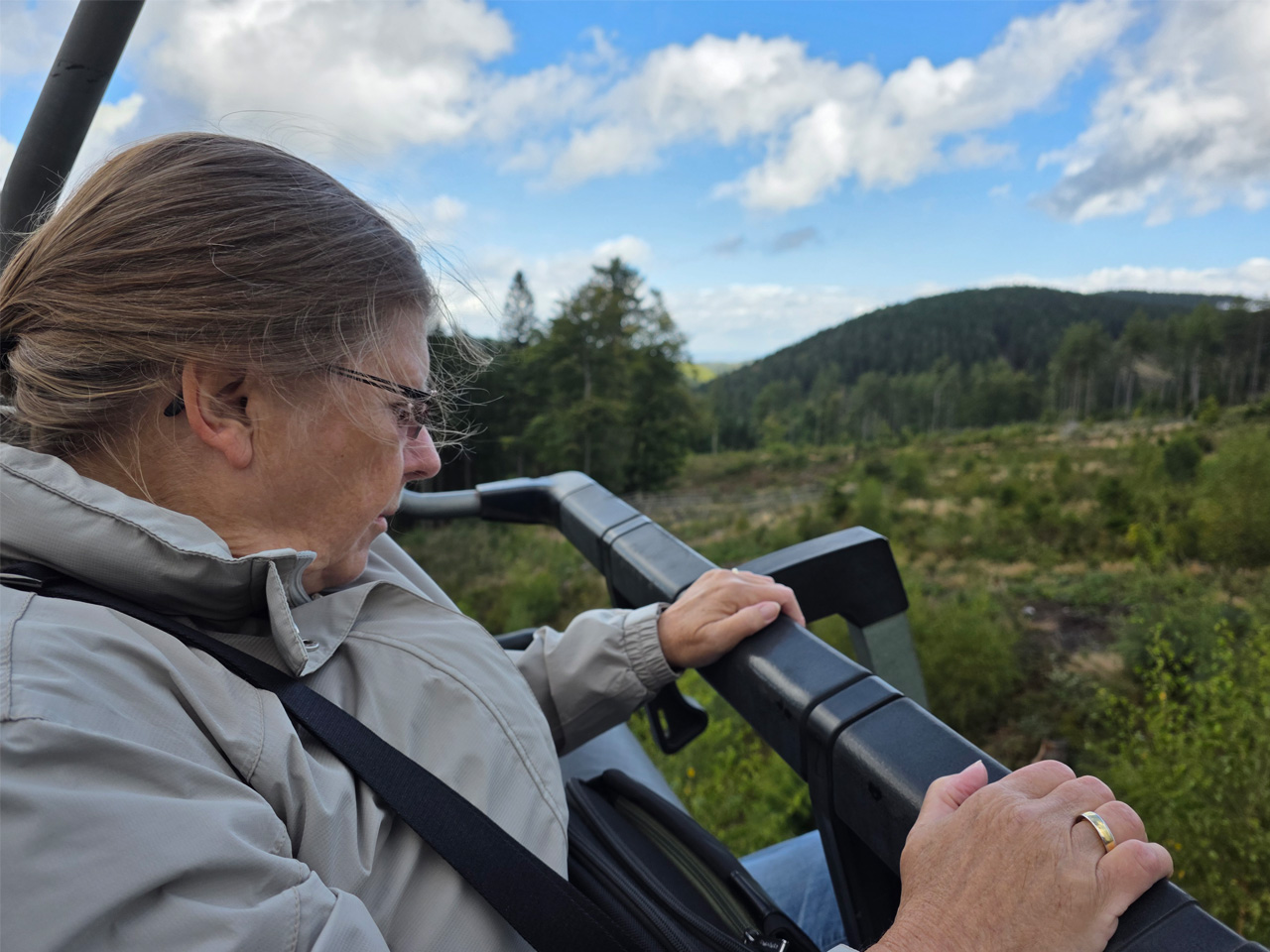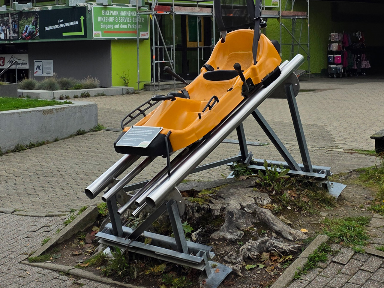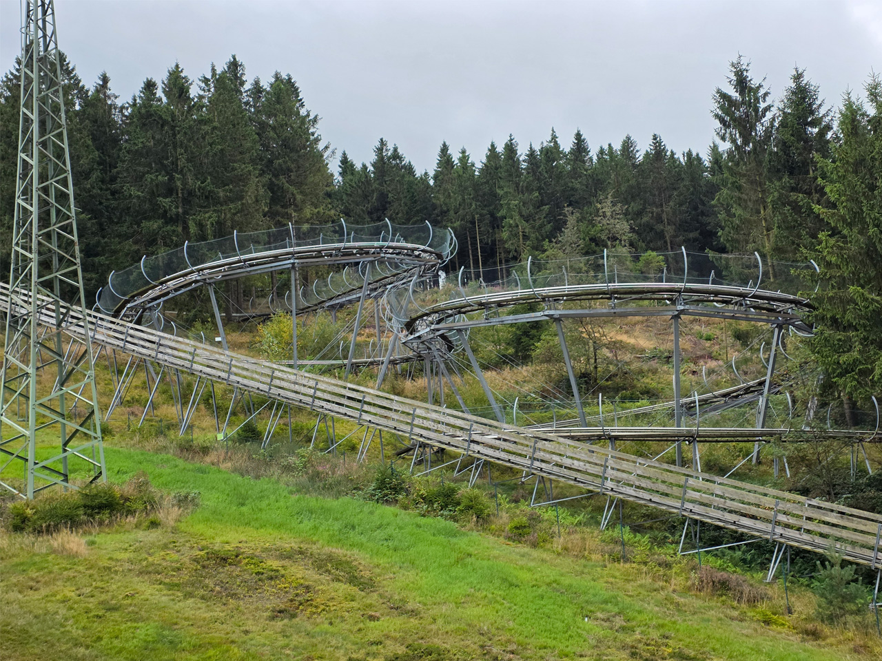 Ich merkte zunehmend, dass es mir sehr kalt um meinen Kopf wurde. Ich war auf der Suche nach einem Laden, in dem ich mir eine Wollmütze kaufen kann. Dabei sind wir durch den Ort gestreift und haben kein Geschäft mit entsprechenden Angeboten gefunden. Wir sind zurück zum Abfahrtspunkt der Gondelbahn auf den Gipfel des Bocksberg. Da haben wir erfahren, dass nur der Sessellift fährt. Die Kabinenbahn darf wegen zu starkem Wind nicht betrieben werden. Bevor wir zum Sessellift gelaufen sind, haben wir in der Abfahrtshalle ein Geschäft entdeckt, was auch Wollmützen im Angebot hat. Ich habe jetzt eine Mütze mit Harzemblem. Der Sessellift war für uns ein Erlebnis der besonderen Art. Wir haben es aber schadlos überstanden, außer, dass wir oben ziemlich durchgefroren angekommen sind. Auf dem Gipfel des Boxberges das gleiche Bild, alles macht einen verwahrlosten Eindruck. Was hier noch halbwegs zu funktionieren scheint, sind die zwei Sommerrodelbahnen. Ganz bequem rast man durch eine Art Achterbahn und wird dann wieder hochgezogen. Für junge Menschen sicherlich ein großartiges Erlebnis. Wir haben den Ausblick auf die Berglandschaft des Harzes genossen. Mit der Sesselbahn ging es wieder zurück in den Ort und zurück zu unserem NIU. Wir treten die Rückfahrt an. Jetzt hatte unser NIU es viel leichter. Nun ging es fast die gesamte Strecke abwärts. Das Ecosystem des NIU´s hat nun sogar die Batterien wieder aufgeladen. Immerhin hatten wir einen Ladungszuwachs an 3%. Jetzt war Kaffeezeit in unserem mollig warmen Womo.