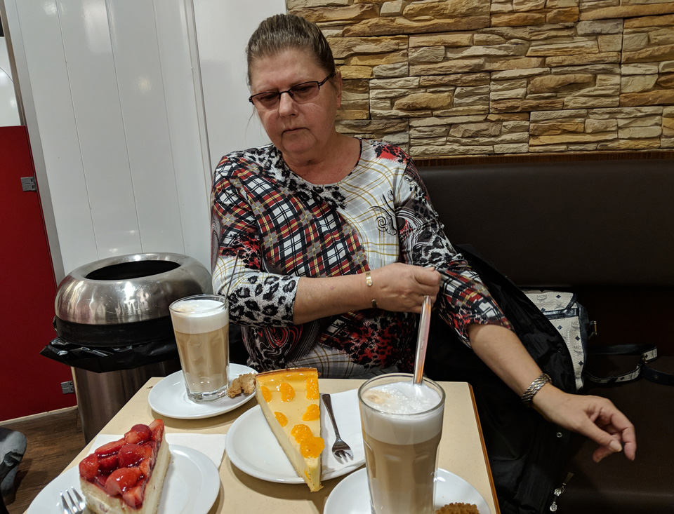 Unsere Suche nach einem schönen Kaffee, wo man gemütlich ein Stück Kuchen und eine Tassee Kaffee trinken kann, gestaltete sich etwas kompliziert. Die meisten waren haltlos überfüllt oder man konnte nicht draußen sitzen. Nach längerer Suche landeten wir im Hauptbahnhof. Das war zwar heilwegs preiswert, aber dementsprechend hat es auch geschmeckt. Das Beste war eine Taube, die nur noch ein Bein hatte. Sie ging zwischen den Tischen spazieren (hüpfend) und zwischendurch auch mal in die hinteren Räume der Bäckerei. Na toll !!!