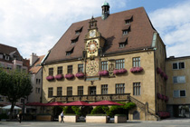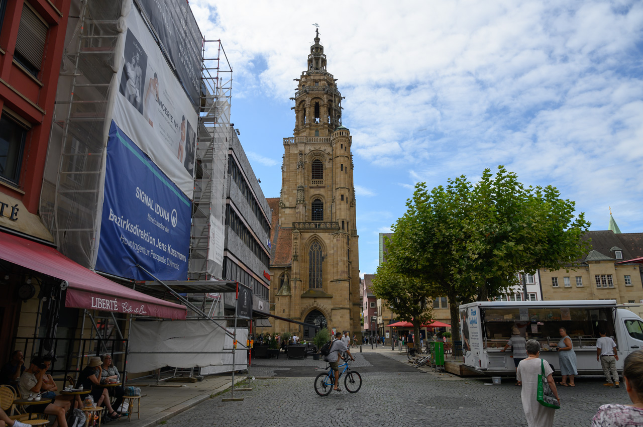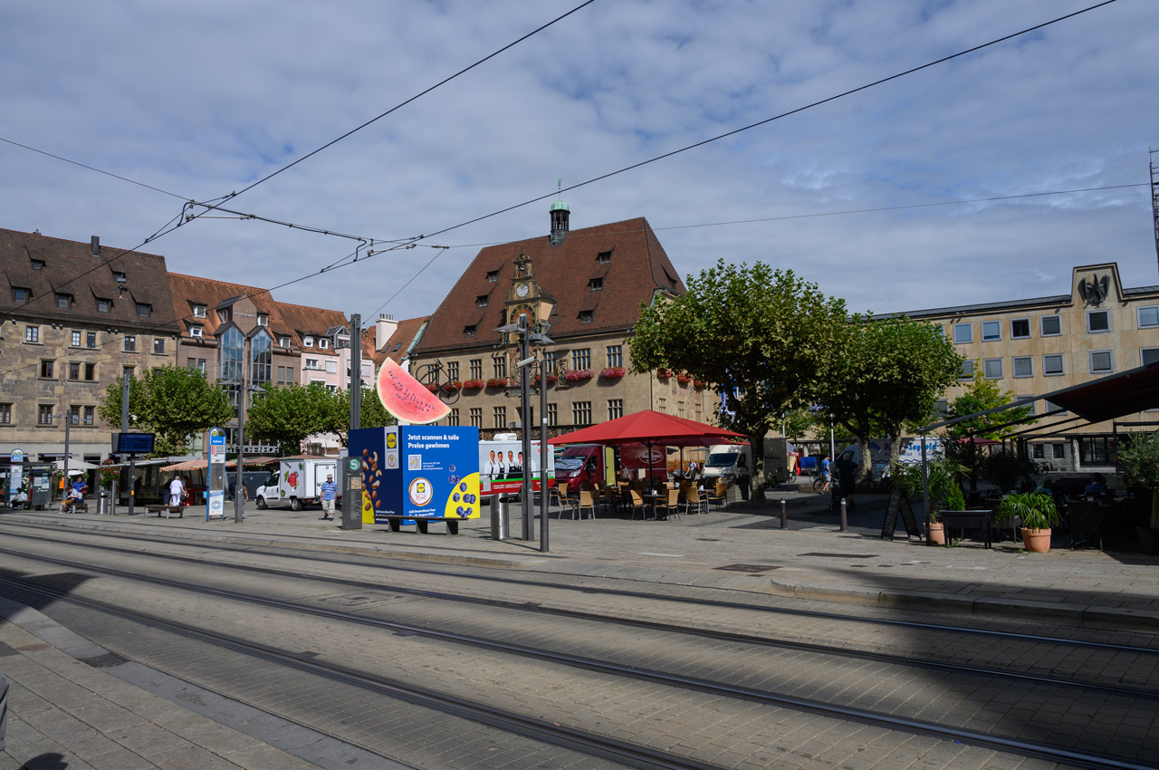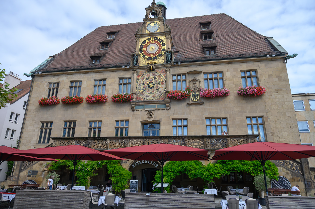 Unser nächstes Ziel war die Touristeninfo am Rathaus. Das Rathaus ist ein sehr schönes Gebäude mit einer speziellen Mond Uhr über der Normalzeituhr. In der Touristeninfo haben wir einen Stadtplan bekommen. Nach einem kurzen Spaziergang durch das Umfeld vom Rathaus, sind wir zurück zur Kilianskirche, um dem Orgelkonzert beizuwohnen. Nach dem ersten Stück haben wir aber die Kirche wieder verlassen. Orgelmusik ist nur sehr bedingt etwas für unsere Ohren. Jetzt waren wir auf der Suche nach einem italienischen Eiskaffee. Diese Suche blieb aber leider erfolglos. Wir haben weder ein italienisches noch ein anderes Eiscafé gefunden. Nachdem wir uns im REWE ein frisches Baguette besorgt haben, haben wir dann auch wieder den Rückweg angetreten. Wir sind wieder den gleichen Weg am Neckar entlang gelaufen.