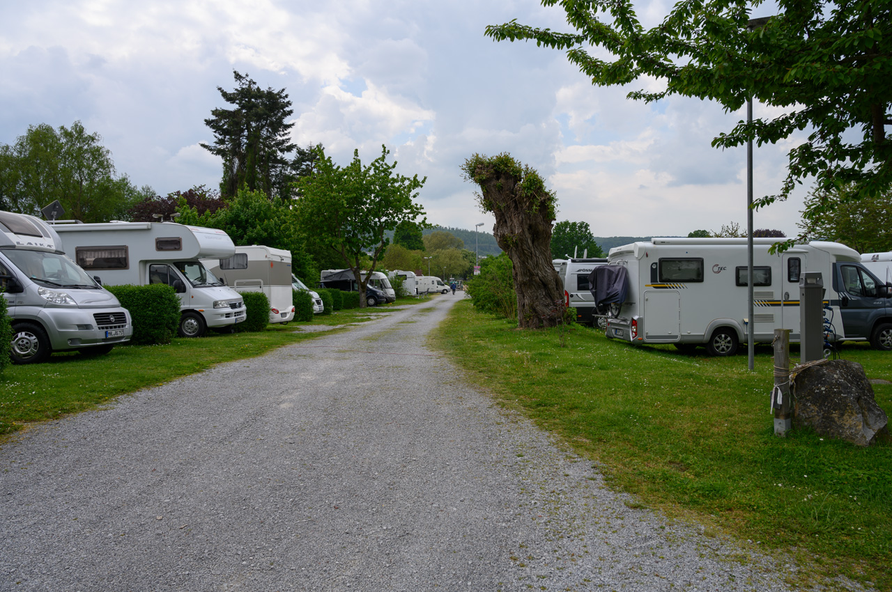 - Der Stellplatz liegt auf der Ostseite der Weser, also auf der anderen Seite als die Innenstadt von Höxter. Die Stellflächen sind abgegrenzt und großzügig bemessen. Teilweise sind sie durch Hecken angetrennt.