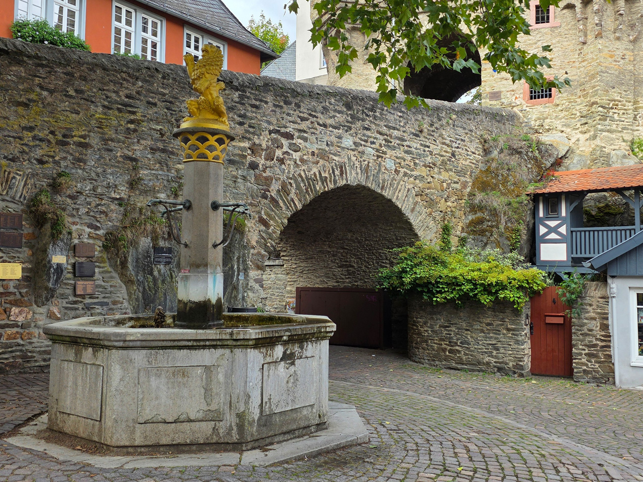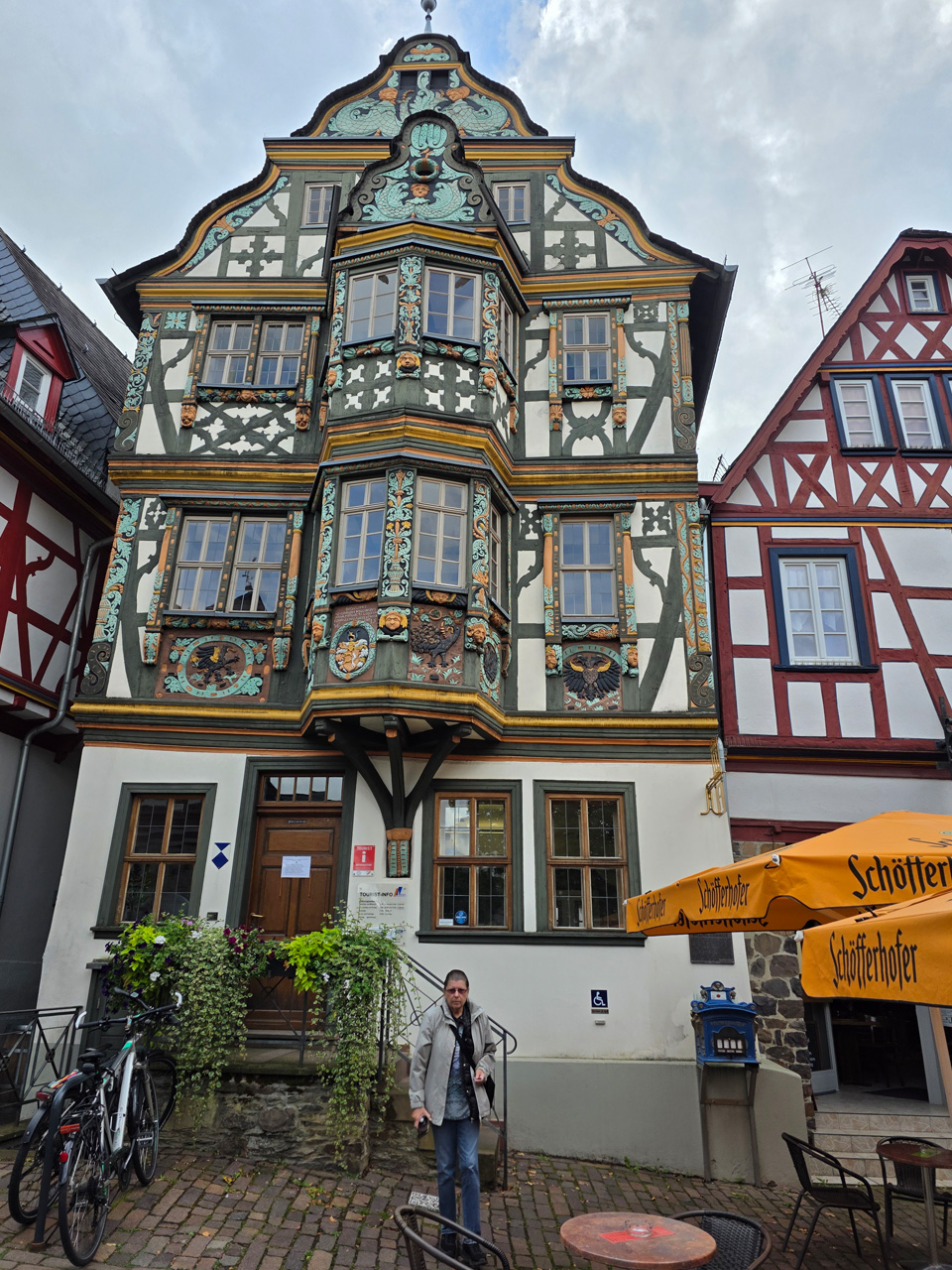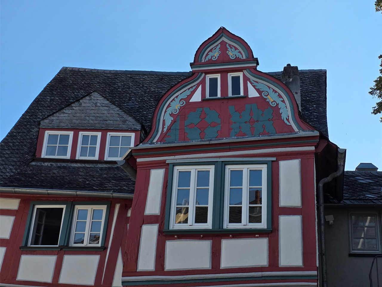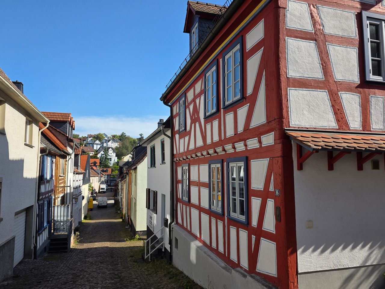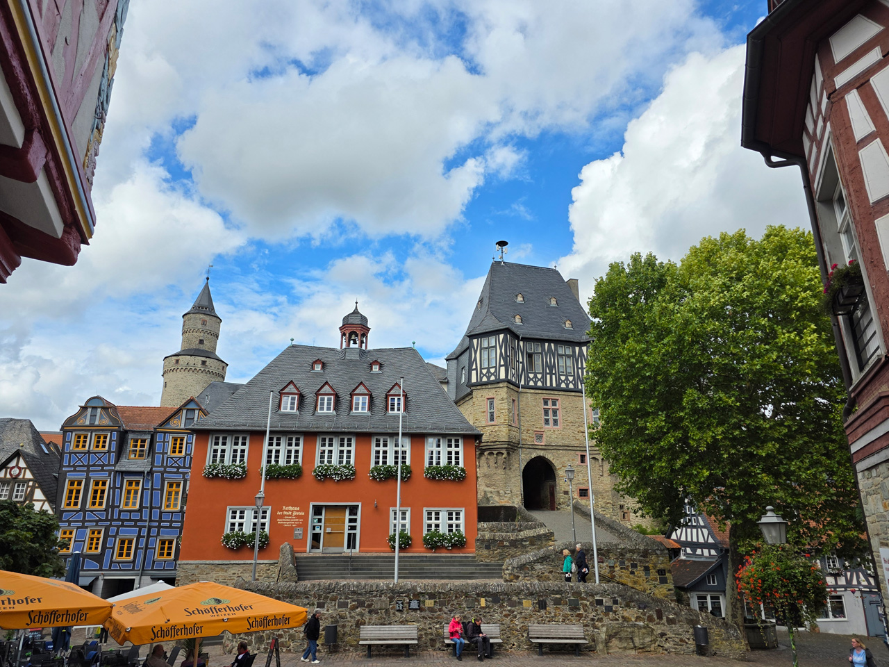 Nach einem Kaffee haben wir uns auf den Weg gemacht in Richtung Altstadt. Wir sind über die Weiherwiese in Richtung Marktplatz gelaufen. Schon in der Weiherwiese haben uns die tollen Fachwerkhäuser tief beeindruckt. Am Marktplatz angekommen fällt der Blick auf den historischen Marktbrunnen. Selbst wenn man sich einmal um die eigene Achse dreht, man sieht ringsherum Fachwerkhäuser, eins schöner als das andere. Wir sind in die Himmelsgasse eingebogen und sind in Richtung Rathaus gelaufen. Hier, auf dem König-Adolf-Platz, steht der Löwenbrunnen, ein weiteres Schmuckstück der Stadt. Hier weiß man gar nicht, wo man zuerst hinschauen soll. Das mächtige Kanzleitor markierte früher die Grenze zwischen der südlichen Bürgerstadt und der nördlichen Residenzstadt. Das Rathausgebäude daneben strahlt in einem leuchtenden Orange. Auf der anderen Seite des Platzes steht eines der schönsten Häuser der Stadt, das Killingerhaus. Es ist sehr reich mit Schnitzkunst verziert. In diesem Gebäude befindet sich die Touristeninformation, die allerdings erst um 14:00 Uhr öffnet. Wir haben bis dahin noch etwas Zeit und gehen darum zuerst in die Rodergasse. Dort fällt sofort ein skurril anmutendes Gebäude auf, das als Schiefes Haus bezeichnete Gebäude. Auch hier kann man über die gewagte Architektur nur staunen. Über den Löherplatz ging es zurück zu der Unionskirche. Sie war offen und wir konnten sie besichtigen. Das ist eine Kirche der besonderen Art, wie man sie nicht so oft zu sehen bekommt. Hier wurde Lahnmarmor für die Arkaden an beiden Seiten des Schiffes und den Säulen verwendet. Auch der barocke Altar ist fast komplett aus Marmor. Ein ganz besonderes Highlight sind die 38 Gemälde, die die Decke und die Brüstungen der Arkadengänge zieren. Von den 38 Gemälden sind 33 von Michael Angelo Immonradt und 5 von Johann von Sandrart. Allein mit diesen Gemälden kann man sich lange Zeit aufhalten. Nach einem kurzen Blick in die kleine Gruft unter dem Chor, dort stehen die Sarkophage des Fürstenpaares, haben wir die Kirche wieder verlassen, um vorbei an weiteren Fachwerkhäusern zu der Touristeninfo zu gehen. Sie hatte nun inzwischen geöffnet und wir konnten unsere Standgebühren bezahlen und uns mit entsprechendem Infomaterial versorgen. Jetzt war es auch langsam Zeit für unseren Nachmittagskaffee. Wir sind zurück zum Womo gelaufen. Unterwegs haben wir unter dem positiven Eindruck dieses Ortes beschlossen, den eingesparten Tag hier anzuhängen und erst am Sonntag wieder abzureisen.