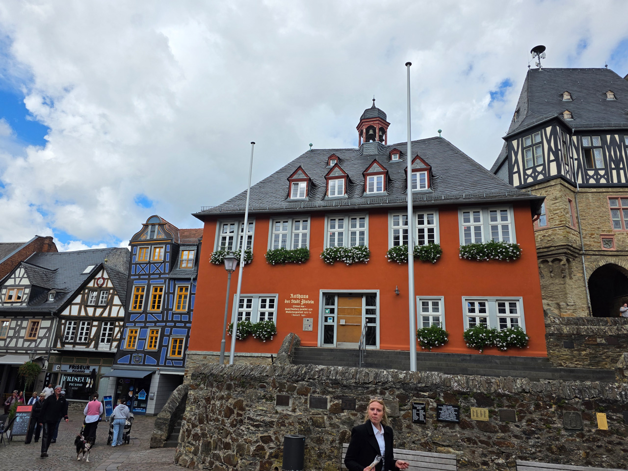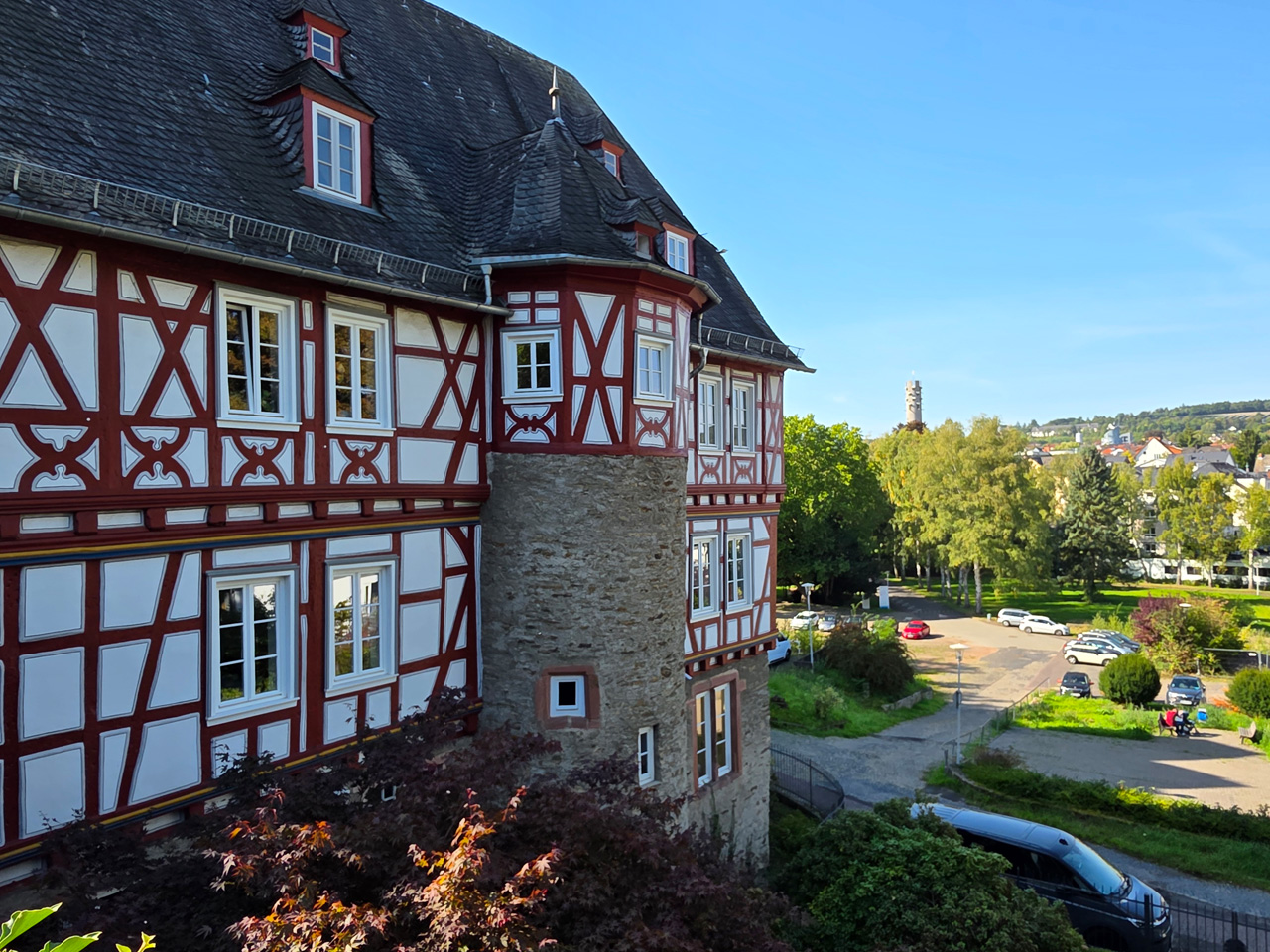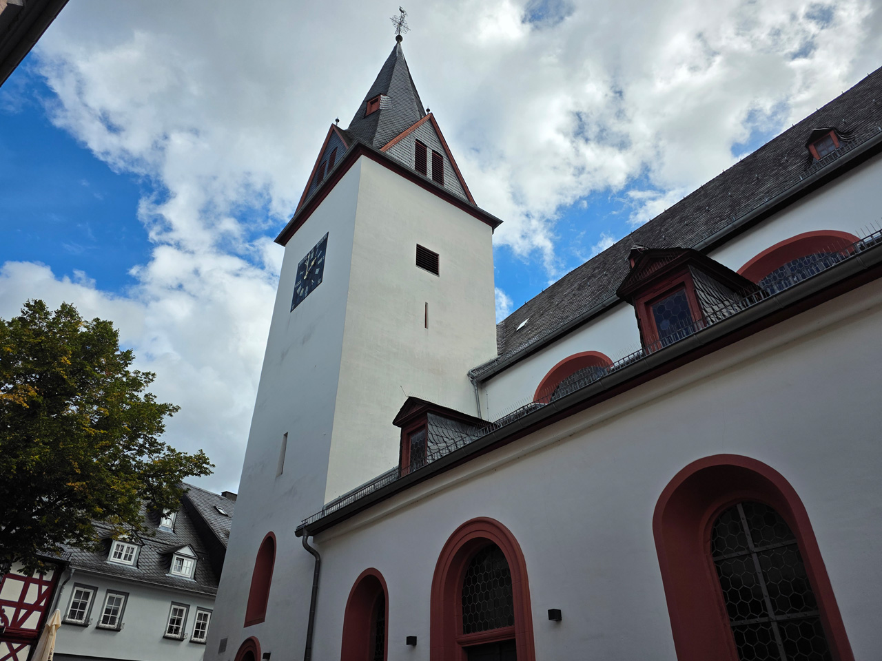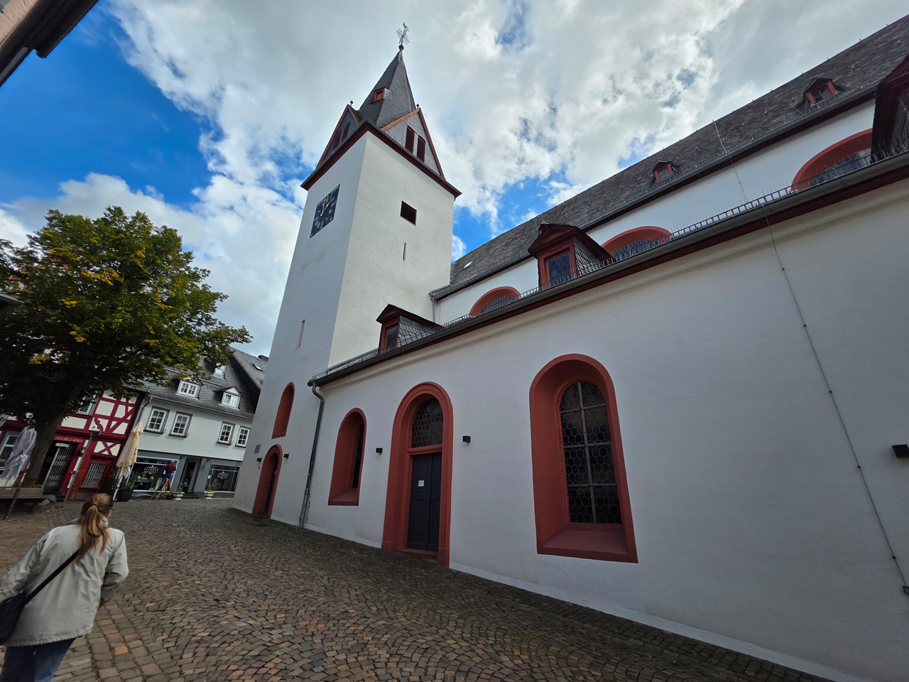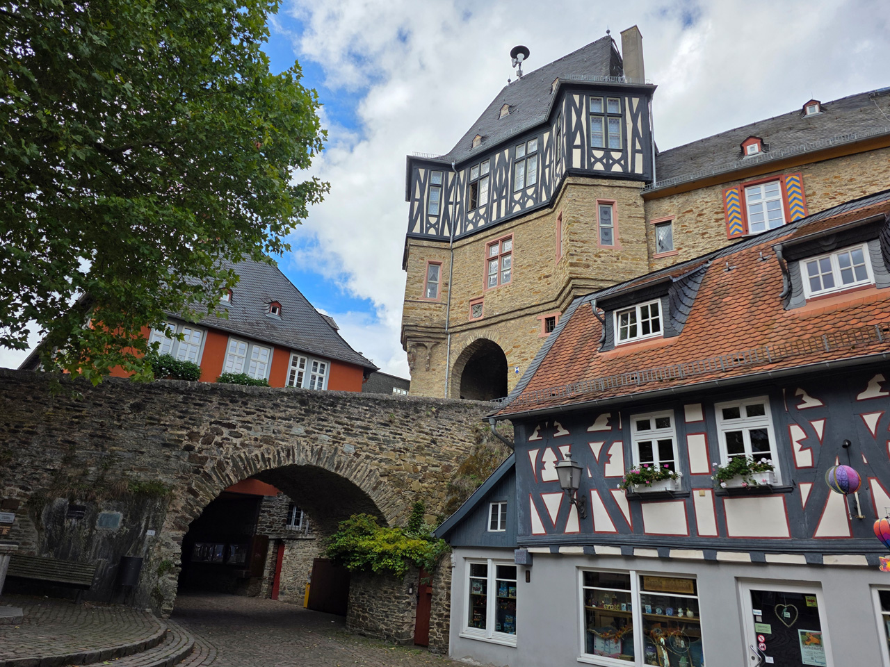 Nach einem Kaffee haben wir uns auf den Weg gemacht in Richtung Altstadt. Wir sind über die Weiherwiese in Richtung Marktplatz gelaufen. Schon in der Weiherwiese haben uns die tollen Fachwerkhäuser tief beeindruckt. Am Marktplatz angekommen fällt der Blick auf den historischen Marktbrunnen. Selbst wenn man sich einmal um die eigene Achse dreht, man sieht ringsherum Fachwerkhäuser, eins schöner als das andere. Wir sind in die Himmelsgasse eingebogen und sind in Richtung Rathaus gelaufen. Hier, auf dem König-Adolf-Platz, steht der Löwenbrunnen, ein weiteres Schmuckstück der Stadt. Hier weiß man gar nicht, wo man zuerst hinschauen soll. Das mächtige Kanzleitor markierte früher die Grenze zwischen der südlichen Bürgerstadt und der nördlichen Residenzstadt. Das Rathausgebäude daneben strahlt in einem leuchtenden Orange. Auf der anderen Seite des Platzes steht eines der schönsten Häuser der Stadt, das Killingerhaus. Es ist sehr reich mit Schnitzkunst verziert. In diesem Gebäude befindet sich die Touristeninformation, die allerdings erst um 14:00 Uhr öffnet. Wir haben bis dahin noch etwas Zeit und gehen darum zuerst in die Rodergasse. Dort fällt sofort ein skurril anmutendes Gebäude auf, das als Schiefes Haus bezeichnete Gebäude. Auch hier kann man über die gewagte Architektur nur staunen. Über den Löherplatz ging es zurück zu der Unionskirche. Sie war offen und wir konnten sie besichtigen. Das ist eine Kirche der besonderen Art, wie man sie nicht so oft zu sehen bekommt. Hier wurde Lahnmarmor für die Arkaden an beiden Seiten des Schiffes und den Säulen verwendet. Auch der barocke Altar ist fast komplett aus Marmor. Ein ganz besonderes Highlight sind die 38 Gemälde, die die Decke und die Brüstungen der Arkadengänge zieren. Von den 38 Gemälden sind 33 von Michael Angelo Immonradt und 5 von Johann von Sandrart. Allein mit diesen Gemälden kann man sich lange Zeit aufhalten. Nach einem kurzen Blick in die kleine Gruft unter dem Chor, dort stehen die Sarkophage des Fürstenpaares, haben wir die Kirche wieder verlassen, um vorbei an weiteren Fachwerkhäusern zu der Touristeninfo zu gehen. Sie hatte nun inzwischen geöffnet und wir konnten unsere Standgebühren bezahlen und uns mit entsprechendem Infomaterial versorgen. Jetzt war es auch langsam Zeit für unseren Nachmittagskaffee. Wir sind zurück zum Womo gelaufen. Unterwegs haben wir unter dem positiven Eindruck dieses Ortes beschlossen, den eingesparten Tag hier anzuhängen und erst am Sonntag wieder abzureisen.