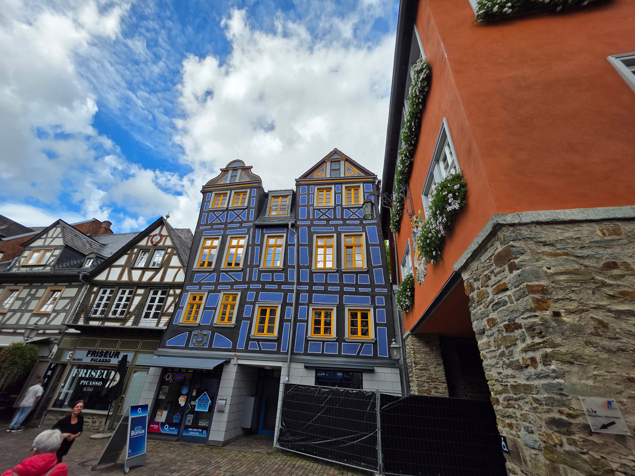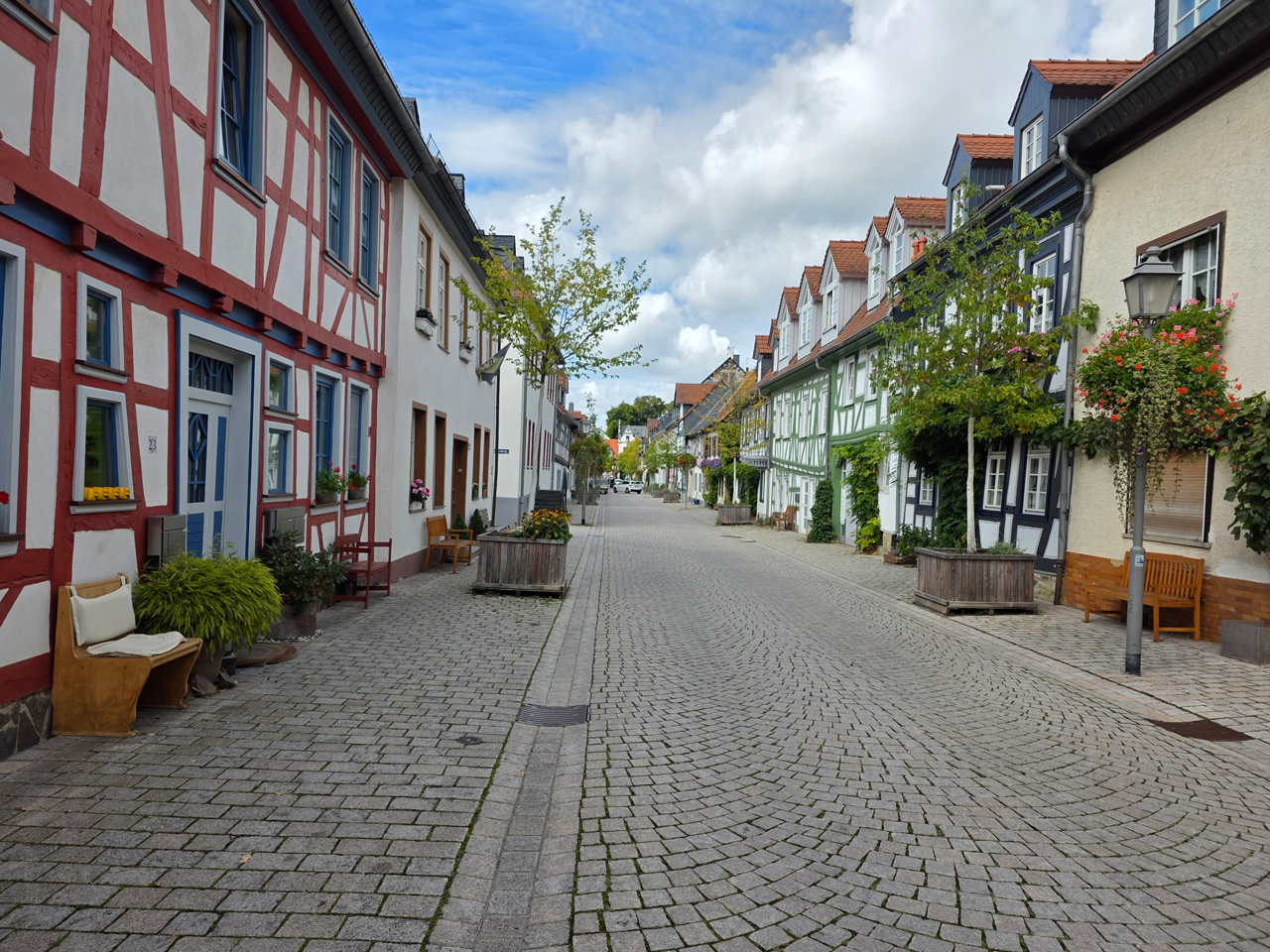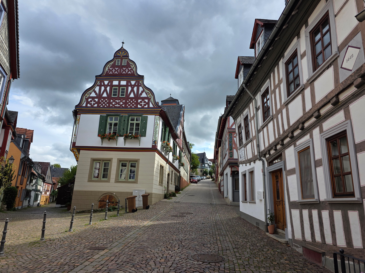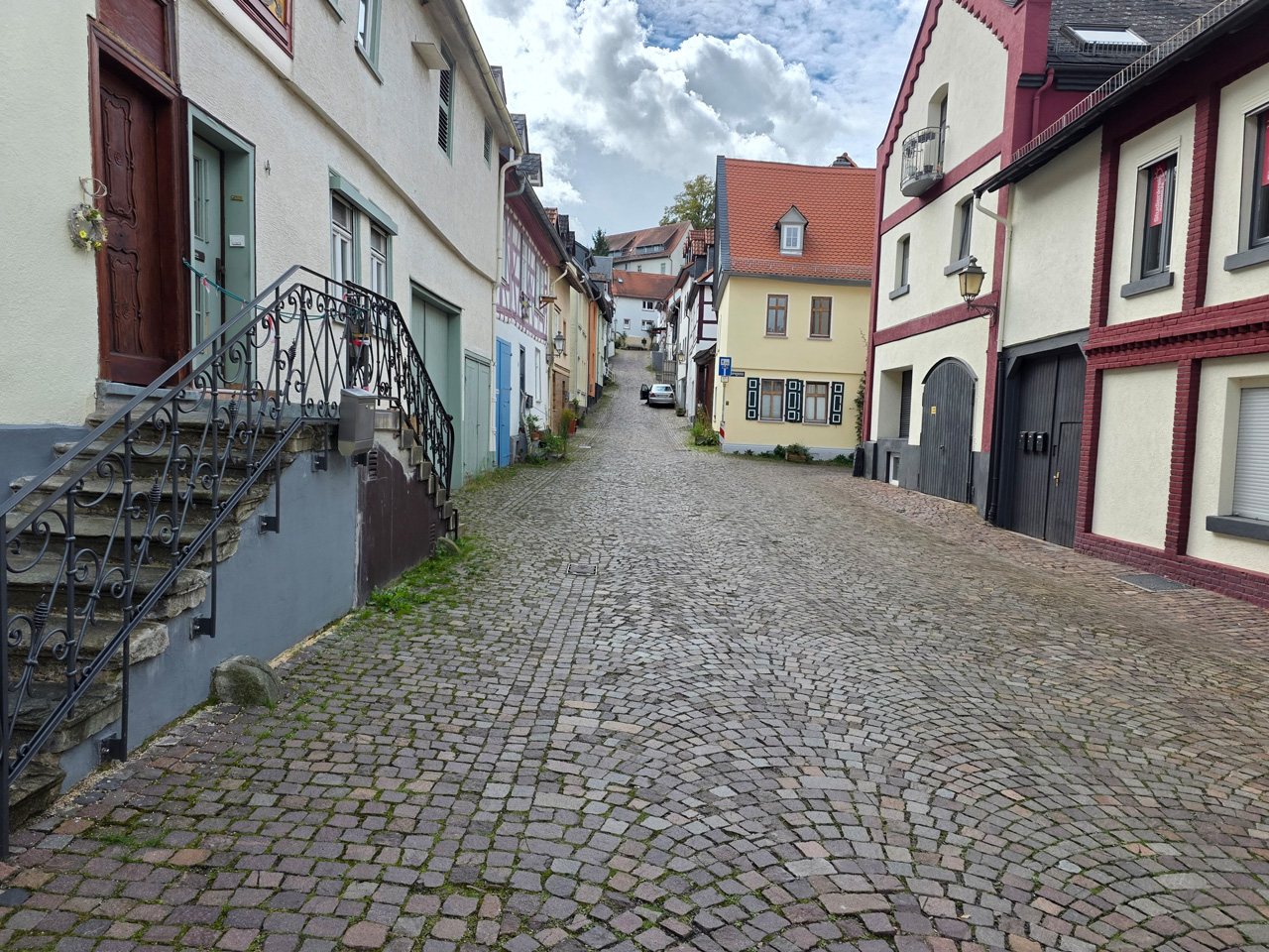 Nach einem Kaffee haben wir uns auf den Weg gemacht in Richtung Altstadt. Wir sind über die Weiherwiese in Richtung Marktplatz gelaufen. Schon in der Weiherwiese haben uns die tollen Fachwerkhäuser tief beeindruckt. Am Marktplatz angekommen fällt der Blick auf den historischen Marktbrunnen. Selbst wenn man sich einmal um die eigene Achse dreht, man sieht ringsherum Fachwerkhäuser, eins schöner als das andere. Wir sind in die Himmelsgasse eingebogen und sind in Richtung Rathaus gelaufen. Hier, auf dem König-Adolf-Platz, steht der Löwenbrunnen, ein weiteres Schmuckstück der Stadt. Hier weiß man gar nicht, wo man zuerst hinschauen soll. Das mächtige Kanzleitor markierte früher die Grenze zwischen der südlichen Bürgerstadt und der nördlichen Residenzstadt. Das Rathausgebäude daneben strahlt in einem leuchtenden Orange. Auf der anderen Seite des Platzes steht eines der schönsten Häuser der Stadt, das Killingerhaus. Es ist sehr reich mit Schnitzkunst verziert. In diesem Gebäude befindet sich die Touristeninformation, die allerdings erst um 14:00 Uhr öffnet. Wir haben bis dahin noch etwas Zeit und gehen darum zuerst in die Rodergasse. Dort fällt sofort ein skurril anmutendes Gebäude auf, das als Schiefes Haus bezeichnete Gebäude. Auch hier kann man über die gewagte Architektur nur staunen. Über den Löherplatz ging es zurück zu der Unionskirche. Sie war offen und wir konnten sie besichtigen. Das ist eine Kirche der besonderen Art, wie man sie nicht so oft zu sehen bekommt. Hier wurde Lahnmarmor für die Arkaden an beiden Seiten des Schiffes und den Säulen verwendet. Auch der barocke Altar ist fast komplett aus Marmor. Ein ganz besonderes Highlight sind die 38 Gemälde, die die Decke und die Brüstungen der Arkadengänge zieren. Von den 38 Gemälden sind 33 von Michael Angelo Immonradt und 5 von Johann von Sandrart. Allein mit diesen Gemälden kann man sich lange Zeit aufhalten. Nach einem kurzen Blick in die kleine Gruft unter dem Chor, dort stehen die Sarkophage des Fürstenpaares, haben wir die Kirche wieder verlassen, um vorbei an weiteren Fachwerkhäusern zu der Touristeninfo zu gehen. Sie hatte nun inzwischen geöffnet und wir konnten unsere Standgebühren bezahlen und uns mit entsprechendem Infomaterial versorgen. Jetzt war es auch langsam Zeit für unseren Nachmittagskaffee. Wir sind zurück zum Womo gelaufen. Unterwegs haben wir unter dem positiven Eindruck dieses Ortes beschlossen, den eingesparten Tag hier anzuhängen und erst am Sonntag wieder abzureisen.