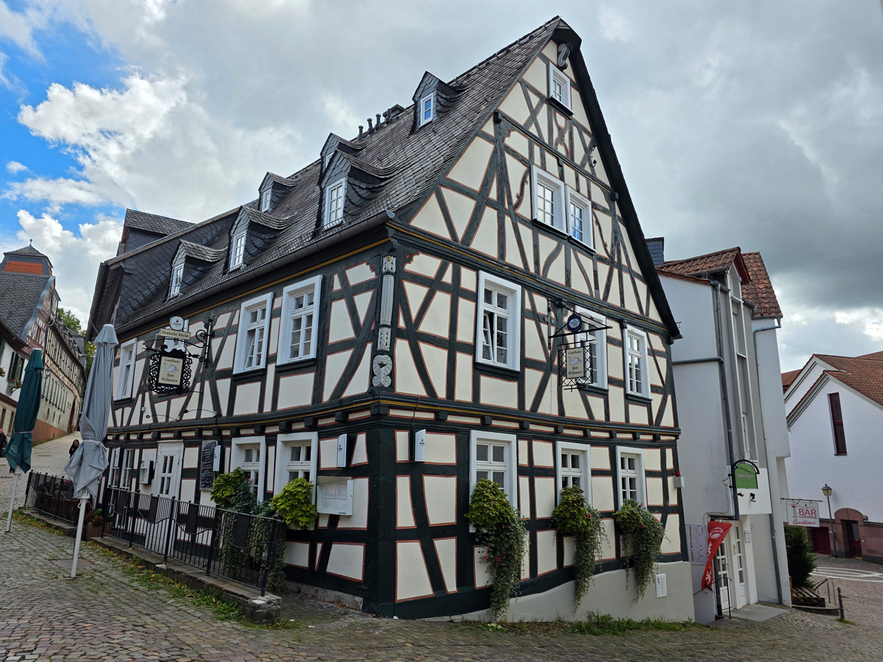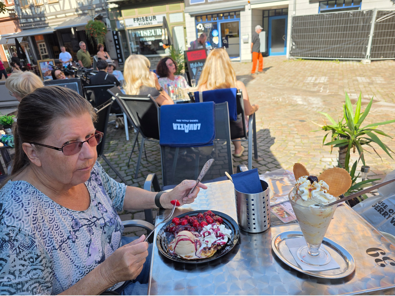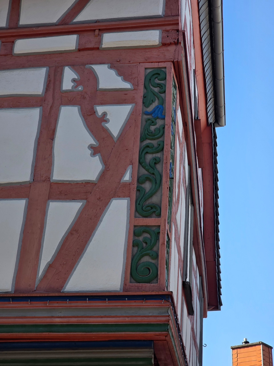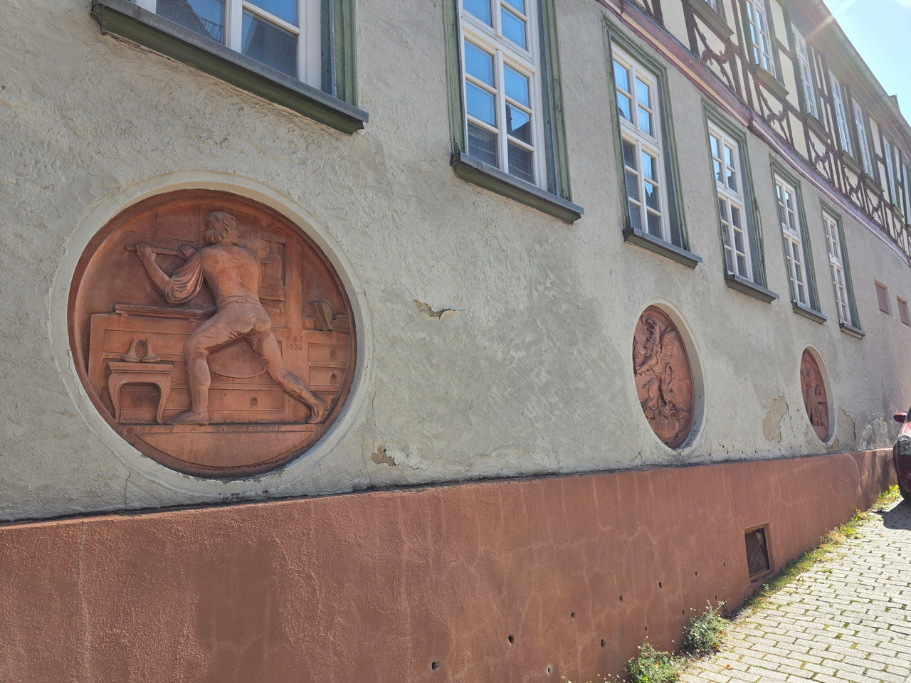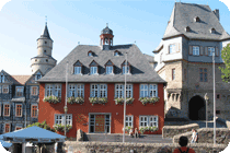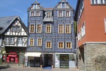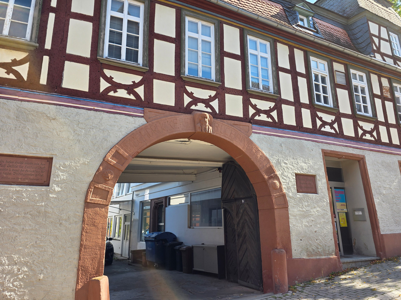 Nach einem Kaffee haben wir uns auf den Weg gemacht in Richtung Altstadt. Wir sind über die Weiherwiese in Richtung Marktplatz gelaufen. Schon in der Weiherwiese haben uns die tollen Fachwerkhäuser tief beeindruckt. Am Marktplatz angekommen fällt der Blick auf den historischen Marktbrunnen. Selbst wenn man sich einmal um die eigene Achse dreht, man sieht ringsherum Fachwerkhäuser, eins schöner als das andere. Wir sind in die Himmelsgasse eingebogen und sind in Richtung Rathaus gelaufen. Hier, auf dem König-Adolf-Platz, steht der Löwenbrunnen, ein weiteres Schmuckstück der Stadt. Hier weiß man gar nicht, wo man zuerst hinschauen soll. Das mächtige Kanzleitor markierte früher die Grenze zwischen der südlichen Bürgerstadt und der nördlichen Residenzstadt. Das Rathausgebäude daneben strahlt in einem leuchtenden Orange. Auf der anderen Seite des Platzes steht eines der schönsten Häuser der Stadt, das Killingerhaus. Es ist sehr reich mit Schnitzkunst verziert. In diesem Gebäude befindet sich die Touristeninformation, die allerdings erst um 14:00 Uhr öffnet. Wir haben bis dahin noch etwas Zeit und gehen darum zuerst in die Rodergasse. Dort fällt sofort ein skurril anmutendes Gebäude auf, das als Schiefes Haus bezeichnete Gebäude. Auch hier kann man über die gewagte Architektur nur staunen. Über den Löherplatz ging es zurück zu der Unionskirche. Sie war offen und wir konnten sie besichtigen. Das ist eine Kirche der besonderen Art, wie man sie nicht so oft zu sehen bekommt. Hier wurde Lahnmarmor für die Arkaden an beiden Seiten des Schiffes und den Säulen verwendet. Auch der barocke Altar ist fast komplett aus Marmor. Ein ganz besonderes Highlight sind die 38 Gemälde, die die Decke und die Brüstungen der Arkadengänge zieren. Von den 38 Gemälden sind 33 von Michael Angelo Immonradt und 5 von Johann von Sandrart. Allein mit diesen Gemälden kann man sich lange Zeit aufhalten. Nach einem kurzen Blick in die kleine Gruft unter dem Chor, dort stehen die Sarkophage des Fürstenpaares, haben wir die Kirche wieder verlassen, um vorbei an weiteren Fachwerkhäusern zu der Touristeninfo zu gehen. Sie hatte nun inzwischen geöffnet und wir konnten unsere Standgebühren bezahlen und uns mit entsprechendem Infomaterial versorgen. Jetzt war es auch langsam Zeit für unseren Nachmittagskaffee. Wir sind zurück zum Womo gelaufen. Unterwegs haben wir unter dem positiven Eindruck dieses Ortes beschlossen, den eingesparten Tag hier anzuhängen und erst am Sonntag wieder abzureisen.