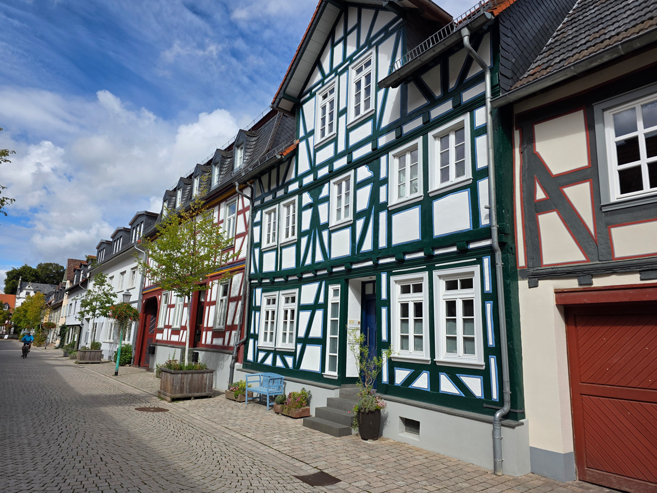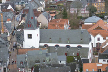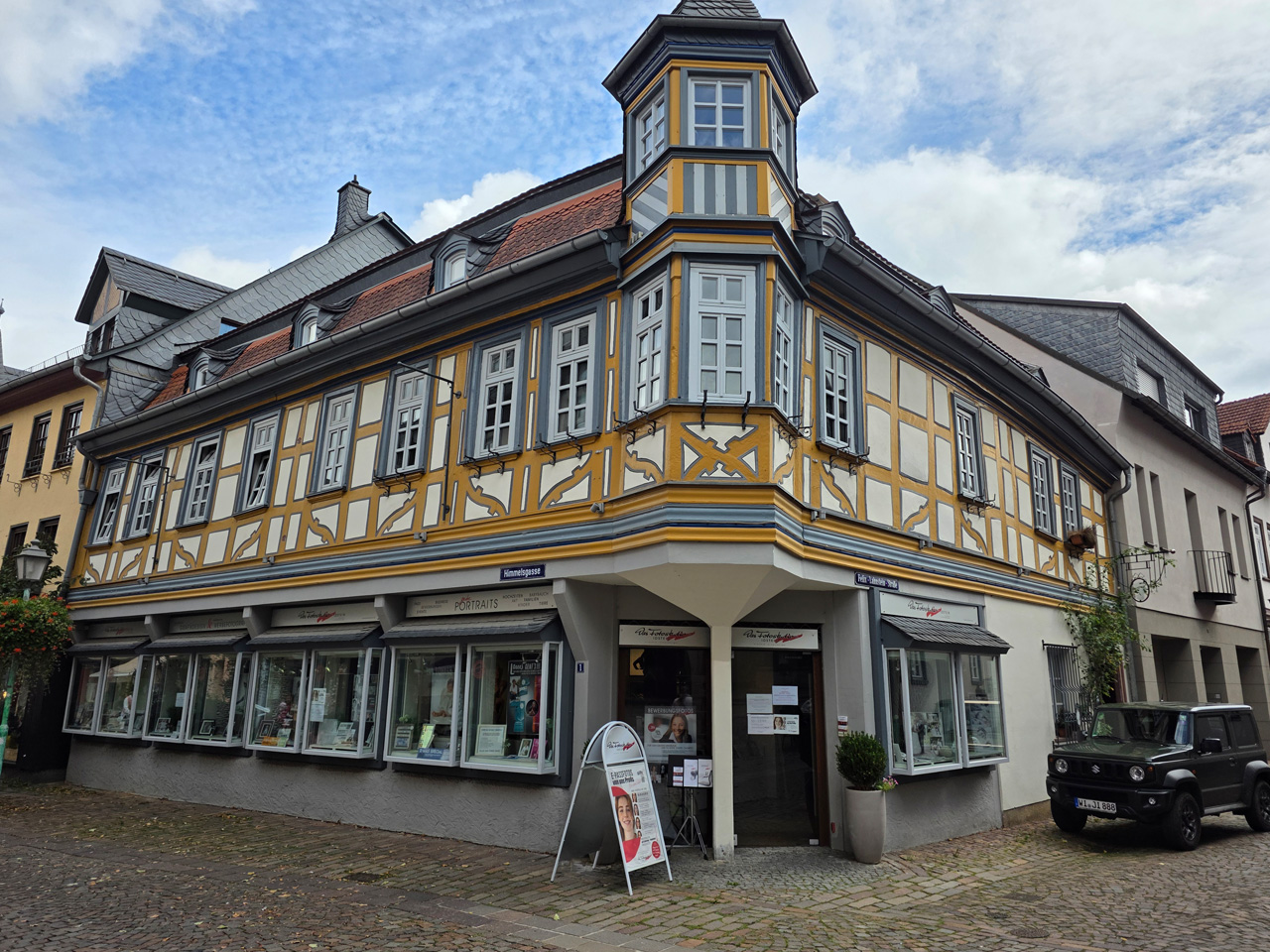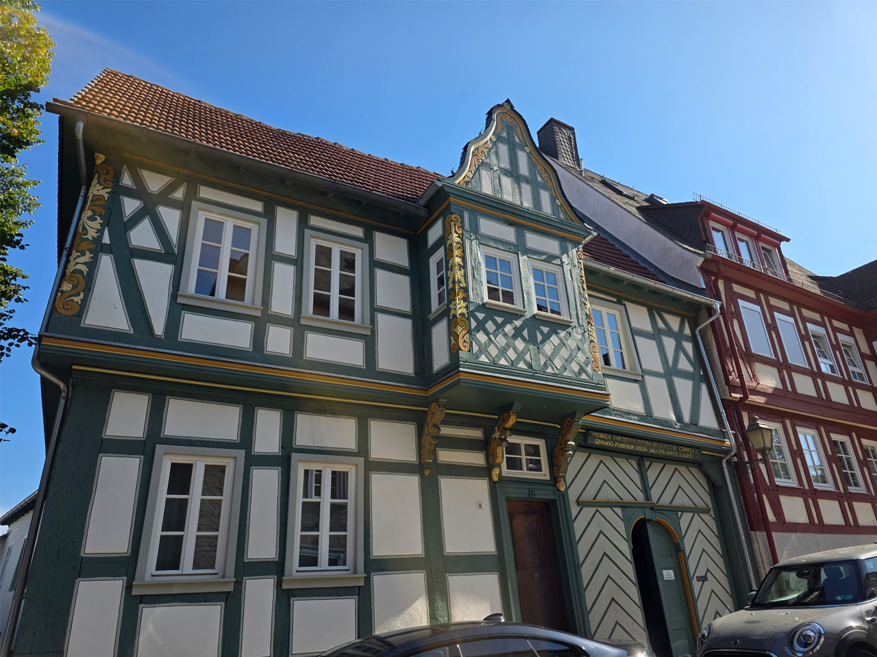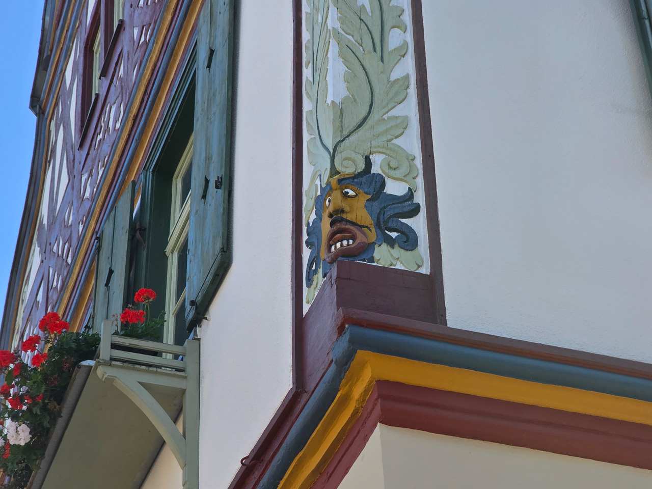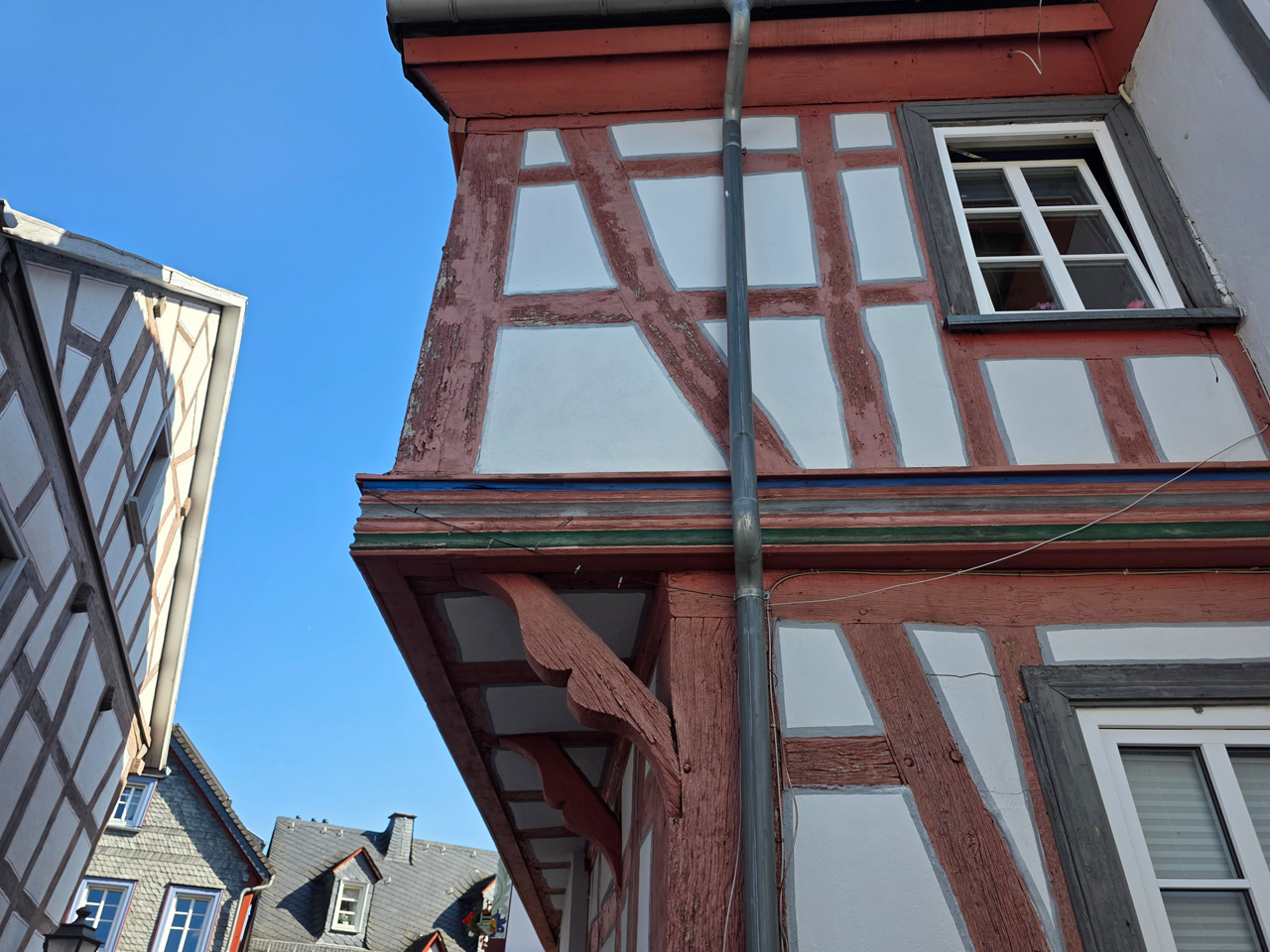Nach einem Kaffee haben wir uns auf den Weg gemacht in Richtung Altstadt. Wir sind über die Weiherwiese in Richtung Marktplatz gelaufen. Schon in der Weiherwiese haben uns die tollen Fachwerkhäuser tief beeindruckt. Am Marktplatz angekommen fällt der Blick auf den historischen Marktbrunnen. Selbst wenn man sich einmal um die eigene Achse dreht, man sieht ringsherum Fachwerkhäuser, eins schöner als das andere. Wir sind in die Himmelsgasse eingebogen und sind in Richtung Rathaus gelaufen. Hier, auf dem König-Adolf-Platz, steht der Löwenbrunnen, ein weiteres Schmuckstück der Stadt. Hier weiß man gar nicht, wo man zuerst hinschauen soll. Das mächtige Kanzleitor markierte früher die Grenze zwischen der südlichen Bürgerstadt und der nördlichen Residenzstadt. Das Rathausgebäude daneben strahlt in einem leuchtenden Orange. Auf der anderen Seite des Platzes steht eines der schönsten Häuser der Stadt, das Killingerhaus. Es ist sehr reich mit Schnitzkunst verziert. In diesem Gebäude befindet sich die Touristeninformation, die allerdings erst um 14:00 Uhr öffnet. Wir haben bis dahin noch etwas Zeit und gehen darum zuerst in die Rodergasse. Dort fällt sofort ein skurril anmutendes Gebäude auf, das als Schiefes Haus bezeichnete Gebäude. Auch hier kann man über die gewagte Architektur nur staunen. Über den Löherplatz ging es zurück zu der Unionskirche. Sie war offen und wir konnten sie besichtigen. Das ist eine Kirche der besonderen Art, wie man sie nicht so oft zu sehen bekommt. Hier wurde Lahnmarmor für die Arkaden an beiden Seiten des Schiffes und den Säulen verwendet. Auch der barocke Altar ist fast komplett aus Marmor. Ein ganz besonderes Highlight sind die 38 Gemälde, die die Decke und die Brüstungen der Arkadengänge zieren. Von den 38 Gemälden sind 33 von Michael Angelo Immonradt und 5 von Johann von Sandrart. Allein mit diesen Gemälden kann man sich lange Zeit aufhalten. Nach einem kurzen Blick in die kleine Gruft unter dem Chor, dort stehen die Sarkophage des Fürstenpaares, haben wir die Kirche wieder verlassen, um vorbei an weiteren Fachwerkhäusern zu der Touristeninfo zu gehen. Sie hatte nun inzwischen geöffnet und wir konnten unsere Standgebühren bezahlen und uns mit entsprechendem Infomaterial versorgen. Jetzt war es auch langsam Zeit für unseren Nachmittagskaffee. Wir sind zurück zum Womo gelaufen. Unterwegs haben wir unter dem positiven Eindruck dieses Ortes beschlossen, den eingesparten Tag hier anzuhängen und erst am Sonntag wieder abzureisen.