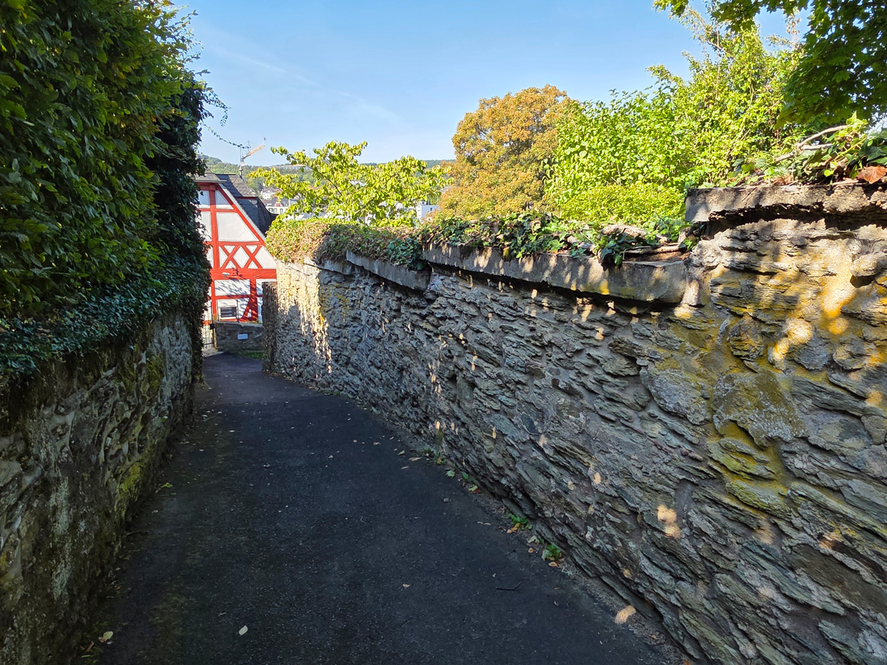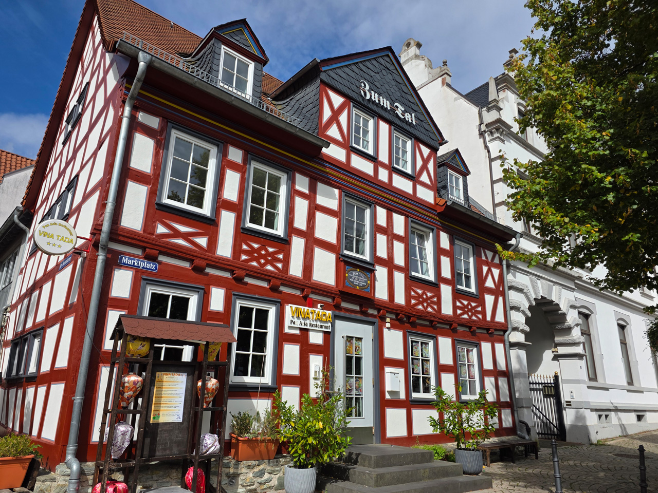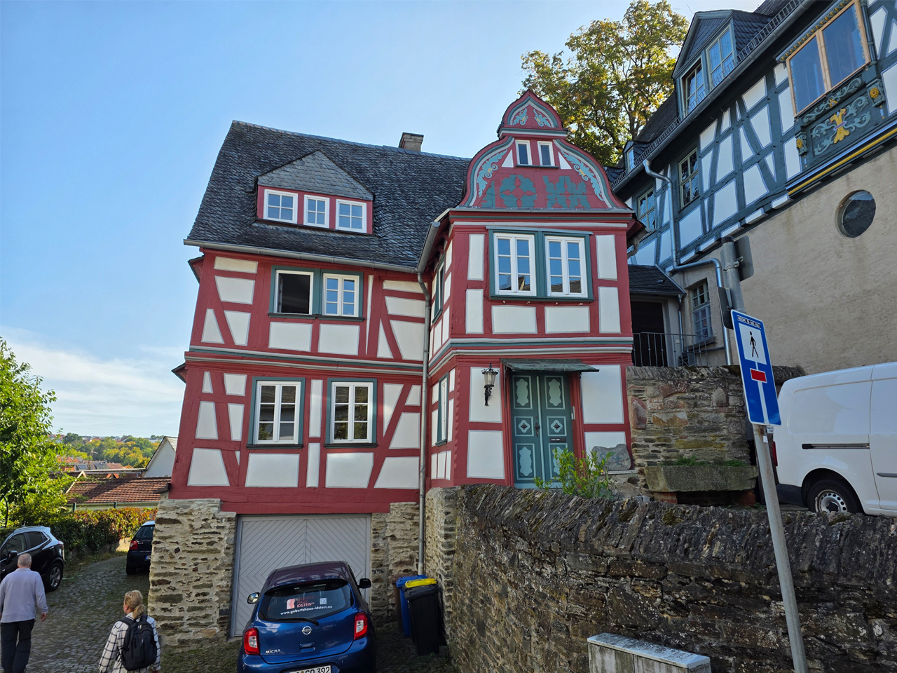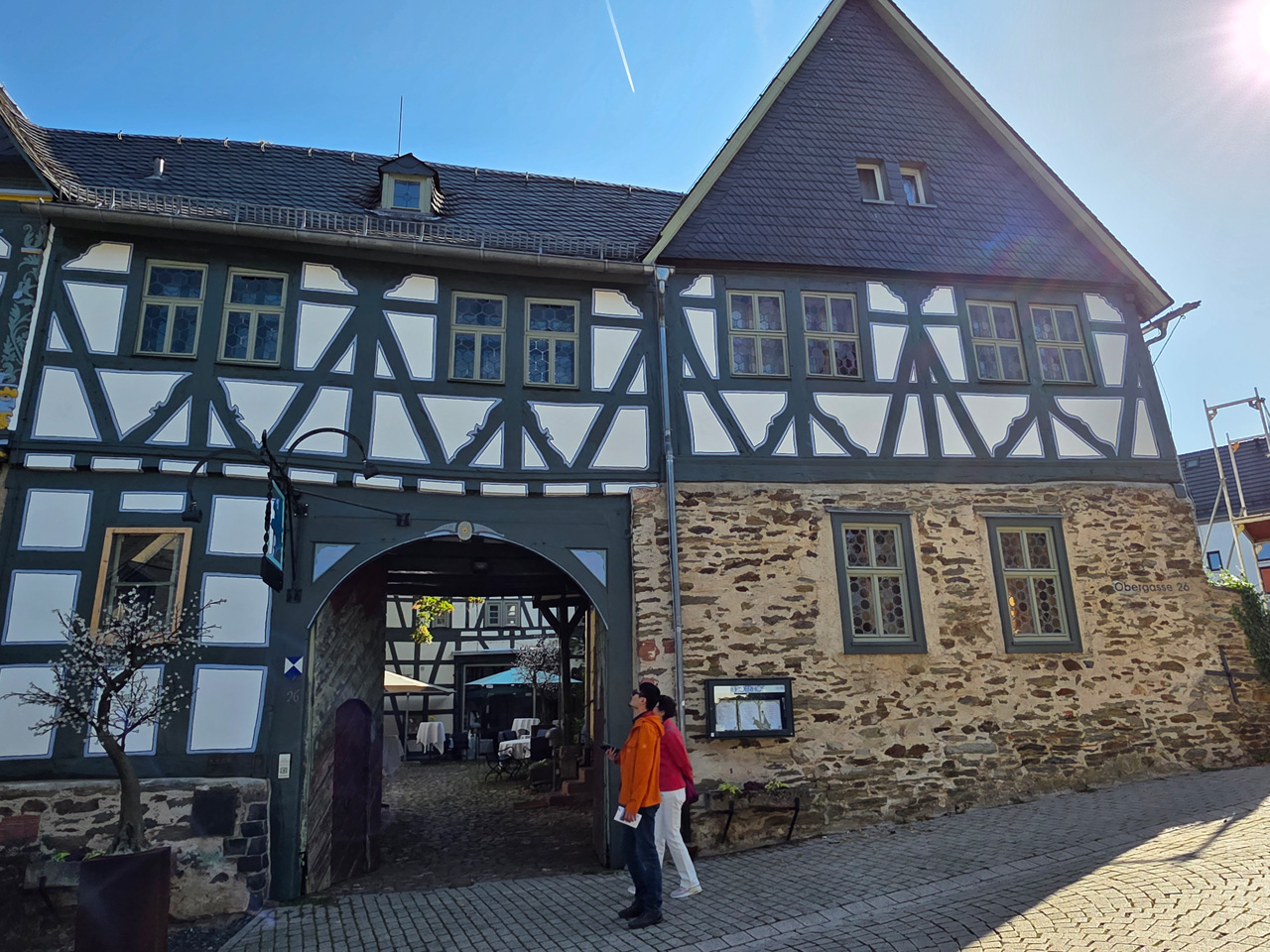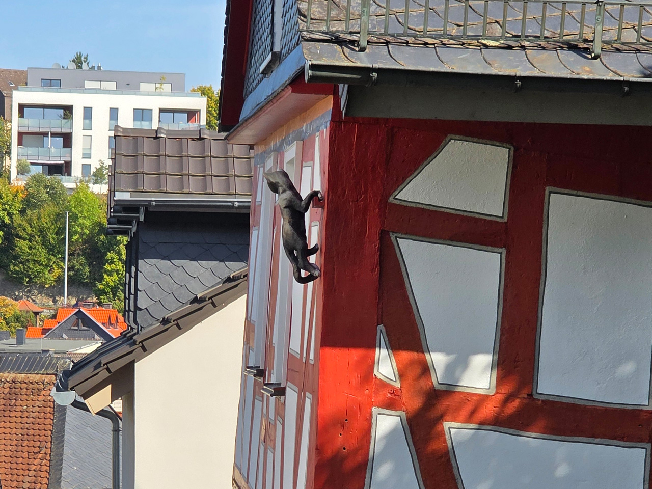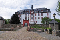 Nach einem Kaffee haben wir uns auf den Weg gemacht in Richtung Altstadt. Wir sind über die Weiherwiese in Richtung Marktplatz gelaufen. Schon in der Weiherwiese haben uns die tollen Fachwerkhäuser tief beeindruckt. Am Marktplatz angekommen fällt der Blick auf den historischen Marktbrunnen. Selbst wenn man sich einmal um die eigene Achse dreht, man sieht ringsherum Fachwerkhäuser, eins schöner als das andere. Wir sind in die Himmelsgasse eingebogen und sind in Richtung Rathaus gelaufen. Hier, auf dem König-Adolf-Platz, steht der Löwenbrunnen, ein weiteres Schmuckstück der Stadt. Hier weiß man gar nicht, wo man zuerst hinschauen soll. Das mächtige Kanzleitor markierte früher die Grenze zwischen der südlichen Bürgerstadt und der nördlichen Residenzstadt. Das Rathausgebäude daneben strahlt in einem leuchtenden Orange. Auf der anderen Seite des Platzes steht eines der schönsten Häuser der Stadt, das Killingerhaus. Es ist sehr reich mit Schnitzkunst verziert. In diesem Gebäude befindet sich die Touristeninformation, die allerdings erst um 14:00 Uhr öffnet. Wir haben bis dahin noch etwas Zeit und gehen darum zuerst in die Rodergasse. Dort fällt sofort ein skurril anmutendes Gebäude auf, das als Schiefes Haus bezeichnete Gebäude. Auch hier kann man über die gewagte Architektur nur staunen. Über den Löherplatz ging es zurück zu der Unionskirche. Sie war offen und wir konnten sie besichtigen. Das ist eine Kirche der besonderen Art, wie man sie nicht so oft zu sehen bekommt. Hier wurde Lahnmarmor für die Arkaden an beiden Seiten des Schiffes und den Säulen verwendet. Auch der barocke Altar ist fast komplett aus Marmor. Ein ganz besonderes Highlight sind die 38 Gemälde, die die Decke und die Brüstungen der Arkadengänge zieren. Von den 38 Gemälden sind 33 von Michael Angelo Immonradt und 5 von Johann von Sandrart. Allein mit diesen Gemälden kann man sich lange Zeit aufhalten. Nach einem kurzen Blick in die kleine Gruft unter dem Chor, dort stehen die Sarkophage des Fürstenpaares, haben wir die Kirche wieder verlassen, um vorbei an weiteren Fachwerkhäusern zu der Touristeninfo zu gehen. Sie hatte nun inzwischen geöffnet und wir konnten unsere Standgebühren bezahlen und uns mit entsprechendem Infomaterial versorgen. Jetzt war es auch langsam Zeit für unseren Nachmittagskaffee. Wir sind zurück zum Womo gelaufen. Unterwegs haben wir unter dem positiven Eindruck dieses Ortes beschlossen, den eingesparten Tag hier anzuhängen und erst am Sonntag wieder abzureisen.