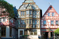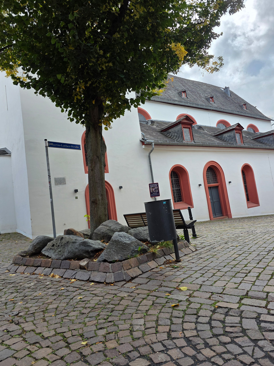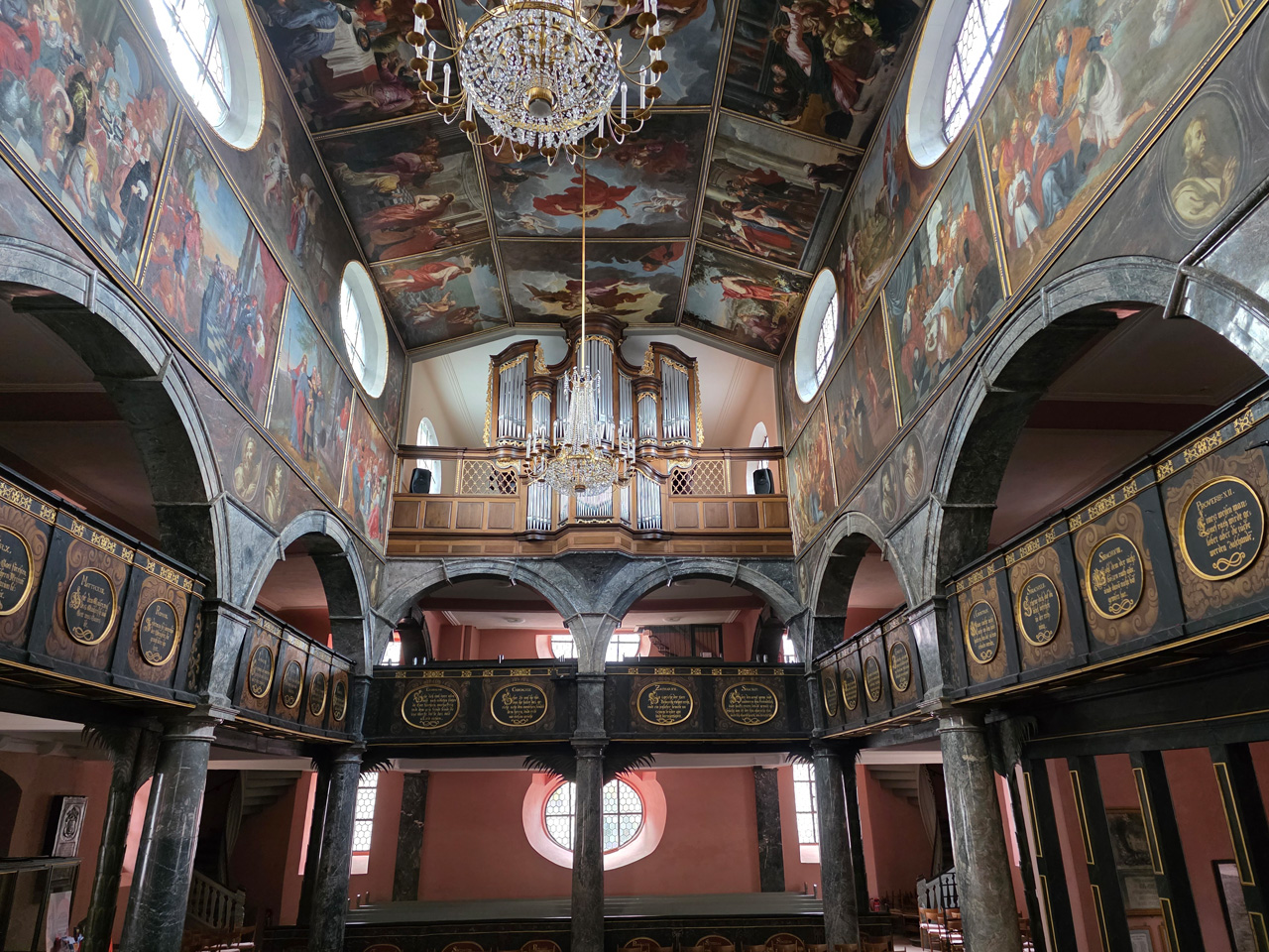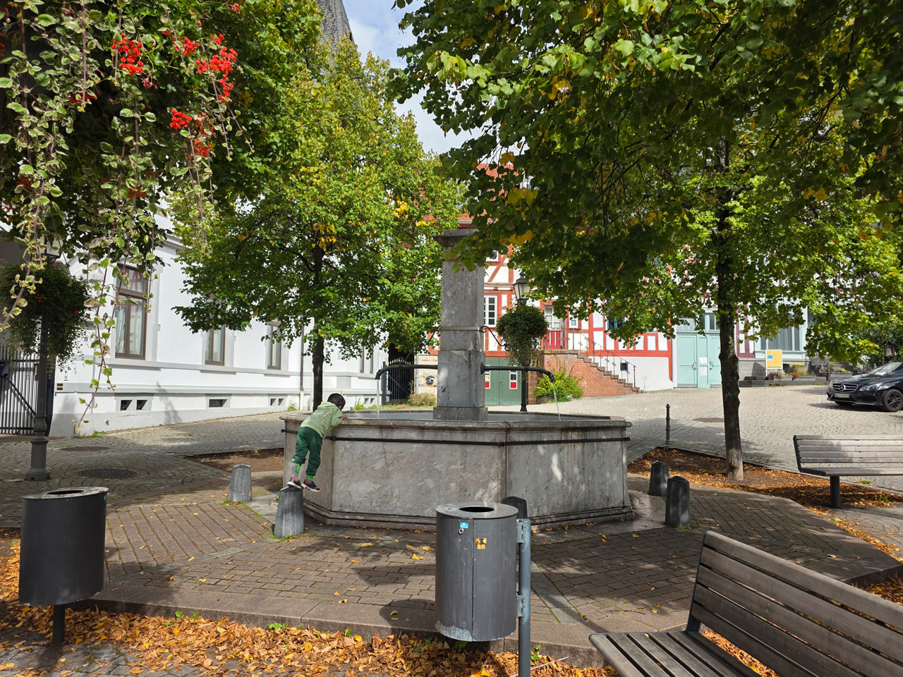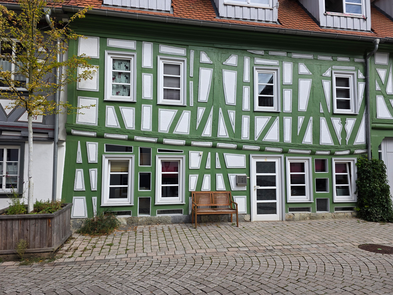 Nach einem Kaffee haben wir uns auf den Weg gemacht in Richtung Altstadt. Wir sind über die Weiherwiese in Richtung Marktplatz gelaufen. Schon in der Weiherwiese haben uns die tollen Fachwerkhäuser tief beeindruckt. Am Marktplatz angekommen fällt der Blick auf den historischen Marktbrunnen. Selbst wenn man sich einmal um die eigene Achse dreht, man sieht ringsherum Fachwerkhäuser, eins schöner als das andere. Wir sind in die Himmelsgasse eingebogen und sind in Richtung Rathaus gelaufen. Hier, auf dem König-Adolf-Platz, steht der Löwenbrunnen, ein weiteres Schmuckstück der Stadt. Hier weiß man gar nicht, wo man zuerst hinschauen soll. Das mächtige Kanzleitor markierte früher die Grenze zwischen der südlichen Bürgerstadt und der nördlichen Residenzstadt. Das Rathausgebäude daneben strahlt in einem leuchtenden Orange. Auf der anderen Seite des Platzes steht eines der schönsten Häuser der Stadt, das Killingerhaus. Es ist sehr reich mit Schnitzkunst verziert. In diesem Gebäude befindet sich die Touristeninformation, die allerdings erst um 14:00 Uhr öffnet. Wir haben bis dahin noch etwas Zeit und gehen darum zuerst in die Rodergasse. Dort fällt sofort ein skurril anmutendes Gebäude auf, das als Schiefes Haus bezeichnete Gebäude. Auch hier kann man über die gewagte Architektur nur staunen. Über den Löherplatz ging es zurück zu der Unionskirche. Sie war offen und wir konnten sie besichtigen. Das ist eine Kirche der besonderen Art, wie man sie nicht so oft zu sehen bekommt. Hier wurde Lahnmarmor für die Arkaden an beiden Seiten des Schiffes und den Säulen verwendet. Auch der barocke Altar ist fast komplett aus Marmor. Ein ganz besonderes Highlight sind die 38 Gemälde, die die Decke und die Brüstungen der Arkadengänge zieren. Von den 38 Gemälden sind 33 von Michael Angelo Immonradt und 5 von Johann von Sandrart. Allein mit diesen Gemälden kann man sich lange Zeit aufhalten. Nach einem kurzen Blick in die kleine Gruft unter dem Chor, dort stehen die Sarkophage des Fürstenpaares, haben wir die Kirche wieder verlassen, um vorbei an weiteren Fachwerkhäusern zu der Touristeninfo zu gehen. Sie hatte nun inzwischen geöffnet und wir konnten unsere Standgebühren bezahlen und uns mit entsprechendem Infomaterial versorgen. Jetzt war es auch langsam Zeit für unseren Nachmittagskaffee. Wir sind zurück zum Womo gelaufen. Unterwegs haben wir unter dem positiven Eindruck dieses Ortes beschlossen, den eingesparten Tag hier anzuhängen und erst am Sonntag wieder abzureisen.