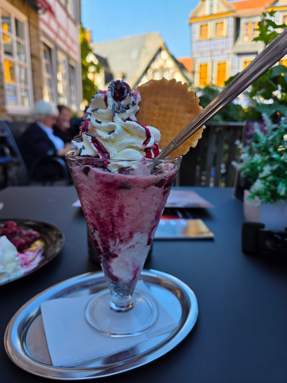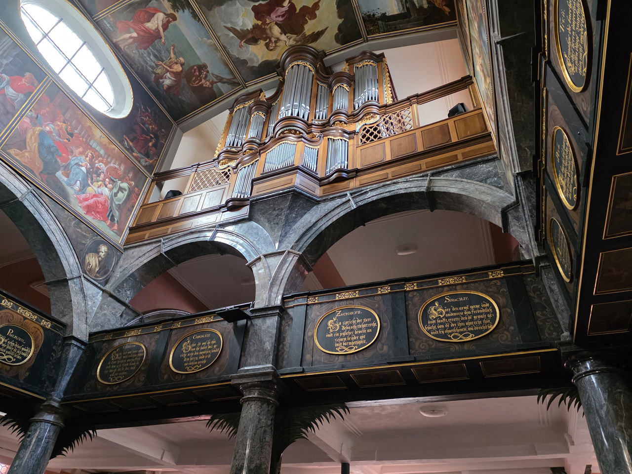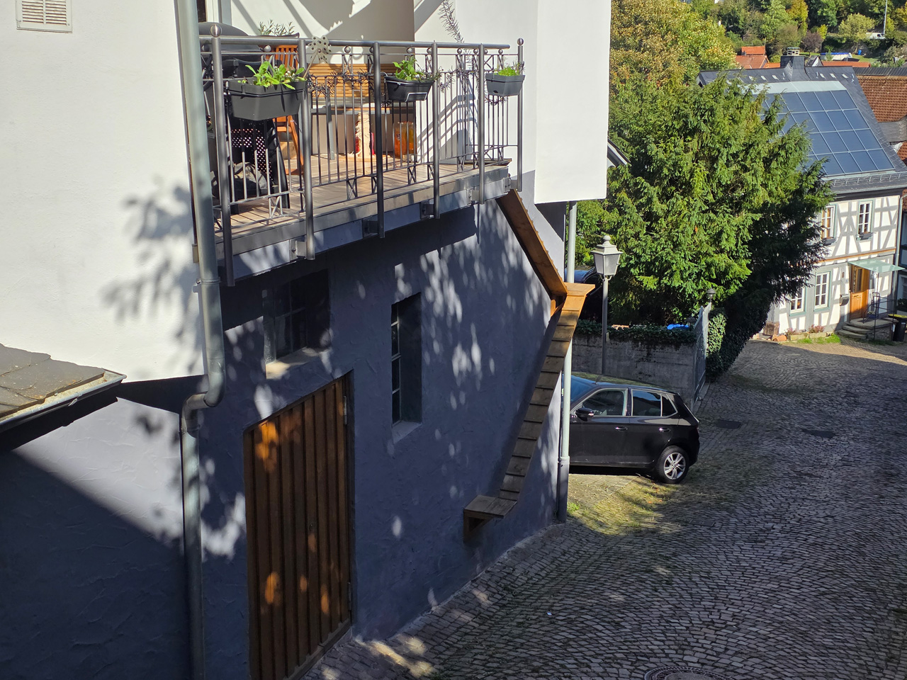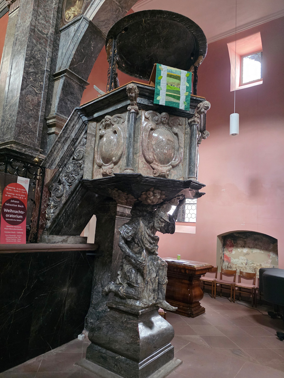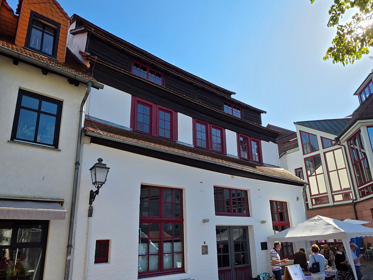 Nach einem Kaffee haben wir uns auf den Weg gemacht in Richtung Altstadt. Wir sind über die Weiherwiese in Richtung Marktplatz gelaufen. Schon in der Weiherwiese haben uns die tollen Fachwerkhäuser tief beeindruckt. Am Marktplatz angekommen fällt der Blick auf den historischen Marktbrunnen. Selbst wenn man sich einmal um die eigene Achse dreht, man sieht ringsherum Fachwerkhäuser, eins schöner als das andere. Wir sind in die Himmelsgasse eingebogen und sind in Richtung Rathaus gelaufen. Hier, auf dem König-Adolf-Platz, steht der Löwenbrunnen, ein weiteres Schmuckstück der Stadt. Hier weiß man gar nicht, wo man zuerst hinschauen soll. Das mächtige Kanzleitor markierte früher die Grenze zwischen der südlichen Bürgerstadt und der nördlichen Residenzstadt. Das Rathausgebäude daneben strahlt in einem leuchtenden Orange. Auf der anderen Seite des Platzes steht eines der schönsten Häuser der Stadt, das Killingerhaus. Es ist sehr reich mit Schnitzkunst verziert. In diesem Gebäude befindet sich die Touristeninformation, die allerdings erst um 14:00 Uhr öffnet. Wir haben bis dahin noch etwas Zeit und gehen darum zuerst in die Rodergasse. Dort fällt sofort ein skurril anmutendes Gebäude auf, das als Schiefes Haus bezeichnete Gebäude. Auch hier kann man über die gewagte Architektur nur staunen. Über den Löherplatz ging es zurück zu der Unionskirche. Sie war offen und wir konnten sie besichtigen. Das ist eine Kirche der besonderen Art, wie man sie nicht so oft zu sehen bekommt. Hier wurde Lahnmarmor für die Arkaden an beiden Seiten des Schiffes und den Säulen verwendet. Auch der barocke Altar ist fast komplett aus Marmor. Ein ganz besonderes Highlight sind die 38 Gemälde, die die Decke und die Brüstungen der Arkadengänge zieren. Von den 38 Gemälden sind 33 von Michael Angelo Immonradt und 5 von Johann von Sandrart. Allein mit diesen Gemälden kann man sich lange Zeit aufhalten. Nach einem kurzen Blick in die kleine Gruft unter dem Chor, dort stehen die Sarkophage des Fürstenpaares, haben wir die Kirche wieder verlassen, um vorbei an weiteren Fachwerkhäusern zu der Touristeninfo zu gehen. Sie hatte nun inzwischen geöffnet und wir konnten unsere Standgebühren bezahlen und uns mit entsprechendem Infomaterial versorgen. Jetzt war es auch langsam Zeit für unseren Nachmittagskaffee. Wir sind zurück zum Womo gelaufen. Unterwegs haben wir unter dem positiven Eindruck dieses Ortes beschlossen, den eingesparten Tag hier anzuhängen und erst am Sonntag wieder abzureisen.