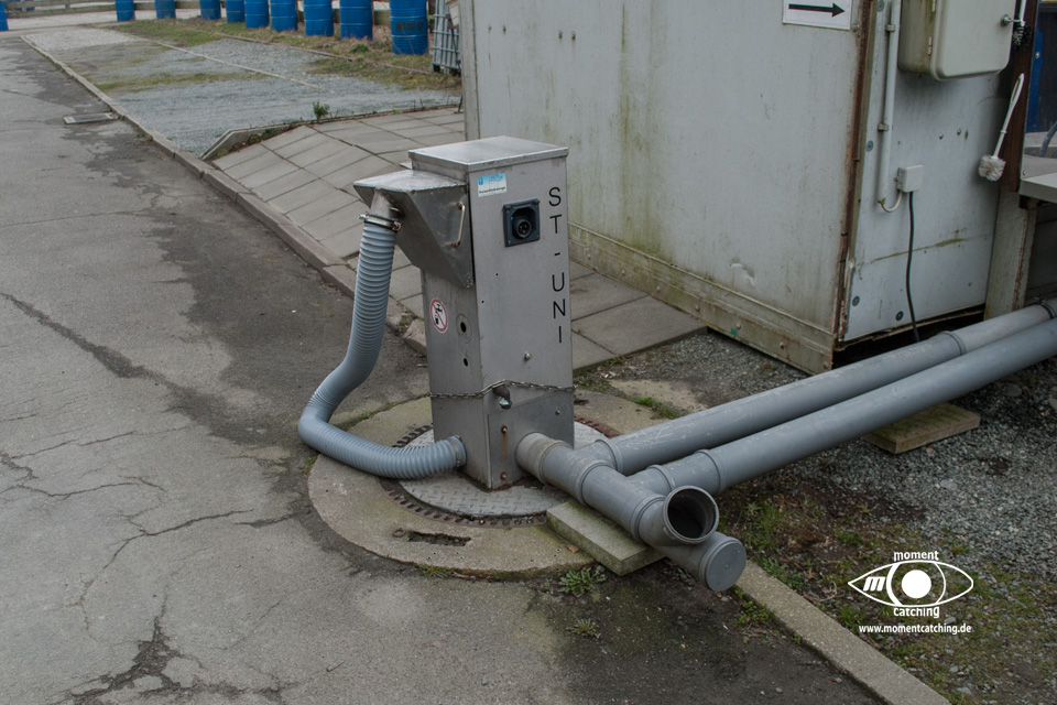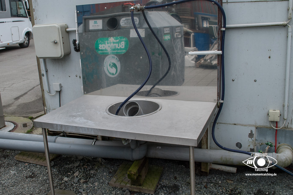 - Die V+E ist ssehr abenteuerlich gestaltet. Für die Fäkalienentsorgung erfolgt über eine VA-Wanne. Grauwasser muss über eine bewegliche Wanne mit einem großen Schlauch entsorgt werden.