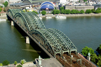 Die Hohenzollernbrücke ist eine Brücke über den Rhein in Köln in Höhe von Stromkilometer 688,5. Das von 1907 bis 1911 errichtete ursprüngliche Bauwerk bestand aus zwei Eisenbahn- und einer Straßenbrücke. Nach 1945 erfolgte der Wiederaufbau nur noch für zwei Eisenbahnbrücken, die später um eine dritte ergänzt wurden. Als Ersatz für die entfallene Straßenbrücke wurden die äußeren Eisenbahnbrücken um Geh- und Radwege ergänzt. Bei der Hohenzollernbrücke und dem benachbarten Hauptbahnhof handelt es sich um einen der wichtigsten Knotenpunkte im deutschen und europäischen Eisenbahnnetz. Das Bauwerk gehört als fester Bestandteil zum Stadtbild von Köln und dem Kölner Dom. Mit 1220 Zugfahrten pro Tag ist sie die meistbefahrene Eisenbahnbrücke Deutschlands. Das Bauwerk gilt, zusammen mit dem Kölner Hauptbahnhof, als zentraler Engpass im Schienenverkehr in der Region Köln. Auf der Brücke breitete sich seit Spätsommer 2008 der aus Italien stammende Brauch der Liebesschlösser aus. Die in diesem Zusammenhang gelegentlich auftauchende Frage nach Gewicht und Anzahl der Schlösser wurde unterschiedlich beantwortet, Schätzungen sollen sich zwischen zwei (April 2011) und 15 Tonnen (September 2011) bewegen, bei einer Anzahl von angeblich 40.000 Schlössern. Die Bahn sah bei beiden Gewichtsangaben keine Gefahr für die Brückenstatik.