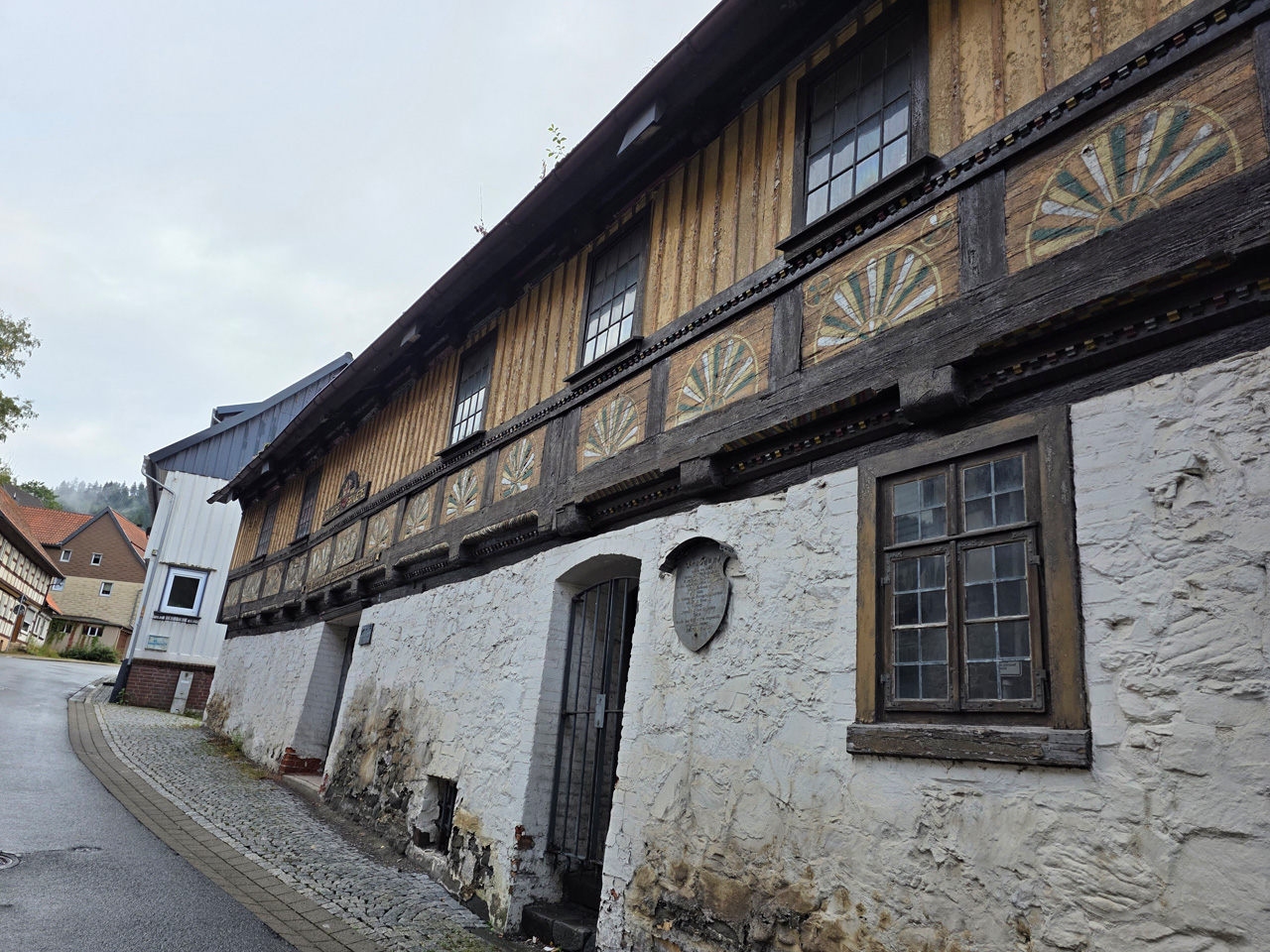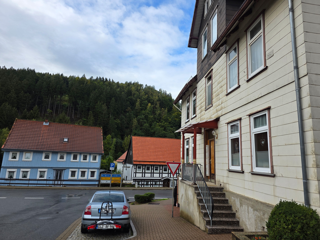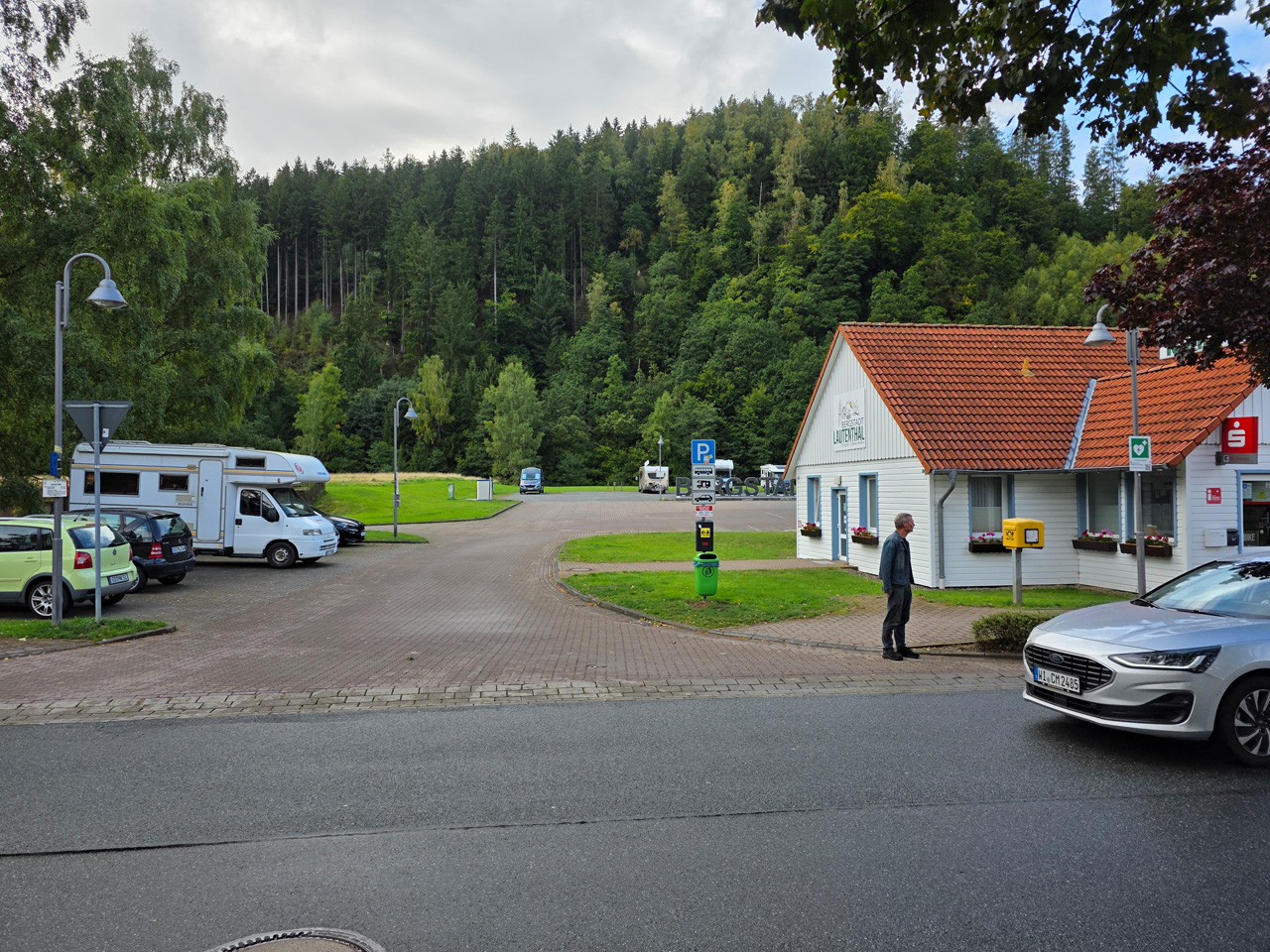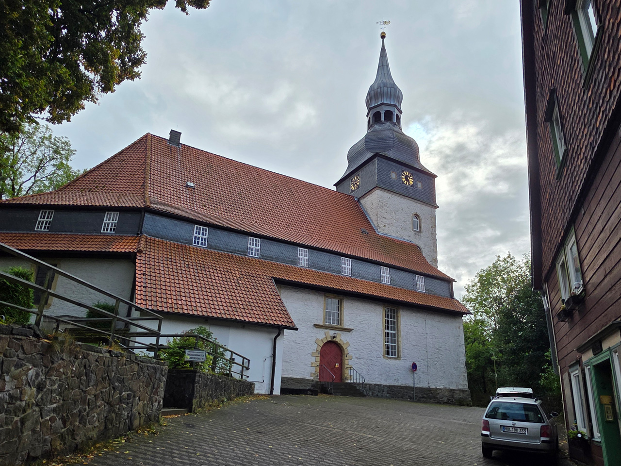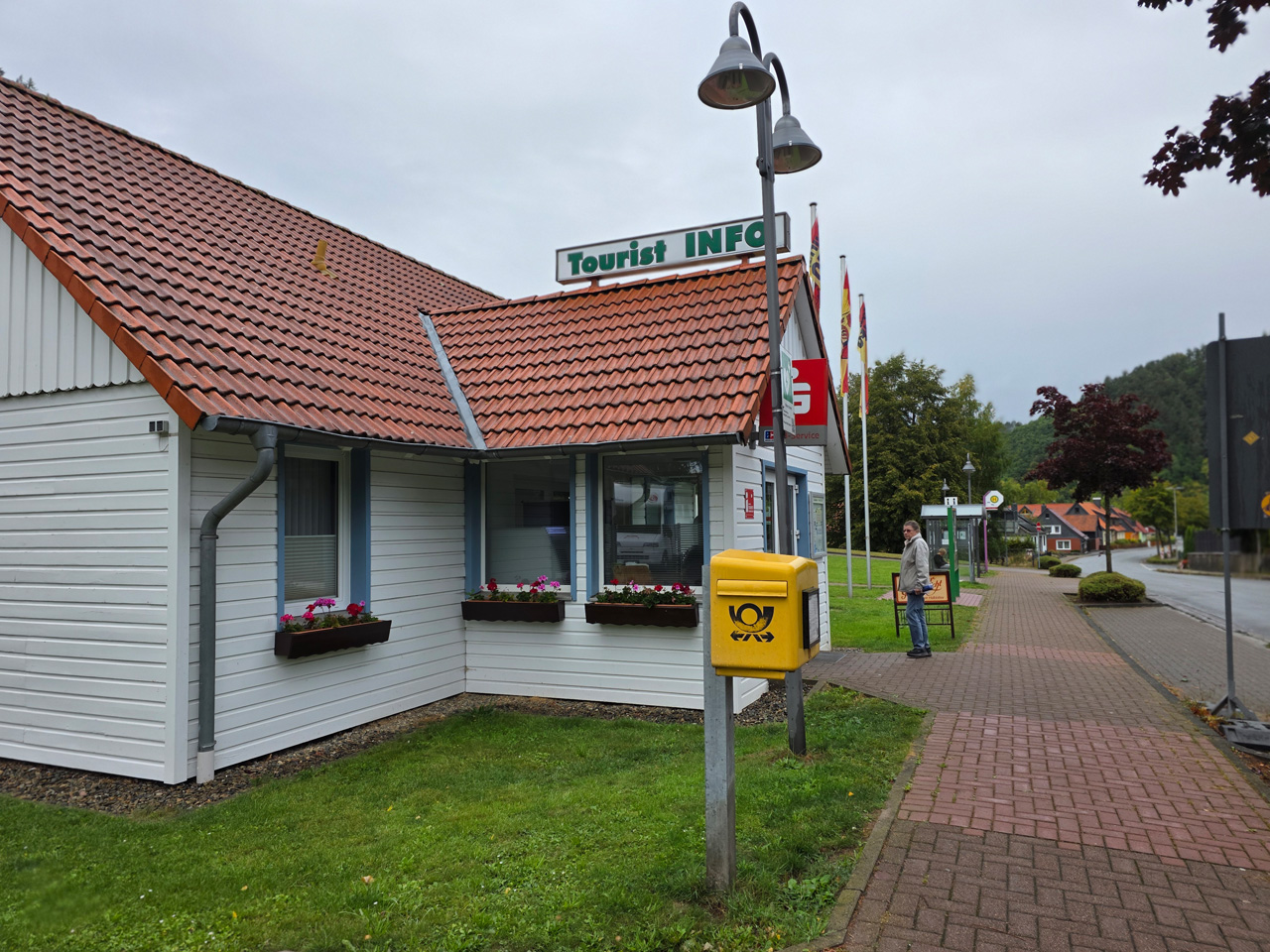Der Wetterbericht sollte Recht behalten. Gegen 15:00 Uhr hörte der Regen tatsächlich auf. Wir sind zu einem kurzen Erkundungsspaziergang gestartet. Die Touristeninformation ist direkt am Platz. Wir haben dort die Stellplatzgebühren bezahlt, allerdings erstmal nur für drei Tage. Verlängern können wir ja immer noch. Der Ortsspaziergang hat uns gezeigt, das man hier kein Geld im Überfluss hat. Teilweise sehen Häuser aus, als ob sie nicht bewohnt sind. Die meisten Gebäude sind in einem traurigen Instandhaltungszustand. Geschäfte gibt es keine mehr. Auch der größte Teil ehemaliger Gaststätten ist geschlossen. Die Paul-Gerhardt-Kirche, die auch von außen einen guten Eindruck macht war sogar geöffnet. Uns offenbarte sich eine Kirche mit historischem Outfit. Beeindruckend ist der zweistöckige Kanzelaltar. Er stammt von 1719 und wurde 1966 rekonstruiert. Auf seiner hohen Predella wird das Abendmahl so wie ein Schweinskopf und Judas mit einem Geldbeutel gezeigt. Das Taufbecken stammt noch aus der alten Holzkirche. Die doppelgeschossigen Emporen haben Brüstungen aus Balustern und werden von verzierten Pfeilern getragen. Die Orgel mit 22 Registern wurde 1684 von Johann Friedrich Besser gebaut. Eine sehr sehenswerte Kirche. Von der Kirche sind wir zu dem Marktplatz gelaufen. Er zeugt noch von der Zeit, wo Lautenthal eine wohlhabendere Stadt war. Hier steht auch das alte Rathaus, in dem sich heute ein Hotel befindet. Fast alle Gebäude hatten hier früher eine direkte Verbindung zum Bergbau. Man merkt hier sehr deutlich, dass die Jugend fehlt. Sie ist anscheinend mit dem Sterben des Bergbaues verschwunden. Wir sind zurück zum Womo. In der Zwischenzeit war sogar die Bewölkung etwas aufgerissen und zwischendurch zeigte sich die Sonne auch Mal.