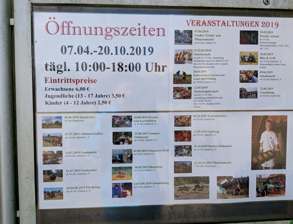 Historische Landwirtschaft und altes Handwerk sind die Schwerpunkte des Museums[8]. Das Hauptgebäude beherbergt alte Geräte der Hauswirtschaft und Werkzeuge. In der Maschinenhalle und der Feldscheune sind landwirtschaftliche Geräte (1850–1960) wie Trecker, Mähdrescher und Feldbearbeitungsgeräte zu besichtigen. Auf dem Hofplatz befinden sich ein Brunnen aus dem Jahr 1797 sowie Geräte zum Ausprobieren, beispielsweise Schleifsteine, Mahlsteine, ein Balken zum Durchbohren mit Muskelkraft. Heimische Haustiere lassen sich streicheln. Es werden alle Getreidesorten und auch Tabak, Senf und Hanf angebaut. Bauerngarten und Kräuterspirale laden zum Staunen ein. Der Naturlehrpfad mit über 362 verschiedenen Arten von Waldbäumen, Büschen und 236 verschiedenen alten Obstbaumsorten (alle im Hochstamm) auf 2,4 km Länge führt unter anderem zu Teichbiotopen, zum Steingeschiebegarten und dem Duft- und Färbergarten.
