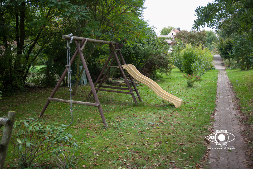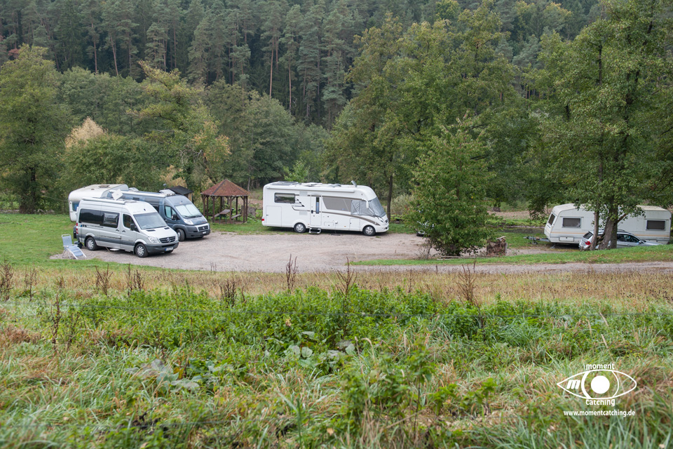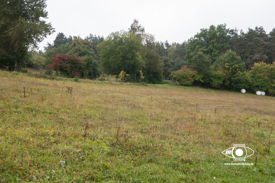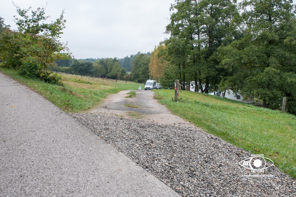 - Das Gelände liegt etwas versteckt hinter der Gotzenmühle. Man muss an dem Gebäudeareal vorbeifahren, eine kleines Stück den Hang hoch, um dann wieder runter auf den Platz zu kommen. Ein kleiner Bereich ist geschottert, der Rest ist Wiese und die ist sehr uneben.