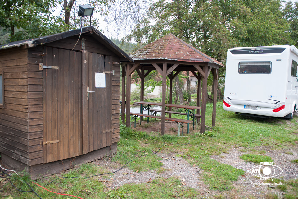 - Die Steckdosen (Cee) befinden sich in einer kleinen Holzhütte.