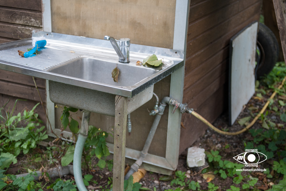 - An der Außenwand der Hütte ist ein Waschbecken, an dem seitlich auch ein Wasseranschluss für Frischwasser ist.