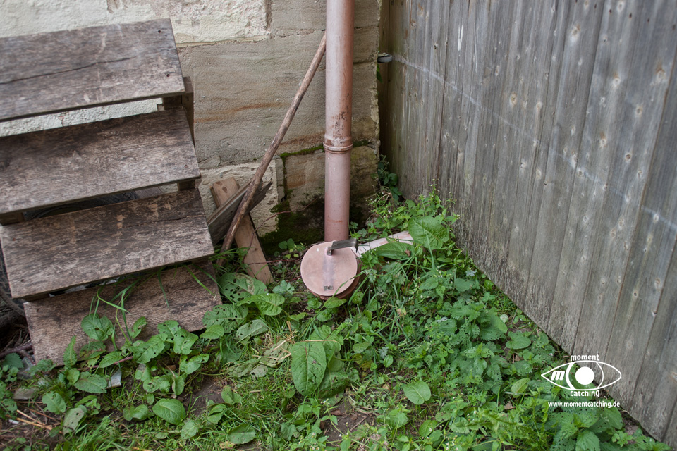 - Die Fäkalienentsorgung ist etwas abenteuerlich, sie befindet sich an einer Durchfahrt zwischen zwei Scheunen. Sie soll auch für Grauwasser genutzt werden, was aber nur mit Eimer oder mit einer Schüssel geht. Wasser zum Spülen gibt es an einem Wirtschaftsgebäude.