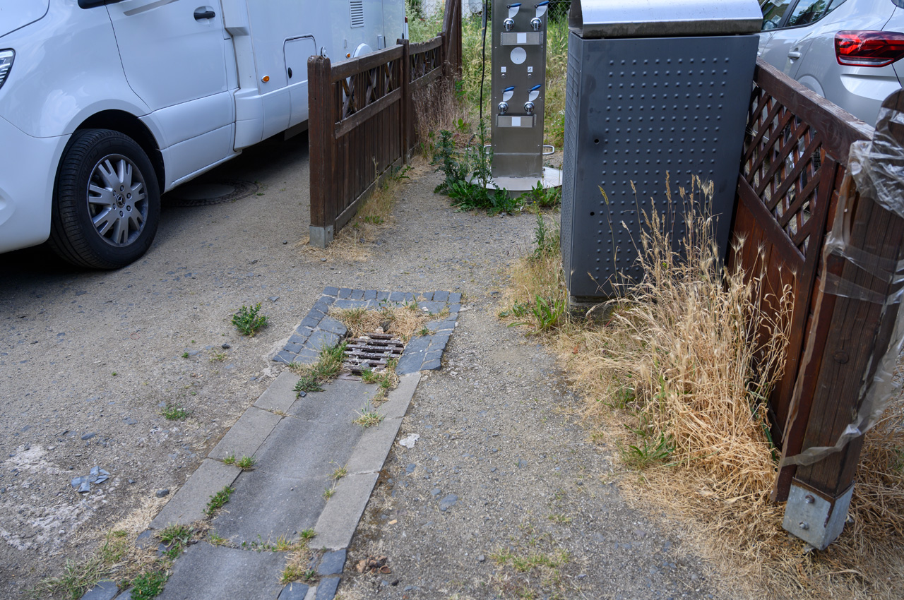 - Die Fäkalienentsorgung kann an beiden Strom und Wassersäulen erfolgen. Es gibt am Boden einen aufklappbaren Deckel. Das Grauwasser geht über eine Rinne in einen Gullydeckel. Für uns nur über Schlauch benutzbar.