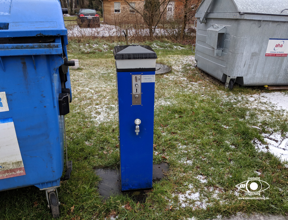 - Dort ist ein kleines Holzhäuschen für die Platzaufsicht, die nur zeitweilig besetzt ist. Davor steht der Automat zum bezahlen der Stellplatzgebühren und des Stromgeldes. Der Automat nimmt auch Scheine.