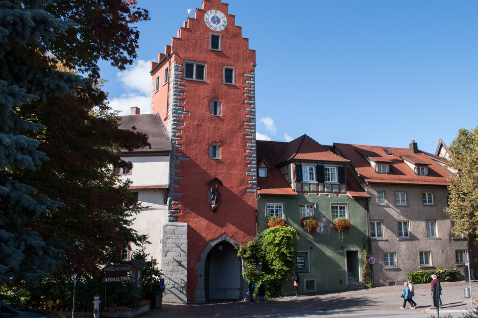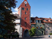 Die Unterstadt zwischen See und Oberstadt mit Altem Schloss war befestigt im Westen durch das Vordere Seetor (Unterstadttor oder Kugelwehrtor) und im Osten durch das Hintere Seetor, das wegen des Baus des Hafens 1852 abgebrochen wurde.[94] In der Unterstadt sind von der westlichen Stadtmauer die Außenmauer des heutigen Hotels Schiff (ehemaliger Domkapitelshof) und von der östlichen Stadtmauer die Außenmauer des Gredhauses erhalten.