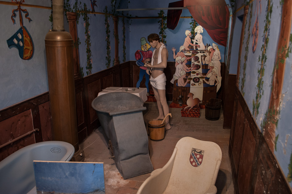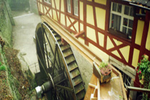 Eng in den Sandsteinfels eingezwängt wurde hier bis 1952 die Wasserkraft eines kleinen Bächleins genutzt. Zur Erhöhung des Wirkungsgrades wird das Wasser über ein Gerinne auf ein oberschlächtiges Rad geleitet. Mit einem Durchmesser von 7,80 m gehört es zu den größten noch im Gebrauch stehenden Wasserrädern Mitteleuropas.