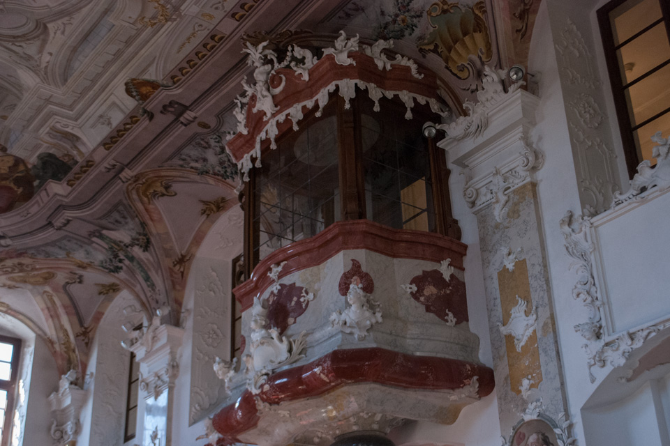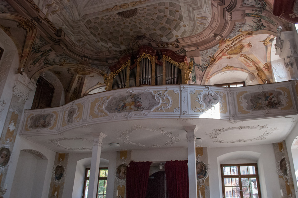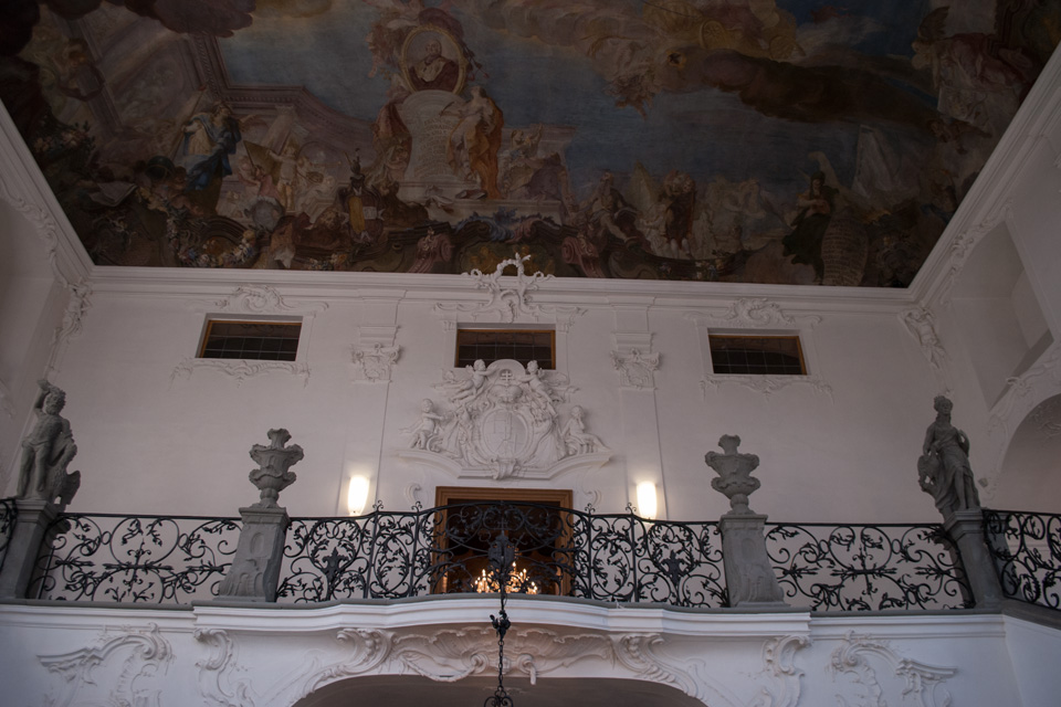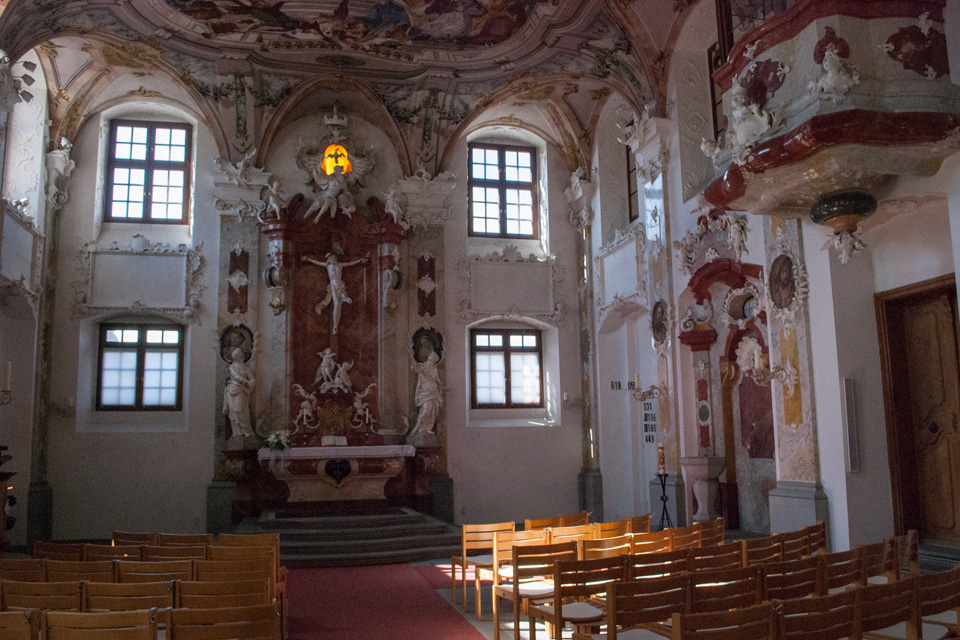 1741 bis 1743 folgte der Einbau der Schlosskapelle, ebenfalls nach dem Entwurf von Balthasar Neumann, die Ausstattung ist das Werk des Freskenmalers Gottfried Bernhard Göz aus Augsburg (1708–1774) und des Stuckateurs Joseph Anton Feuchtmayer (1696–1770).