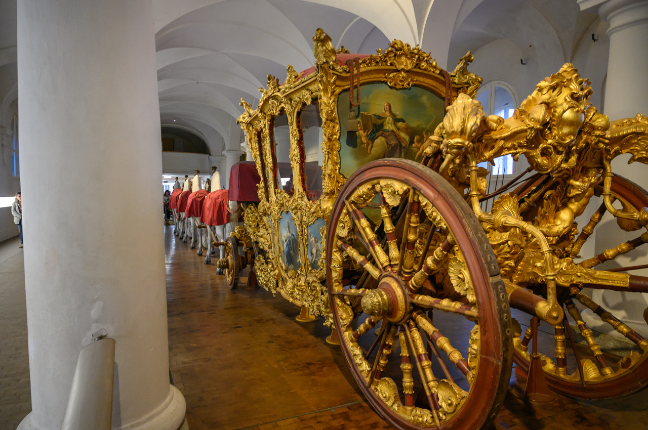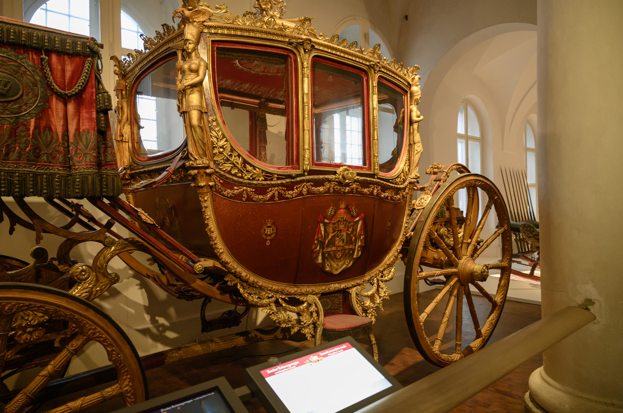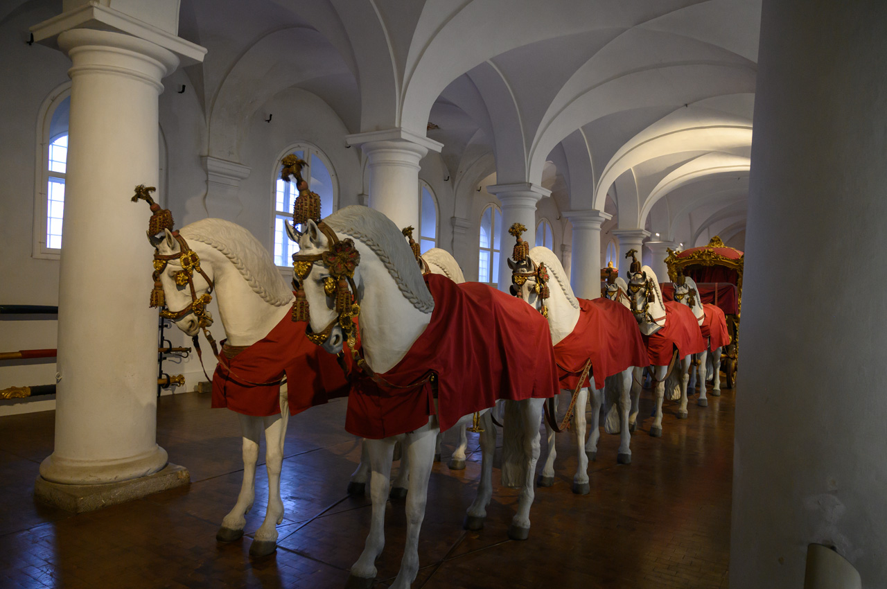 Nun hatten wir nur noch das Marstallmuseum auf unserem Programm. Die Vielzahl an Kutschen hat uns anfänglich überfordert. Wieder dieser überbordende Prunk. Gold, wohin das Auge fällt und nicht nur beschränkt auf die Kutschen, nein auch die Bespannung der Pferde war prunkvoll und kunstvoll. Genauso beeindruckend war auch die Porzellanausstellung im ersten Stockwerk des Gebäudes. Gold ist hier die dominierende Farbe und das dominierende Material.
