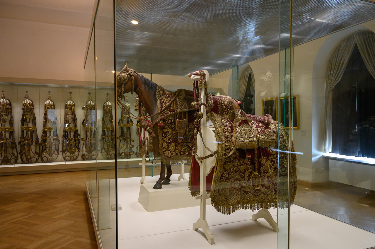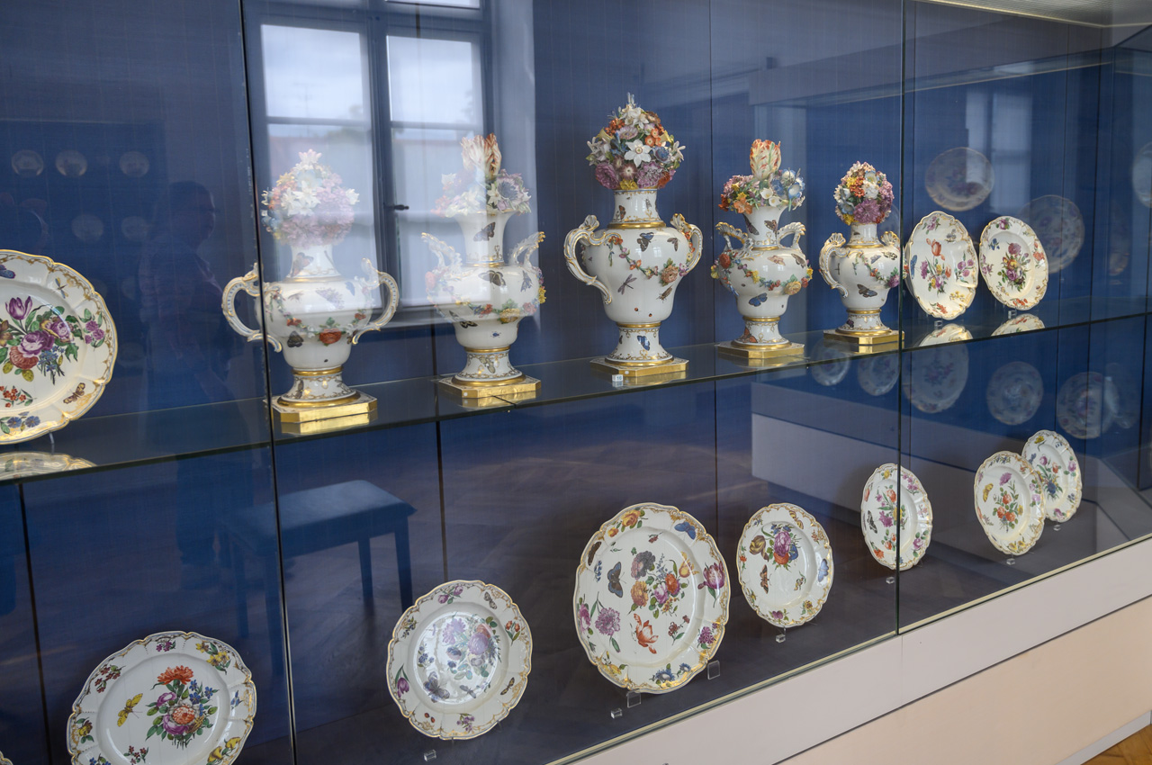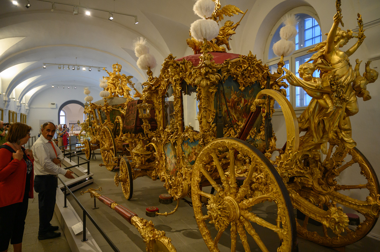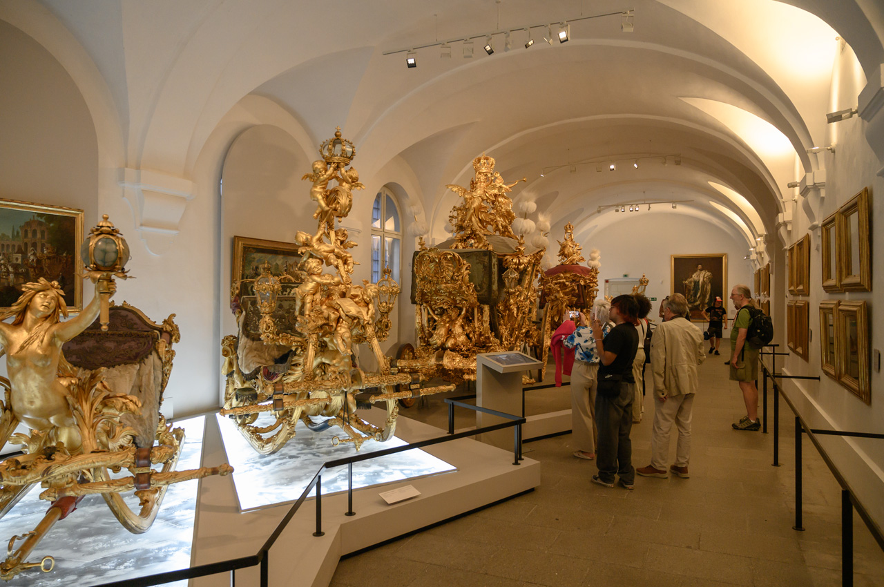 Nun hatten wir nur noch das Marstallmuseum auf unserem Programm. Die Vielzahl an Kutschen hat uns anfänglich überfordert. Wieder dieser überbordende Prunk. Gold, wohin das Auge fällt und nicht nur beschränkt auf die Kutschen, nein auch die Bespannung der Pferde war prunkvoll und kunstvoll. Genauso beeindruckend war auch die Porzellanausstellung im ersten Stockwerk des Gebäudes. Gold ist hier die dominierende Farbe und das dominierende Material.