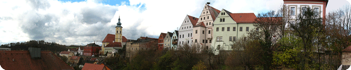 Denkmalschutz-Ensemble Stadtplatz im Charakter des 17. Jahrhunderts. Die Schmalseiten der Häuser mit hohen Giebeln wenden sich zur Straße.
