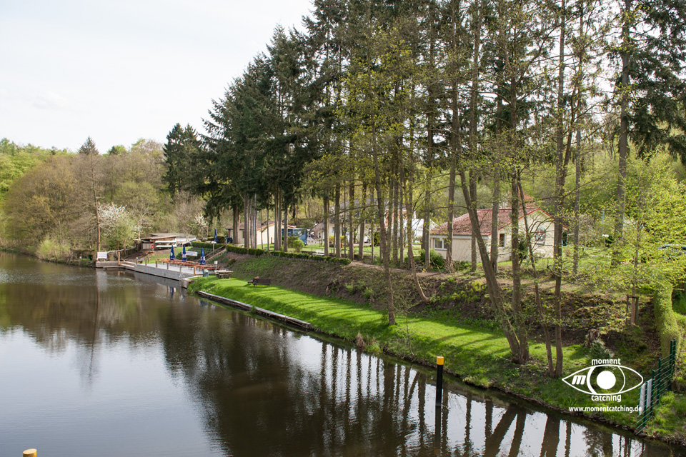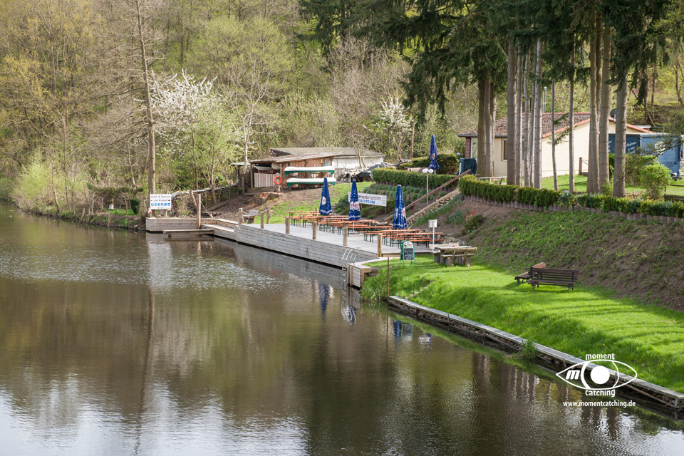 - Man steht auf einer kleinen Wiesenfläche mit Obstbäumen. Das Gelände liegt direkt an der Elde. Es gibt eine Gaststätte mit Sitzplätzen direkt am Wasser, wo auch ein kleiner Bootsanleger ist.