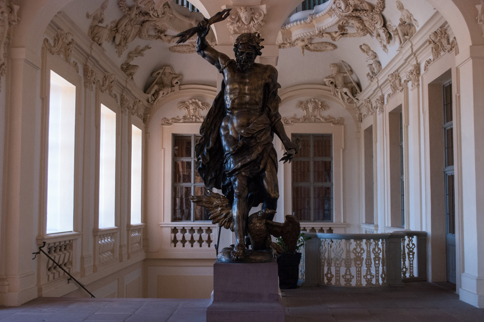Nach dem Aufstieg über zwei beeindruckende Treppen voller Stuckaturen gelangt man in die Beletage. Der größte und schmuckvollste Saal ist hierbei der Ahnensaal, er ist mit einer Vielzahl von Fresken geschmückt und zeigt neben Bildern von Ahnen viele gefangene Osmanen. Diese Fresken und die gefangenen Osmanen sollen jedem Besucher aufzeigen, dass der Markgraf als der siegreiche Feldherr der Christenheit zu sehen ist, der Europa vor den Osmanen bewahrt hat.