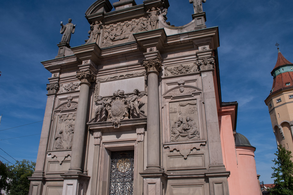Betrachtet man die Front der Kapelle, so sieht man direkt über dem Eingangsportal zwei Putten, die das markgräfliche Wappen tragen. Der von korinthischen Säulen getragene Giebel wird von der auf einer Mondsichel schwebenden Madonna gekrönt. Zu beiden Seiten des Giebels befinden sich zwei Heiligenstatuen. Einer der Heiligen ist der heilige Benedikt von Nursia, der Gründer des Benediktinerordens, der andere Heilige ist der heilige Meinrad, der 835 Einsiedler in der Schweiz war und an dessen Todesstätte das heutige Kloster Einsiedeln zu finden ist.