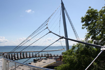 Die 274 m lange Hängebrücke von 2007: Fußgängerverbindung zwischen Stadtzentrum (Bahnhof, Rügen-Galerie, Kurhotel und Hauptstraße) und dem Sassnitzer Hafen. Konstruktion nach Plänen von Schlaich, Bergemann und Partner (Stuttgart); sie wurde mit dem Deutschen Brückenbaupreis 2010 ausgezeichnet.