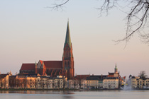 Gegen 12:00 Uhr sind wir dann gestartet. Der Himmel war bedeckt, aber es waren schon wieder 22°C. Es wehte allerdings ein bisschen Wind und dadurch hat man das gar nicht so warm empfunden. Wir sind vom Stellplatz aus direkt zum Nordufer vom Pfaffenteich gelaufen. Erstes interessantes Gebäude ist dort das historische Elektrizitätswerk, was heute das Mecklenburgische Staatstheater beheimatet. Ein sehr interessantes Gebäude. Wenn man bedenkt, dass es mal nur für ein Elektrizitätswerk gebaut wurde. Unmittelbar hinter dem E-Werk betritt man den Schweinemarkt und befindet sich damit in der sogenannten Schelfstadt. Sie wurde bereits am Beginn des Mittelalters als Neustadt bezeichnet und ist geschichtlich damit der jüngste Bereich von Schwerin, aber verfügt heute über den höchsten Bestand an historischen Bürgerhäusern. Mit dem Beginn der DDR-Zeit war dieser Stadtteil dem Verfall preisgegeben. Eine Bürgerinitiative, Architekten, Denkmalpfleger, Fotografen und die Tatsache, dass Ende der 1980er Jahre selbst das Geld für Abbrucharbeiten fehlte, retteten die architektonisch wertvolle Schelfstadt und bewahrten sie vor einem großflächigen Abriss und der Errichtung von Plattenbauten, wie dies zum Beispiel um 1970 auf dem Großen Moor in der Altstadt geschah. Seit der Wende wurde die Schelfstadt grundlegend saniert und 1991 ein Sanierungsgebiet mit 340 Gebäuden und mehr als 1000 Wohnungen ausgewiesen. Wir haben uns heute an dem sehr guten Zustand und an dem romantischen Flair dieser alten Häuser erfreut. Ein Juwel der Schelfstadt ist die Schelfkirche oder auch St. Nikolai. Sie verfügt über ein Querschiff und beherbergt unter dem Chor die Grablege des Mecklenburg-Schweriner Herzoghauses. Bei unserer Anwesenheit gab es einen Gitarrenspieler, der im Chor der Kirche gesungen hat. Hörte sich gar nicht so schlecht an. Nach dem Kirchenbesuch ging es vorbei an dem Neustädtischen Palais zum Dom. Weithin sichtbar ist der Glockenturm. Er ist mit seinen 117,5 m der höchste Kirchturm Ostdeutschlands. Auch das Innere hat viele Besonderheiten zu bieten. Im Umlauf des Chores gibt es mehrere Grablegen. Das Langschiff hat eine Innenhöhe von 26,5 Meter und ist 105 Meter lang. Man kommt sich darin schon etwas verloren vor. Unser Aufenthalt im Dom wurde durch das Klingeln unserer Handys dominiert. Sicherheit Nord wollte uns mitteilen, dass der nächtliche Sicherheitsanruf seit mehreren Tagen ausfällt. Weil sie uns nicht gleich erreicht haben, wurde dann noch Jörg angerufen, der dann wiederum Susanne anrufen wollte. Peinlich, weil der Klingelton durch den ganzen Dom dringt. Wir sind dann hinausgegangen, um das Problem zu klären. Weiter ging es dann zum Markt. Dort dominiert das sogenannte Säulengebäude, eine ehemalige Markthalle. Vom Markt sind wir zurück zum Pfaffenteich. Dieses Mal an das Südufer mit der Fontäne. Auf dem Weg dorthin haben wir uns mit Brötchen und Kuchen versorgt. In einem Fleischerladen haben wir Mett für heute Abend besorgt. Laut Susanne war das, das billigste Mett seit langem. Für über 300 g haben wir unter 3,-€ gezahlt. Bevor wir über den Bahnhofsplatz zurück zum Womo gegangen sind, war ich noch in der Paulskirche. Die war eigentlich nicht geöffnet, da aber gerade jemand sauber gemacht hat, hat er mich eingelassen. Die Kirche hat nichts Aufregendes, außer der komplett aus Holz bestehenden seitlichen Emporen. Susanne hat sich diese Kirche erspart. Der Zugang war mit Treppen verbunden, da die Kirche auf einer kleinen Anhöhe liegt. Im Womo angekommen, war es Zeit für unseren Nachmittagskaffee, der gleichzeitig auch der letzte im Womo auf dieser Tour war.
