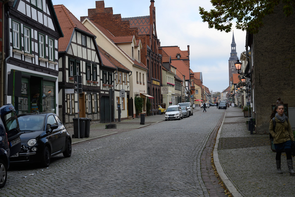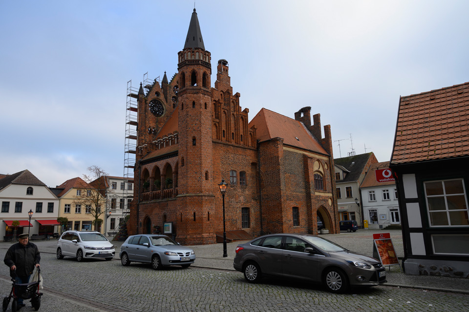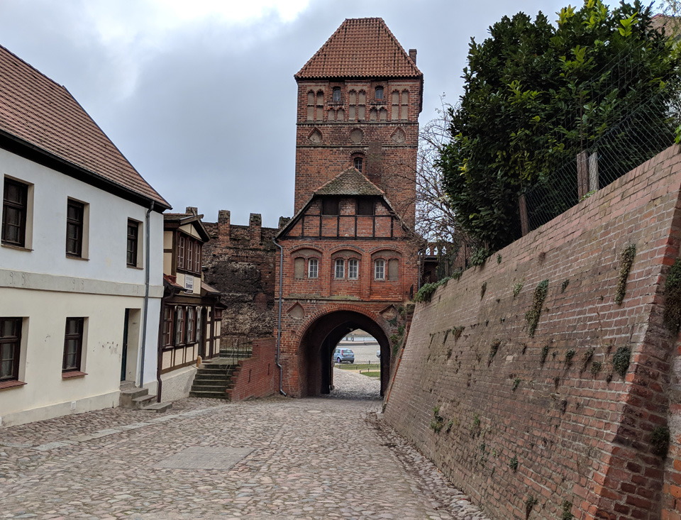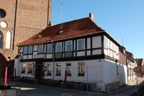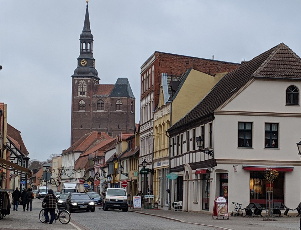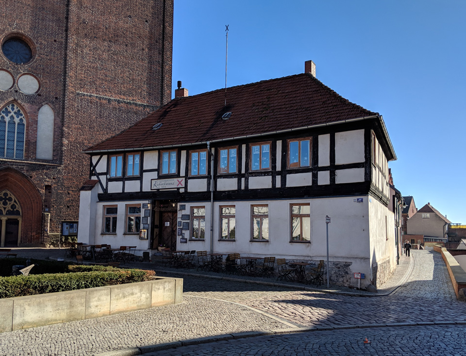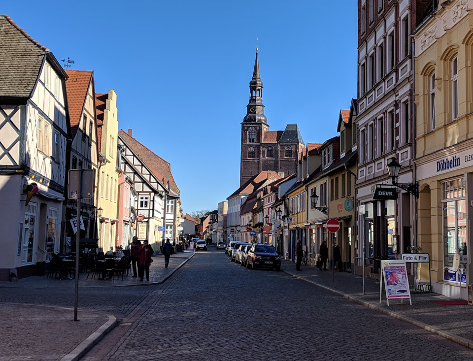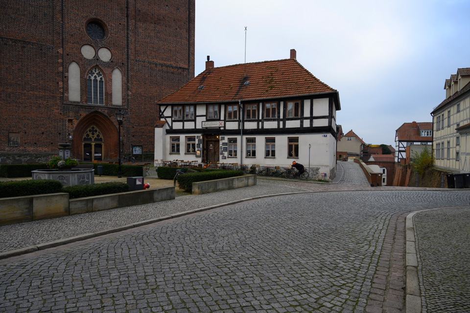Durch das Neustädter Tor, vorbei an der ehemaligen St. Nikolai Kirche sind wir in die Lange Straße, die eigentliche Ladenstraße eingeschwenkt. Wir sind immer wieder begeistert von den schönen, historischen Gebäuden rechts und links dieser Straße. Vorbei am historischen Rathaus, was mal wieder eingerüstet ist, sind wir fast bis zum Eulenturm (Hünerdorfer Tor) gelaufen. Ca. 100 Meter davor haben wir die Konditorei Stehwien entdeckt. Hier ist der Werkverkauf ihrer Produkte, die in der Zwischenzeit fabrikmäßig produziert werden. Für uns sehr nachteilig, man konnte die meisten Produkte verkosten. Das führte wieder zielsicher zu einem exzessiven Einkauf. Mit einem gut gefüllten Einkaufsbeutel haben wir den Laden wieder verlassen. Unseren Spaziergang haben wir über die Schäferstraße, in Richtung alte Stadtmauer fortgesetzt. Man läuft in der abgehenden Langer Straße wieder vorbei an kleinen, liebevoll gepflegten Fachwerkhäusern. Man hat den Eindruck, hier ist vor mehr als 200 Jahren die Zeit stehen geblieben. Wir genießen den Anblick und bleiben vor so manchem Haus stehen und bewundern die Handwerkskunst, die diese kleinen Häuser hat entstehen lassen. Wir sind zurück in die Lange Straße zum Altmärker, gegenüber dem Rathaus. Hier haben wir uns mit Wurst versorgt. Wir essen die Produkte der Altmärker Fleischerei sehr gerne, sie sind sehr deftig gewürzt. Von hier aus ging es dann aber zielstrebig zurück zu unserem Womo.