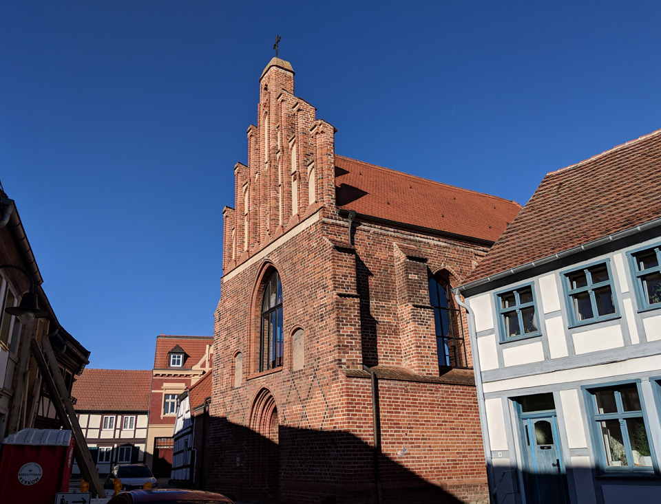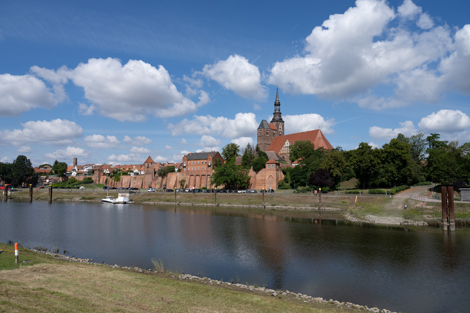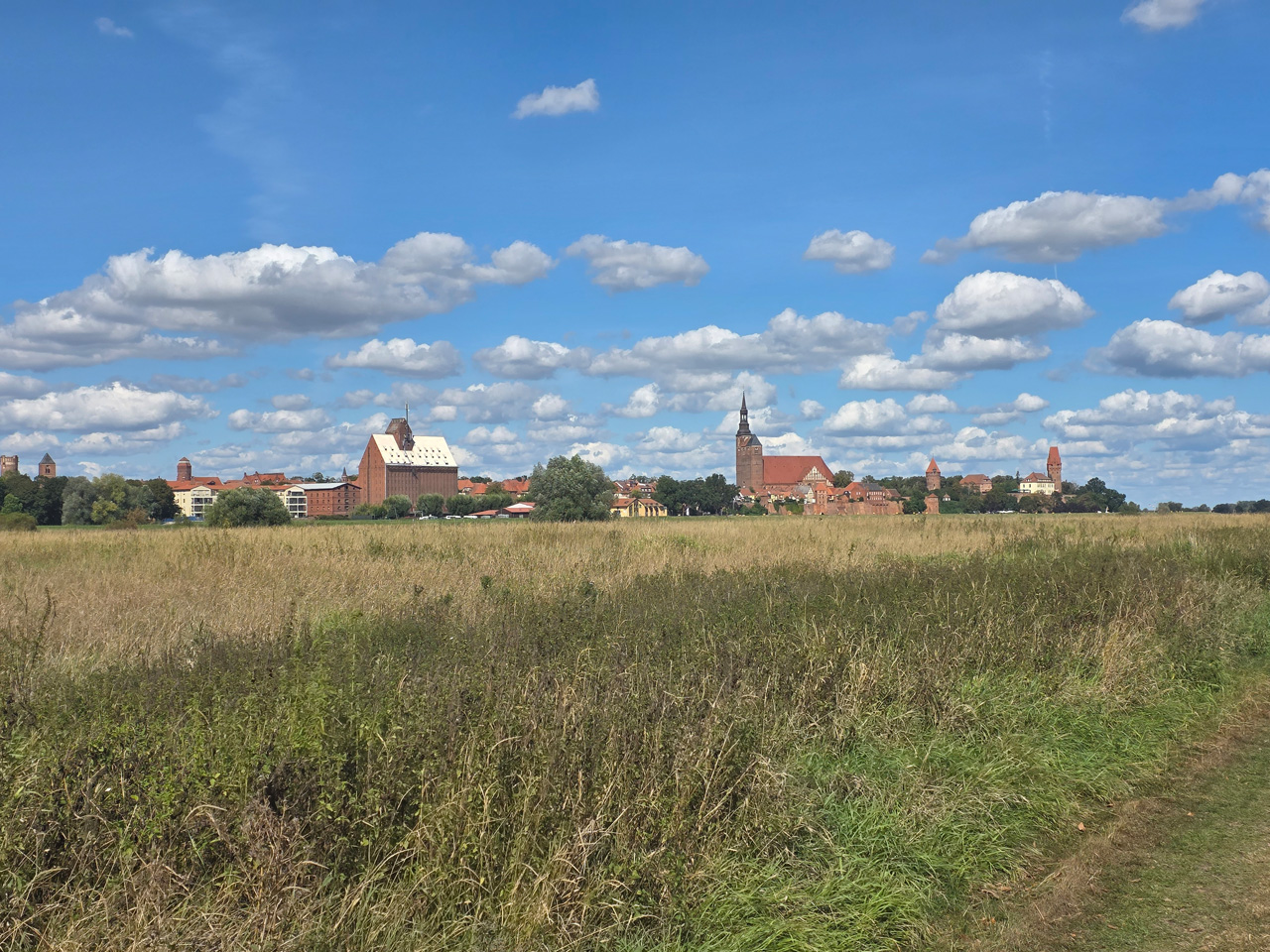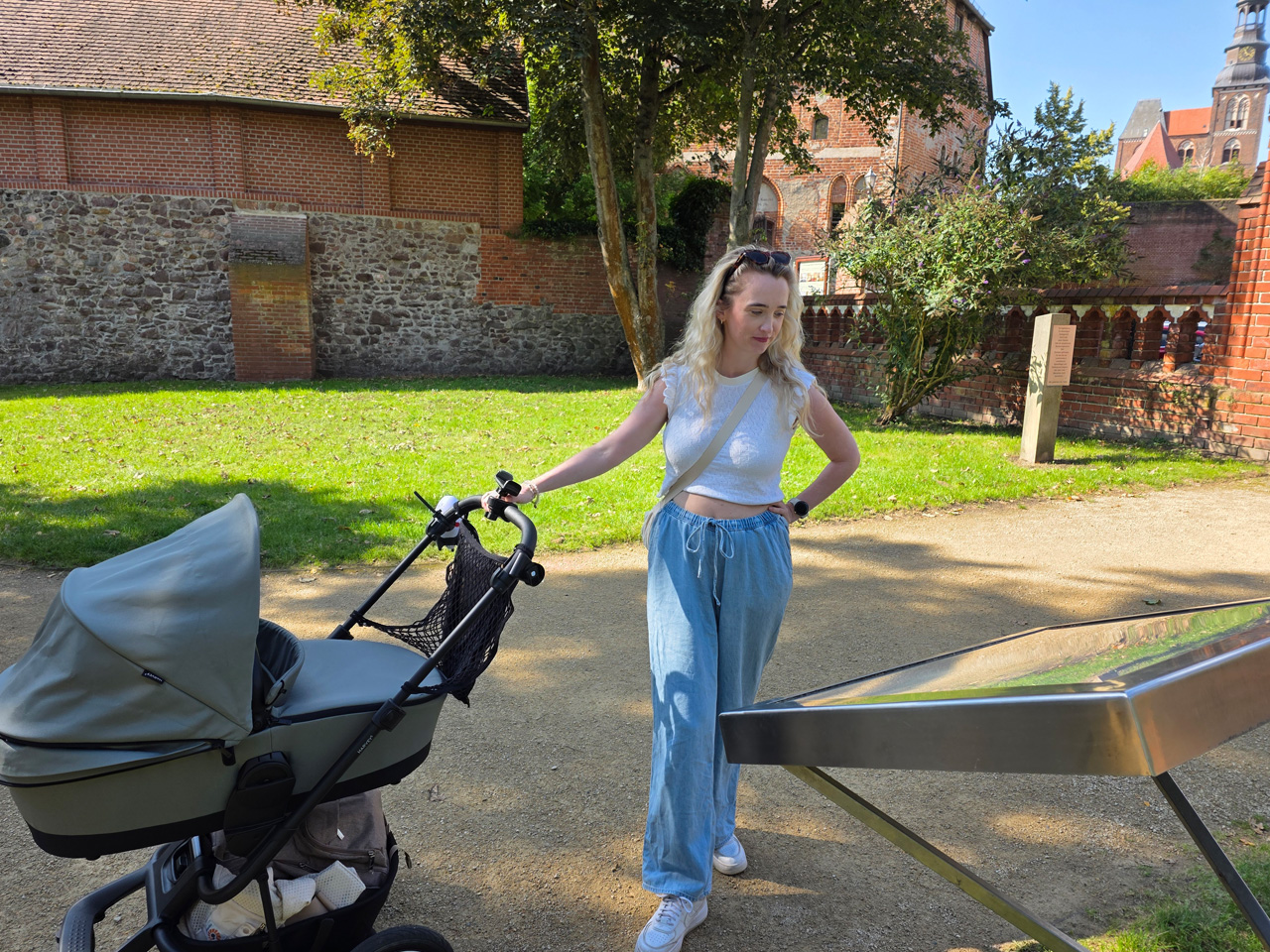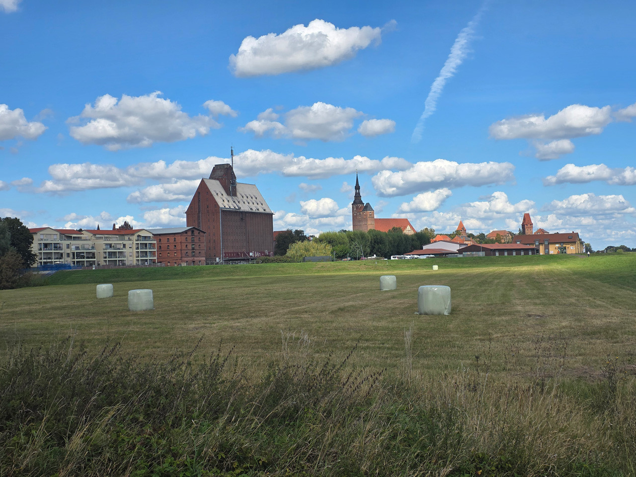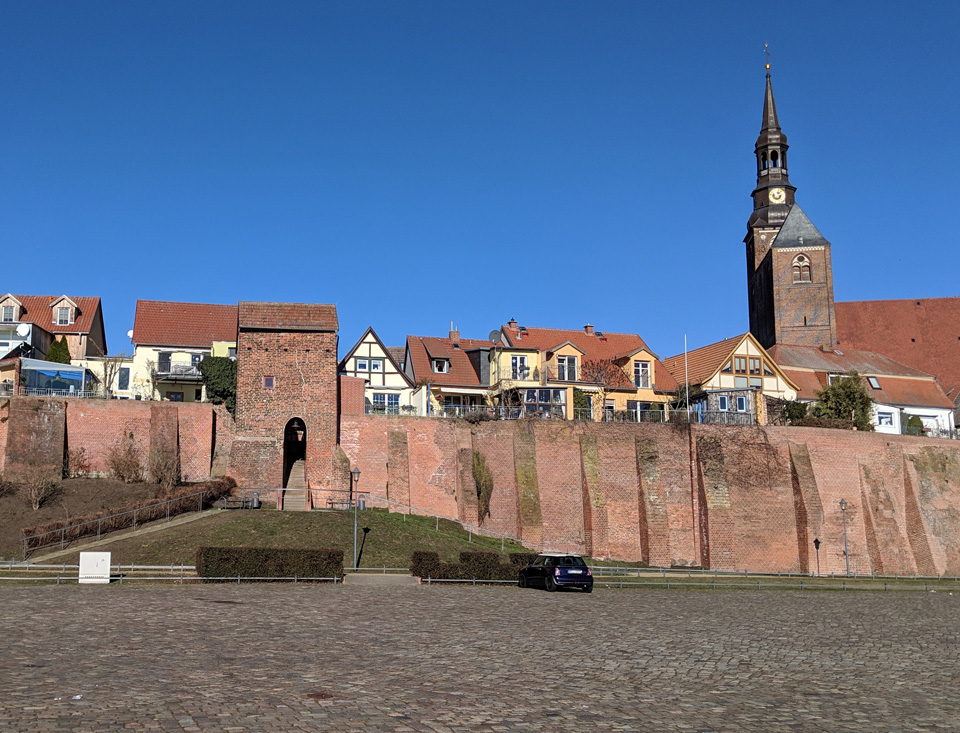 Gegen 11:15 Uhr sind Vivien u. Mario mit Jonah eingetroffen. Da sie erst ab 15:00 Uhr in ihre Hütte können, waren wir erst bei uns im Womo. Jonah fasziniert uns immer mehr durch seine wachsende Aufmerksamkeit. Man hat zunehmend das Gefühl, dass er uns regelrecht fixiert und beobachtet. Mit Grimassen und Geräuschen lässt er sich sehr schnell zum Lachen bringen. Gegen 13:00 Uhr sind wir zu einem Spaziergang aufgebrochen. Wir sind die Hafenpromenade entlang gelaufen und haben die wuchtige Stadtmauer bewundert und das Schloss von der Wasserseite. Unterwegs gab es eine kleine Pause, Jonah hatte wieder Hunger und wollte an die Milchbar. Wir sind über den Zollenstieg wieder hoch zu der Hünerdorfer Straße gelaufen, vorbei an der Salzkirche. Sie war zwar offen, sie beherbergt aber auch nur noch eine Ausstellung. In der Hünerdorfer Straße stehen besonders viele Häuser mit mehr als 200 Jahren auf dem Puckel, die fast alle liebevoll restauriert wurden und sich wieder in altem Glanz zeigen. Man entdeckt an vielen Details an diesen Häusern den hohen Grad an handwerklichem Können, was schon damals an den Tag gelegt wurde. Der Eulenturm ist schon verwaist. Die Störche haben Deutschland bereits verlassen. Am Rathausplatz haben wir ein Eis gegessen. Beim Schlemmen konnten wir die faszinierende Rathausfassade bewundern. Sie ist eine Schaufassade, komplett aus Backsteinen gemauert, die mit ihren 24 Metern Höhe den Rest des Gebäudes komplett überragt. Nach dem Eisessen ging es schräg rüber zum Altmärker. Hier konnten sich Vivien und Mario Wurst für die anstehenden Frühstücke aussuchen. Vorbei und durch das Neustädter Tor ging es wieder zurück zum Womo. Susanne konnte nun den Checkin für die beiden machen und sie konnten danach ihr Iglu in Beschlag nehmen.