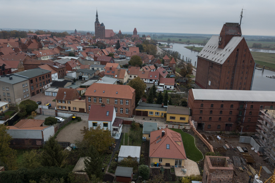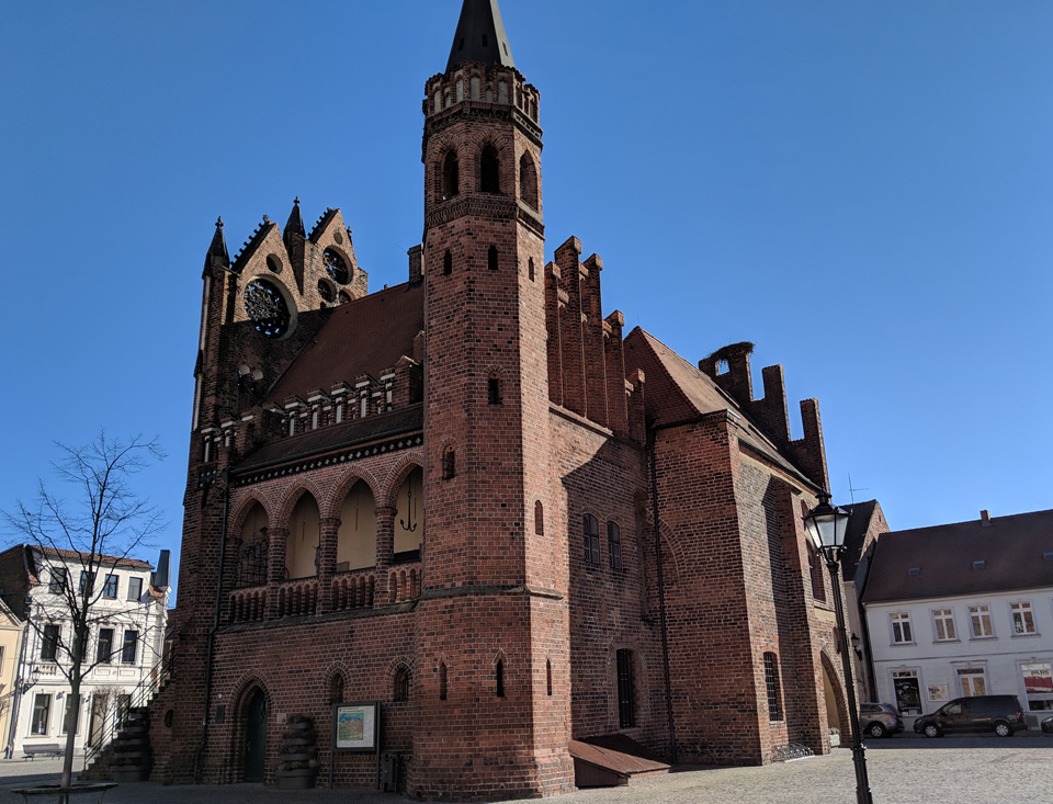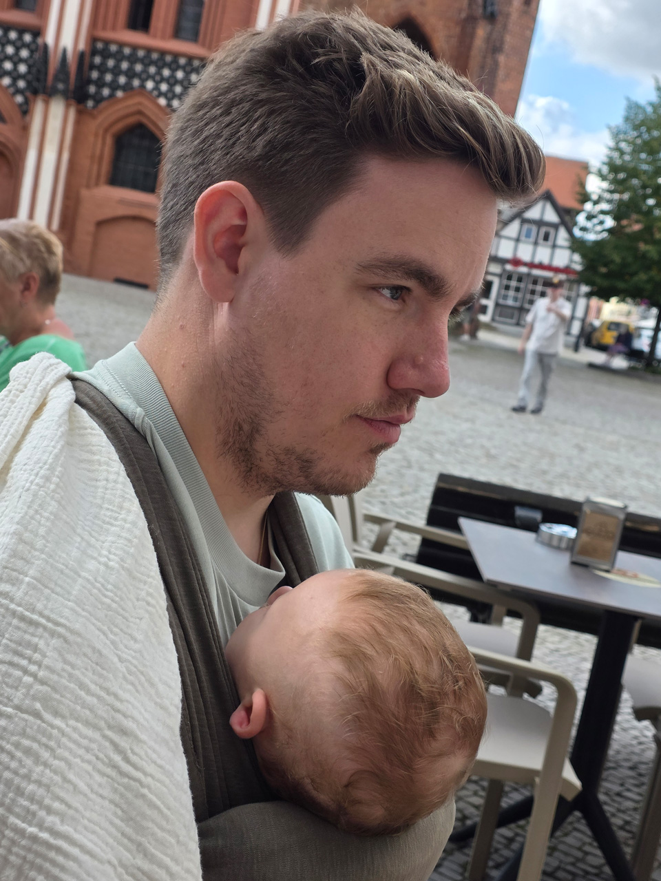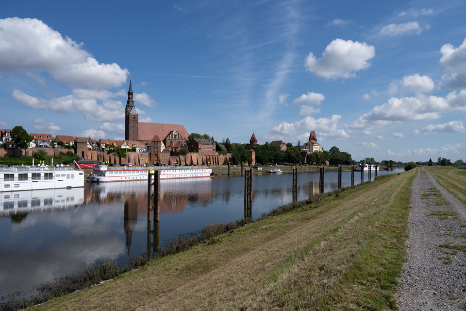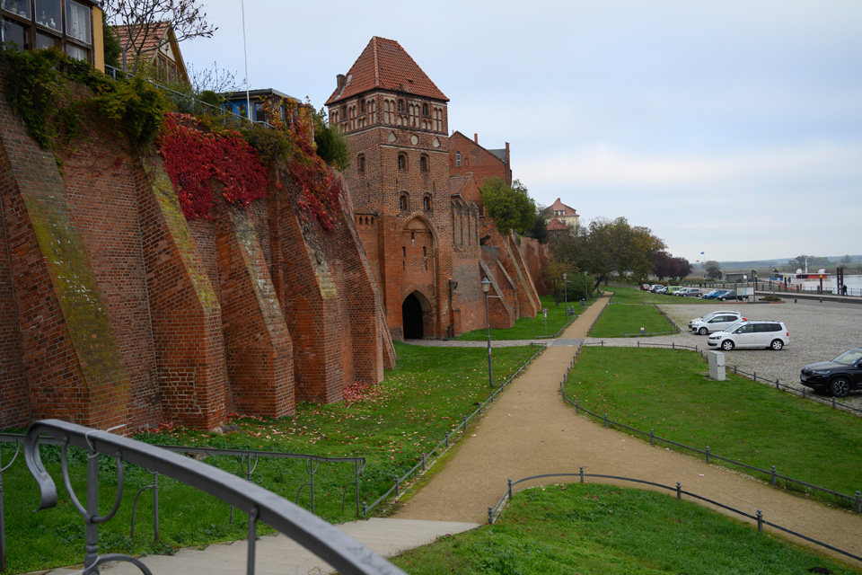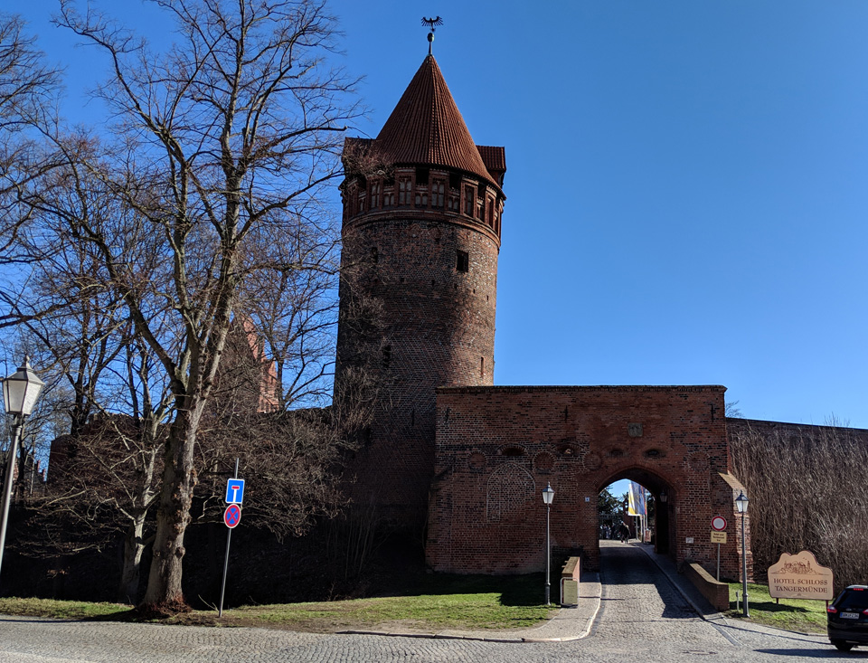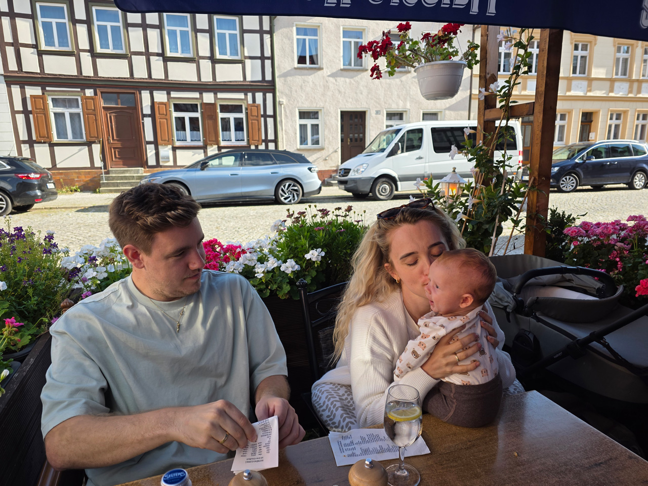 Gegen 11:15 Uhr sind Vivien u. Mario mit Jonah eingetroffen. Da sie erst ab 15:00 Uhr in ihre Hütte können, waren wir erst bei uns im Womo. Jonah fasziniert uns immer mehr durch seine wachsende Aufmerksamkeit. Man hat zunehmend das Gefühl, dass er uns regelrecht fixiert und beobachtet. Mit Grimassen und Geräuschen lässt er sich sehr schnell zum Lachen bringen. Gegen 13:00 Uhr sind wir zu einem Spaziergang aufgebrochen. Wir sind die Hafenpromenade entlang gelaufen und haben die wuchtige Stadtmauer bewundert und das Schloss von der Wasserseite. Unterwegs gab es eine kleine Pause, Jonah hatte wieder Hunger und wollte an die Milchbar. Wir sind über den Zollenstieg wieder hoch zu der Hünerdorfer Straße gelaufen, vorbei an der Salzkirche. Sie war zwar offen, sie beherbergt aber auch nur noch eine Ausstellung. In der Hünerdorfer Straße stehen besonders viele Häuser mit mehr als 200 Jahren auf dem Puckel, die fast alle liebevoll restauriert wurden und sich wieder in altem Glanz zeigen. Man entdeckt an vielen Details an diesen Häusern den hohen Grad an handwerklichem Können, was schon damals an den Tag gelegt wurde. Der Eulenturm ist schon verwaist. Die Störche haben Deutschland bereits verlassen. Am Rathausplatz haben wir ein Eis gegessen. Beim Schlemmen konnten wir die faszinierende Rathausfassade bewundern. Sie ist eine Schaufassade, komplett aus Backsteinen gemauert, die mit ihren 24 Metern Höhe den Rest des Gebäudes komplett überragt. Nach dem Eisessen ging es schräg rüber zum Altmärker. Hier konnten sich Vivien und Mario Wurst für die anstehenden Frühstücke aussuchen. Vorbei und durch das Neustädter Tor ging es wieder zurück zum Womo. Susanne konnte nun den Checkin für die beiden machen und sie konnten danach ihr Iglu in Beschlag nehmen.