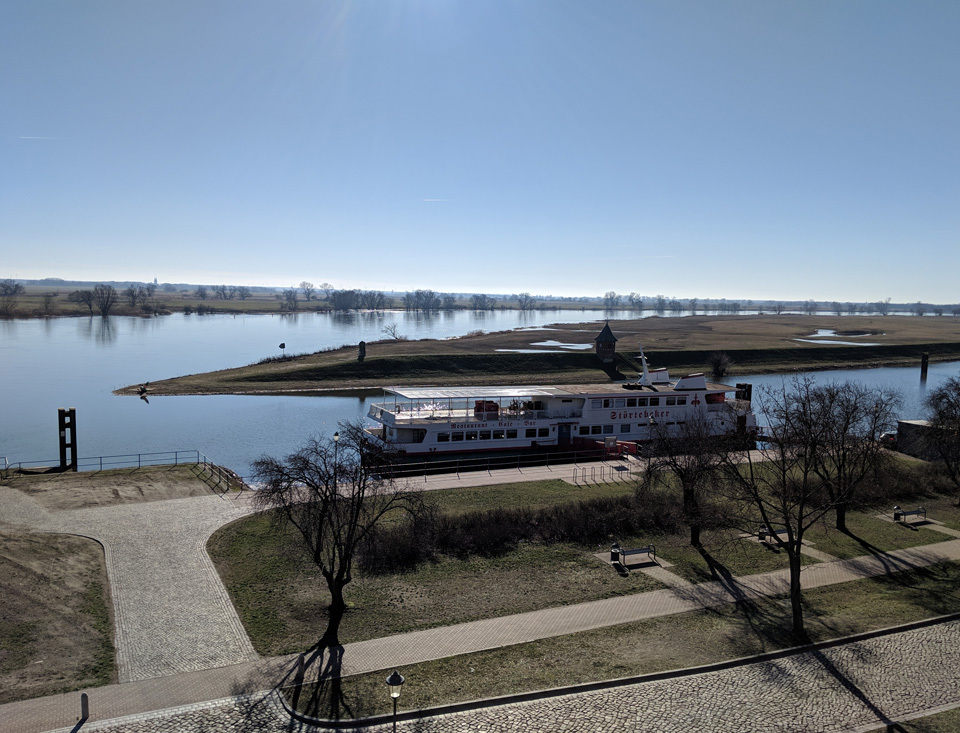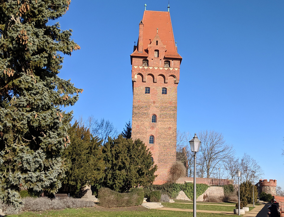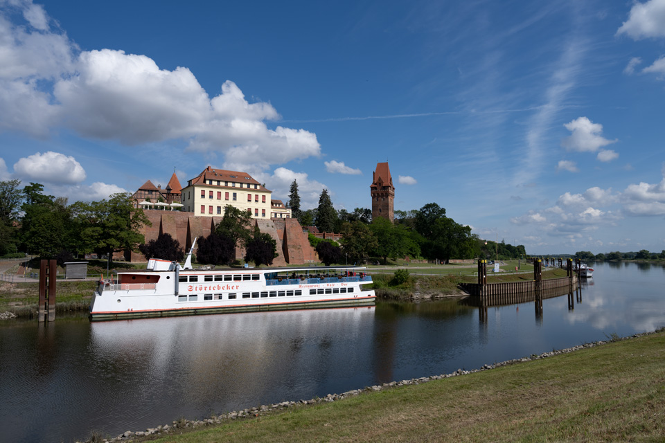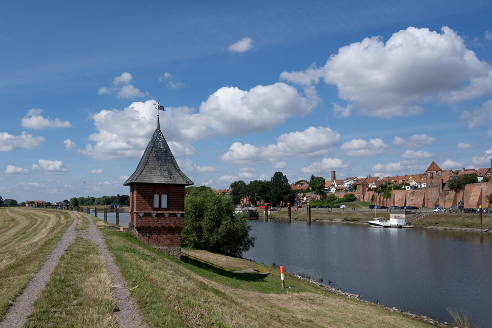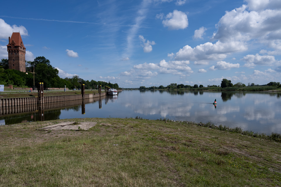 Wir sind zu einem weiteren Spaziergang durch Tangermünde aufgebrochen. Dieses Mal sind wir durch das Neustädter Tor in die Altstadt eingetaucht. Von dem Torhaus war Vivien-Sara besonders beeindruckt. Wir sind die Kirchstraße entlanggelaufen und haben wieder die vielen historischen Häuser bestaunt. Die alte Schule, heute eine Gaststätte war leider geschlossen. Schade, dass hätten wir den beiden gerne gezeigt. Leider war auch die Kirche St. Stephan verschlossen. Wir sind weiter zum Schloss gelaufen. Das Schloss ist heute eine Hotelanlage. Frei zugänglich ist die Brüstung zur Stadtmauer. Von hier hat man eine herrliche Aussicht über die Elbe und die Elbauenlandschaft. Der Park mit dem Denkmal Friedrich I haben wir durchwandert und auch von hier hat man eine gute Aussicht über die Elbe. Der Kapitalturm hier ist der wuchtigste Turm der ehemaligen Stadtbefestigung. Er ist mit einer Führung zu besichtigen. Wir sind zurück zum Eulenturm und von dem aus in den Hof der kleinen Privatbrauerei mit einem angeschlossenen Museum namens Zeitreise. War nicht interessant. Wir sind wieder zurück in die Lange Straße, die Hauptgeschäftsstraße. Hier hat Vivien Geschäfte gefunden, in denen sie fündig wurde. Susanne hat für Jonah einen niedlichen Bademantel gefunden. Am Rathausplatz hat es wieder ein leckeres Eis gegeben. In der Zecherei St. Nikolai haben wir zwei Flaschen Kuhschwanzbier gekauft. Mario wollte das unbedingt Mal kosten. Wir sind zurück zum Womo und haben es uns vor dem Womo gemütlich gemacht. Das Wetter war herrlich die Sonne schien bei 21°C auf uns herab. Wir haben die Markise ausgefahren.
