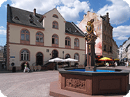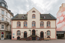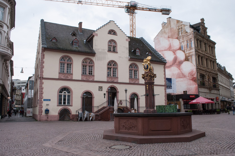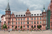 09.09.2019: Dieses Gebäude ist durch die vielen Verziehrungen und dem roten Sandstein am Marktplatz sehr dominant. Es vermittelt mehr Prunk als das dahinterliegende Schloss.