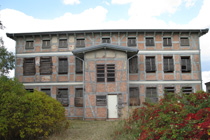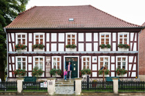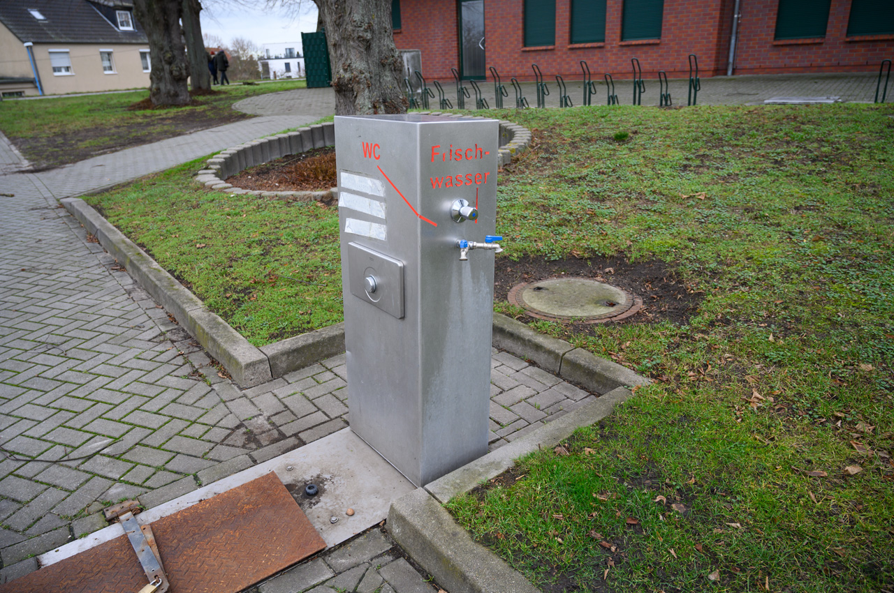 - Die V+E befindet sich hinter der Gaststätte. Es ist ein Eigenbau. Der Bodeneinlass für Grauwasser und Fäkalien ist mit einer Klappe abgedeckt. Die Säule hat einen Wasseranschluss.